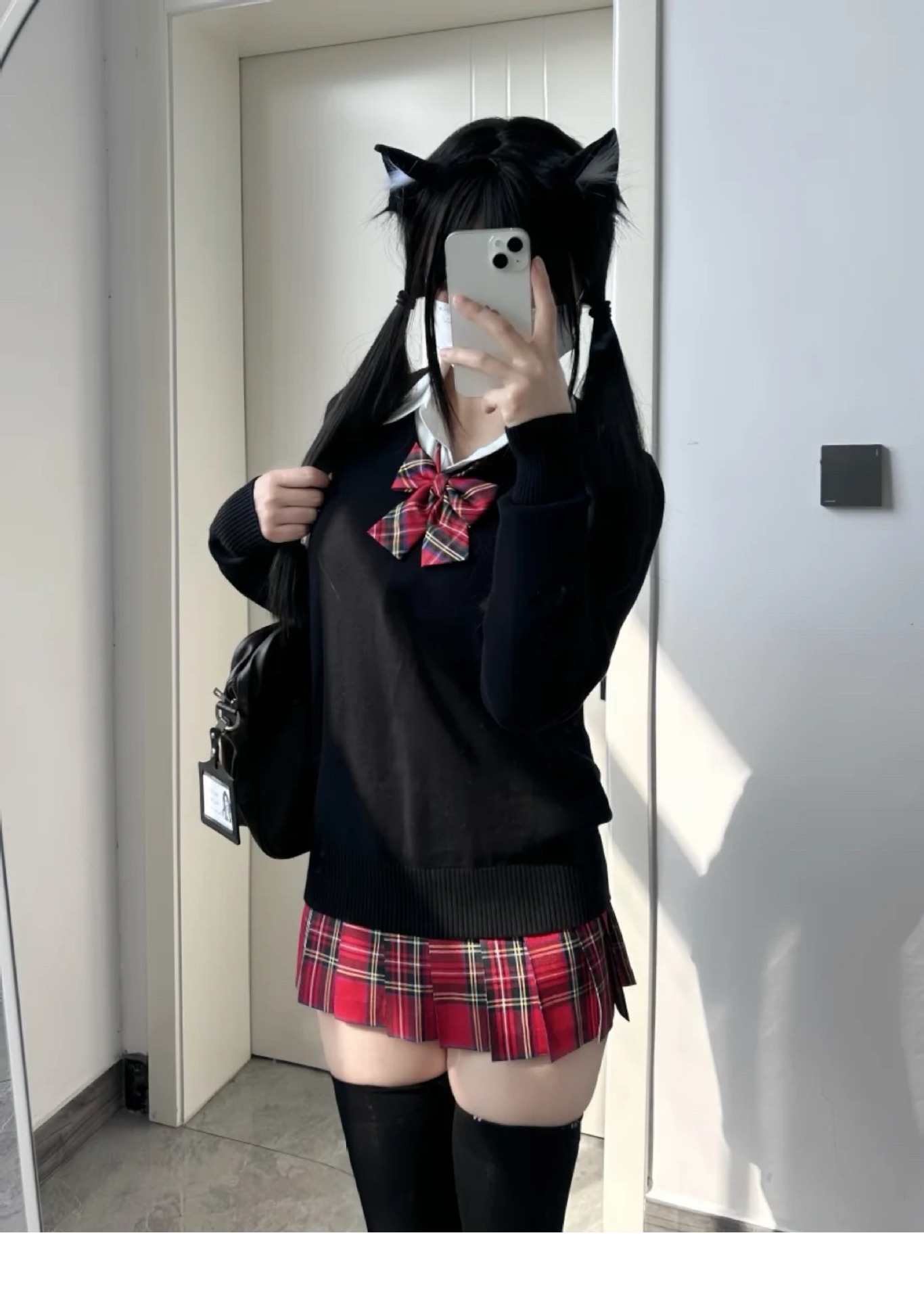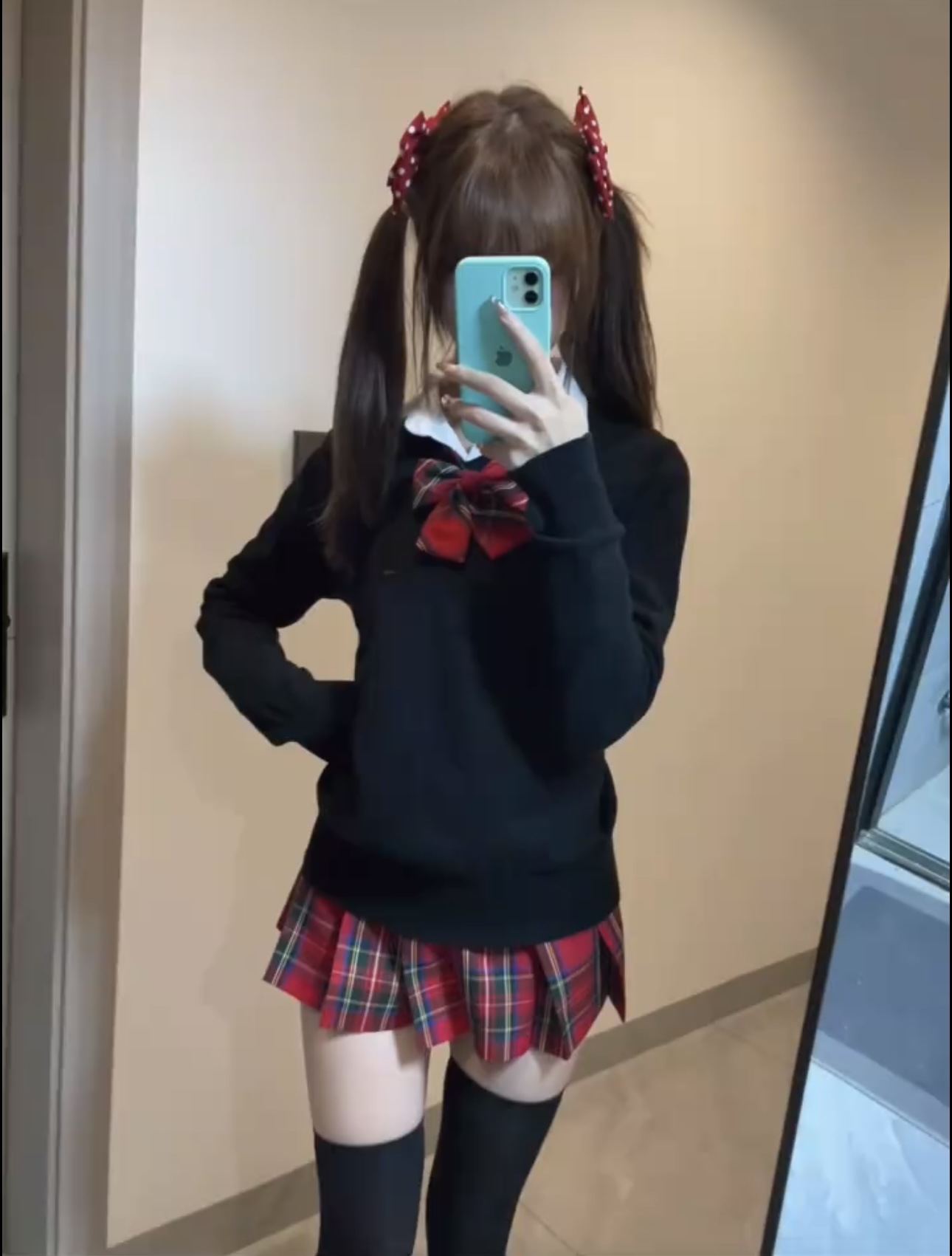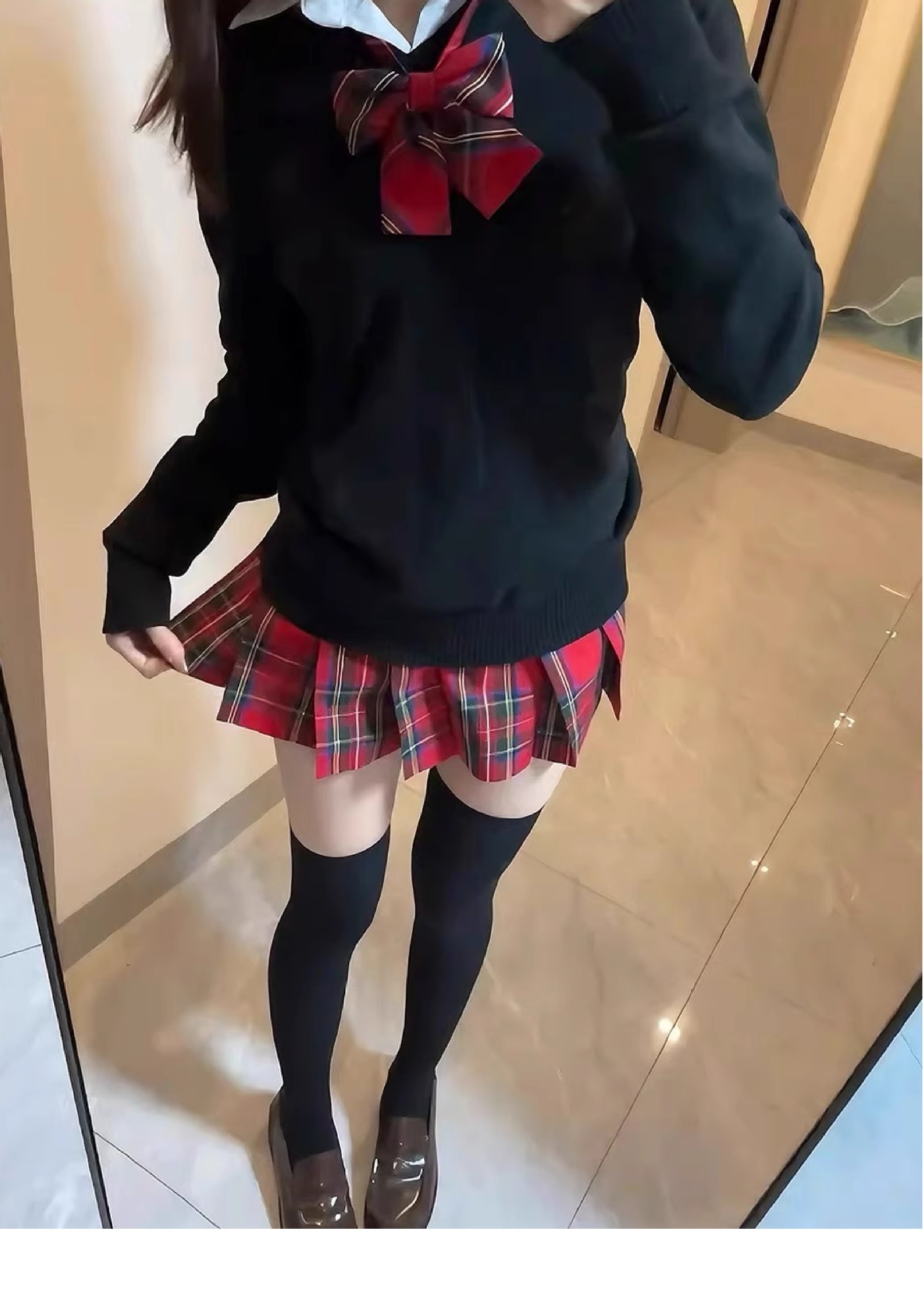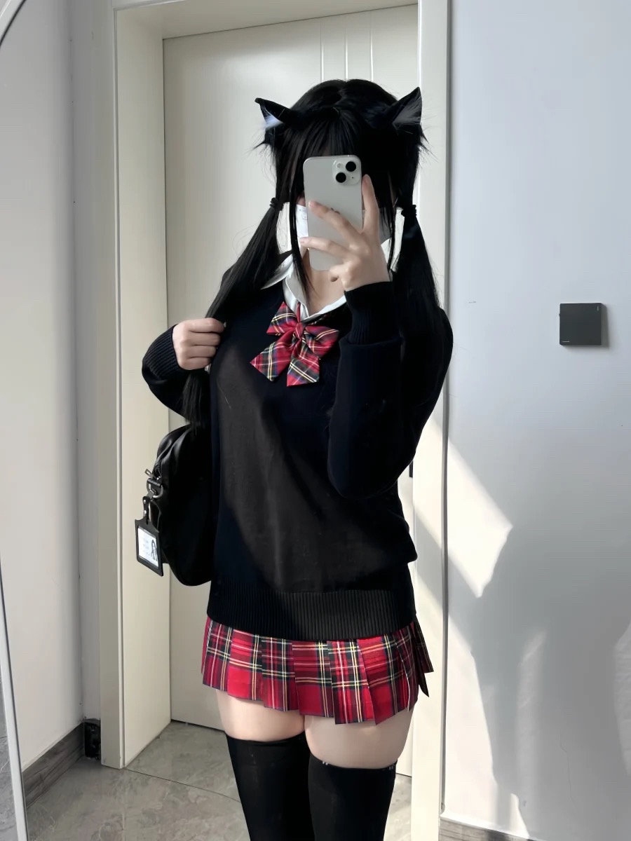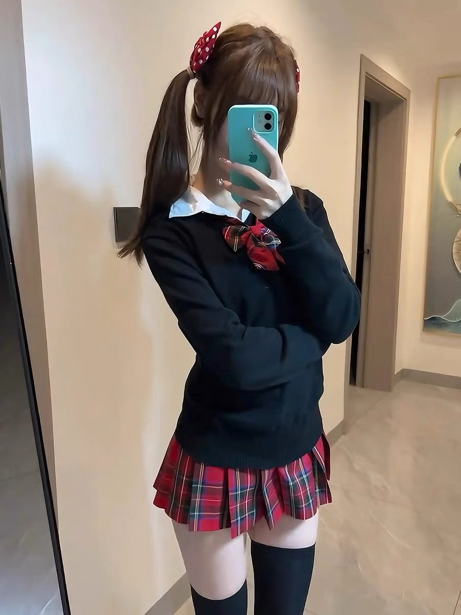 Одинарная красная клетчатая юбка без галстука-бабочки.; Одинарная красная клетчатая юбка + тот же клетчатый галстук-бабочка; Цельная рубашка с длинными рукавами.