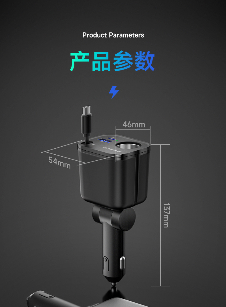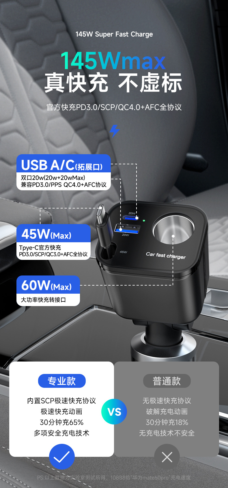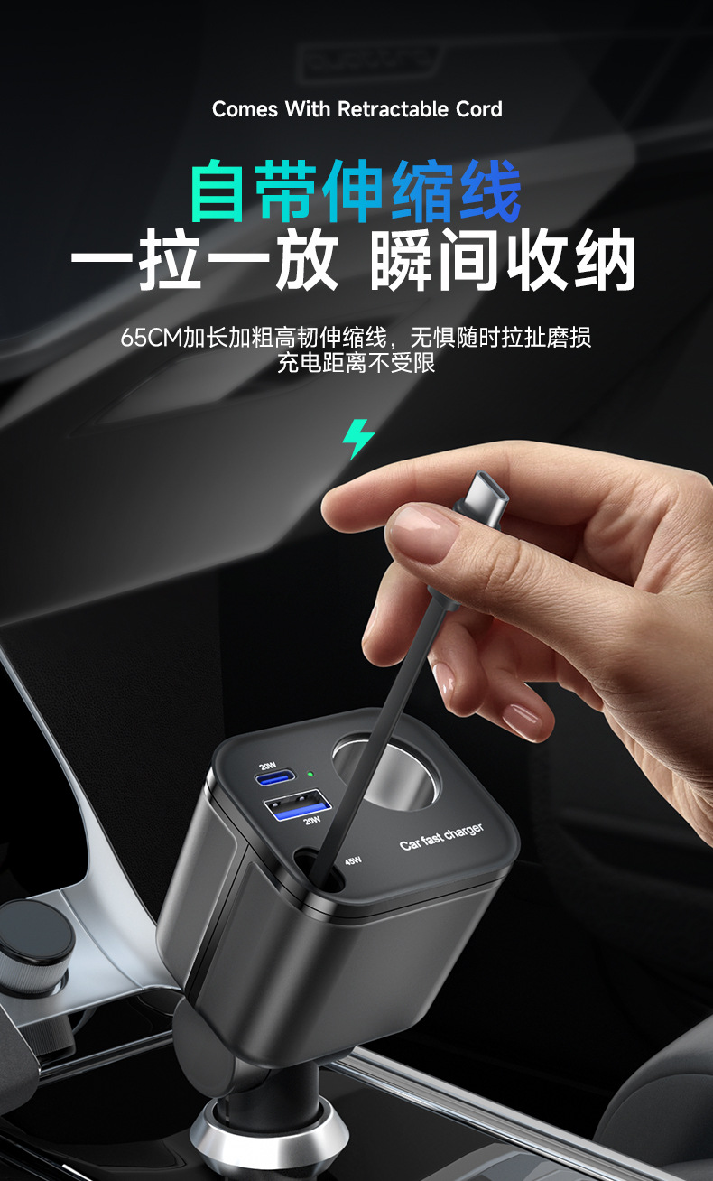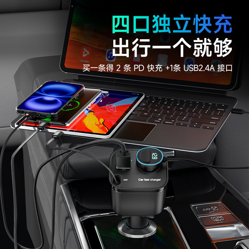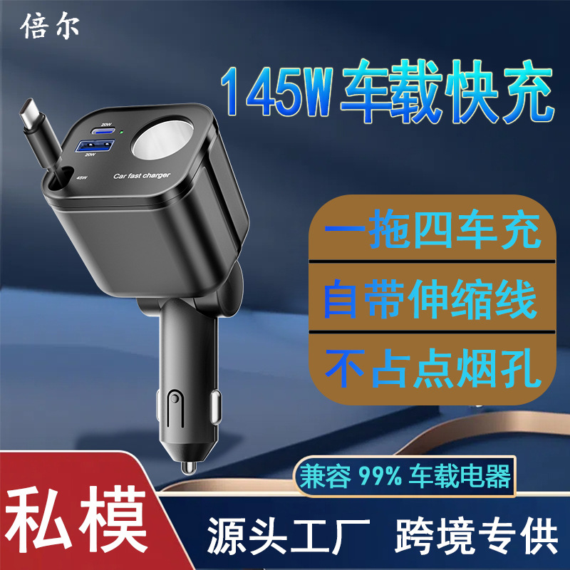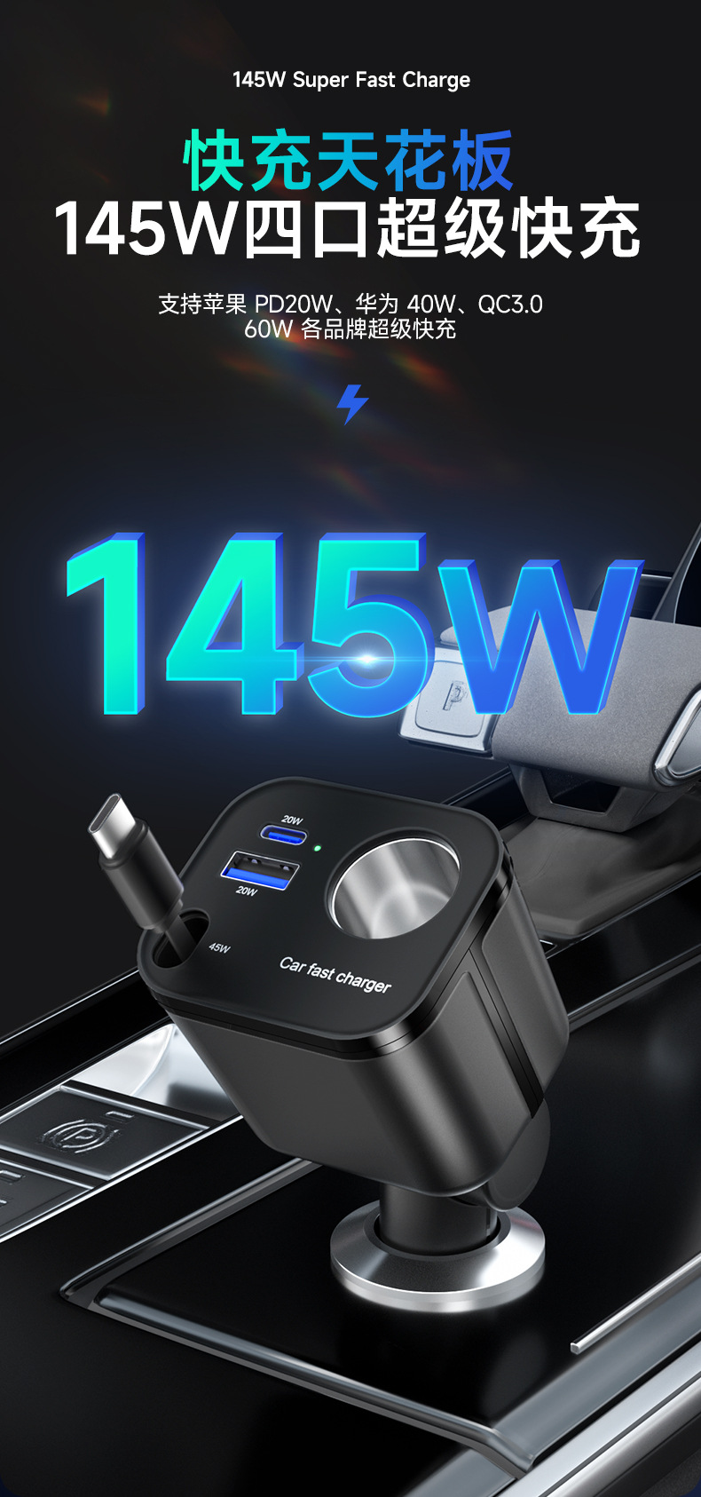 Автомобильное зарядное устройство с выдвижным кабелем, быстрая зарядка, 145 Вт, 4-в-1, с разъемом прикуривателя, быстрая зарядка PD с цифровым дисплеем