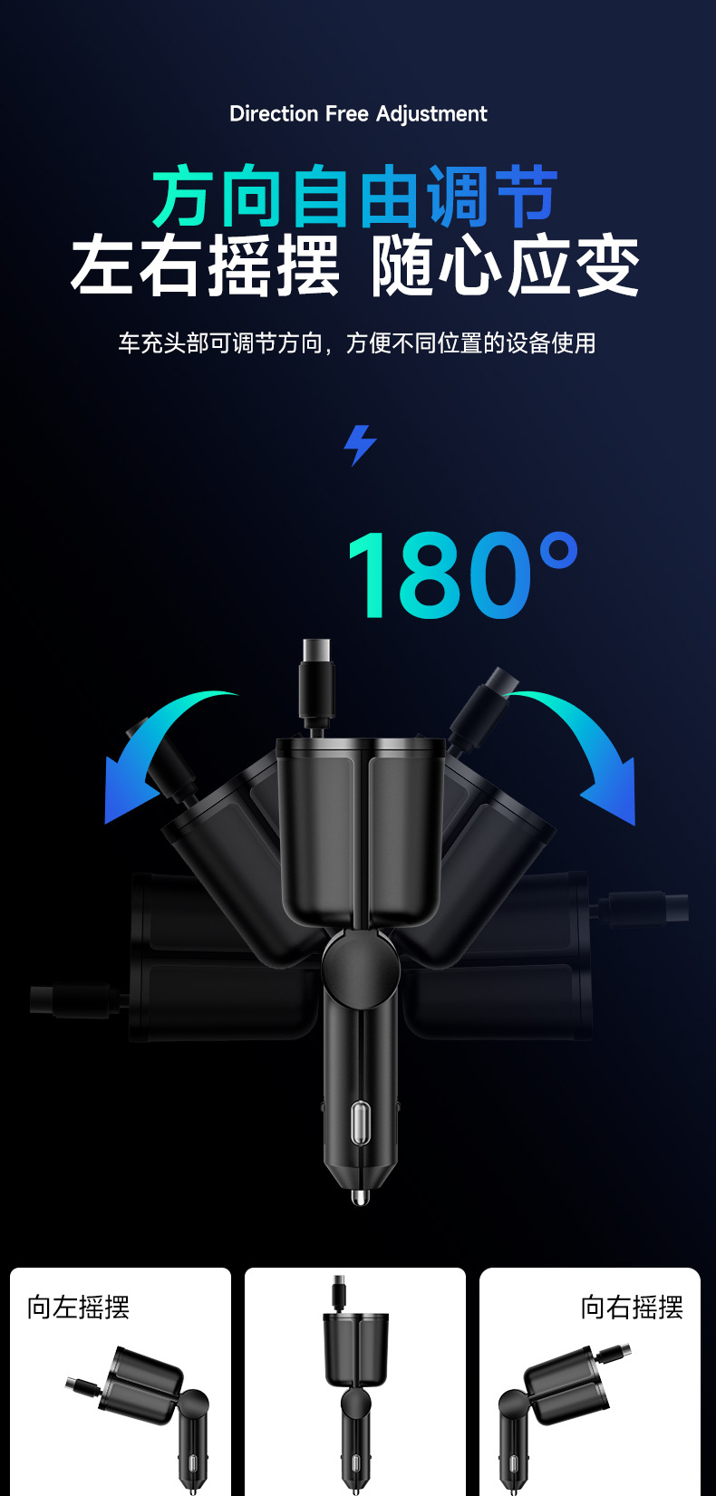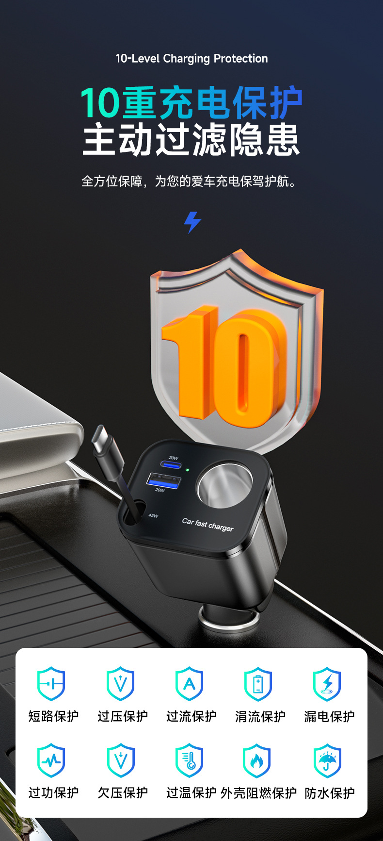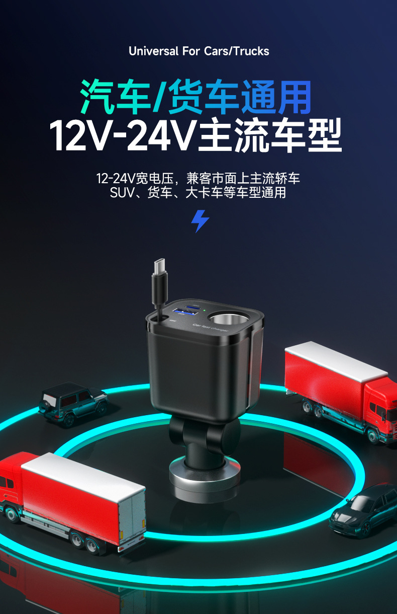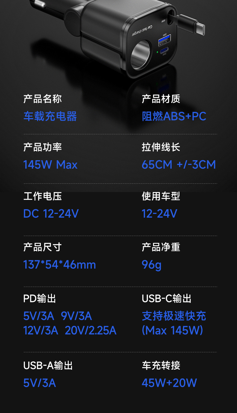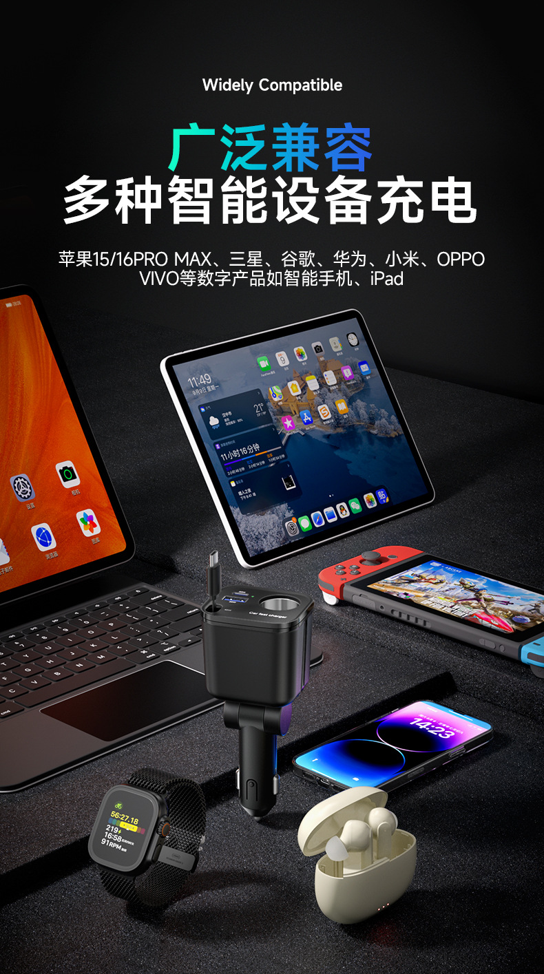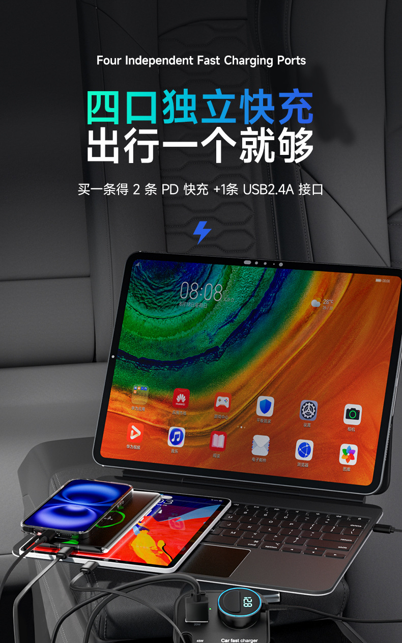 Автомобильное зарядное устройство с выдвижным кабелем, быстрая зарядка, 145 Вт, 4-в-1, с разъемом прикуривателя, быстрая зарядка PD с цифровым дисплеем