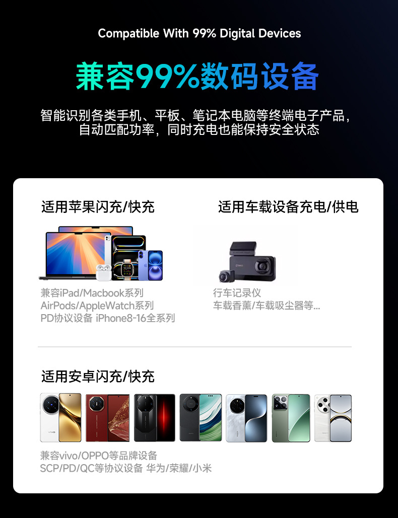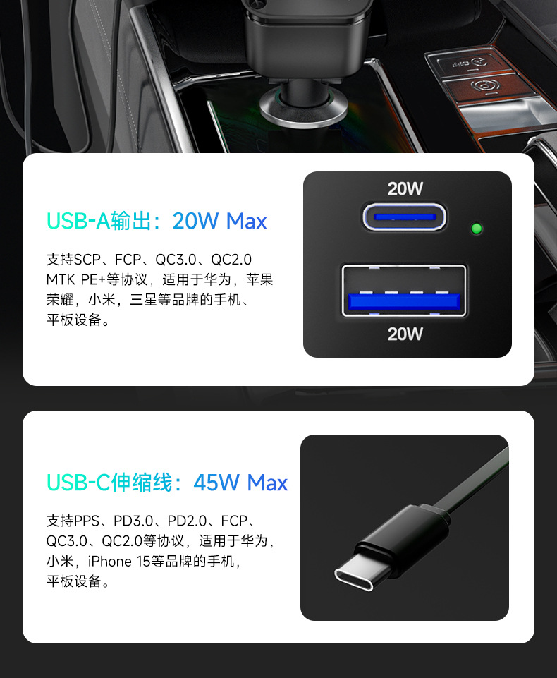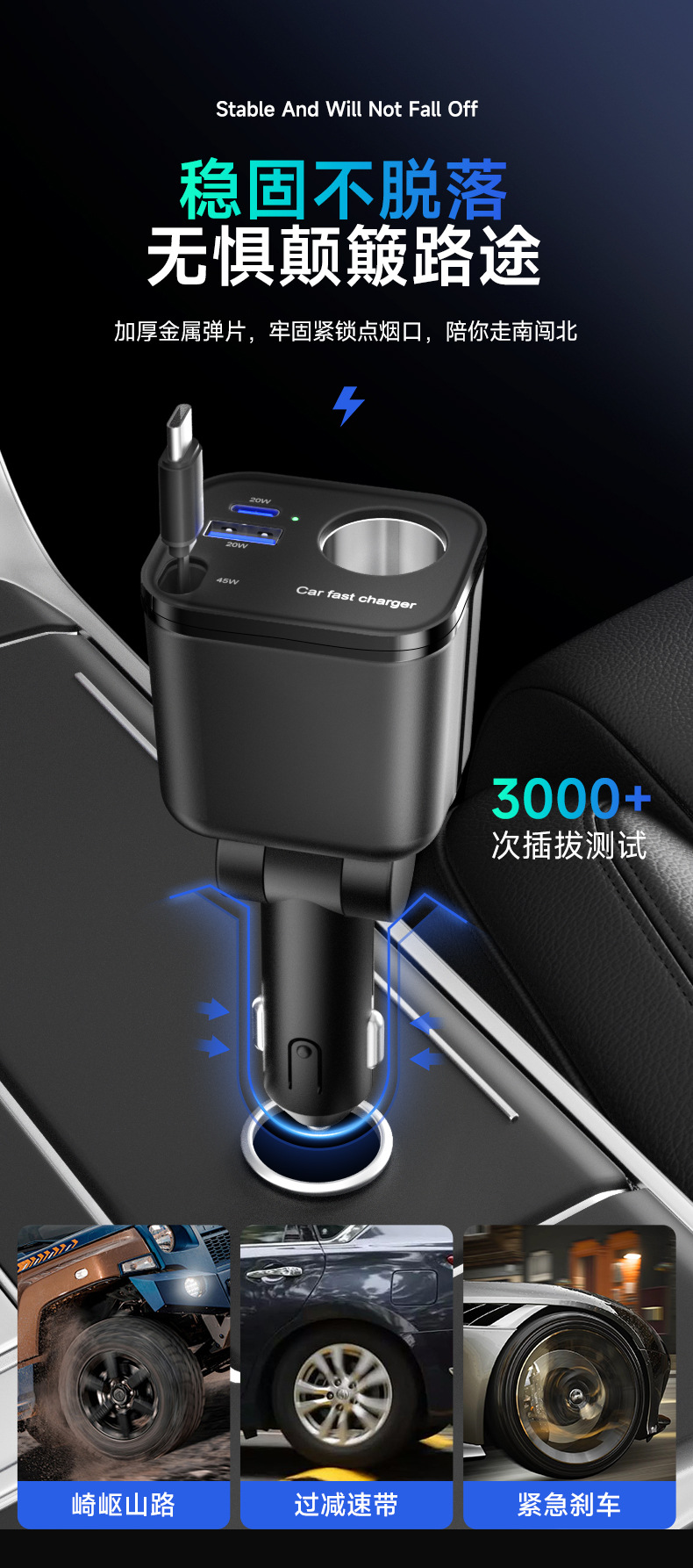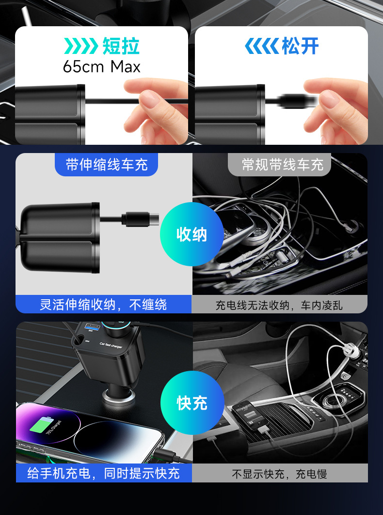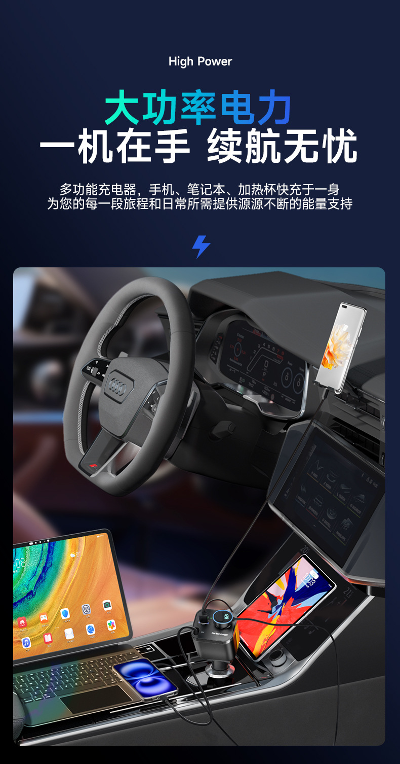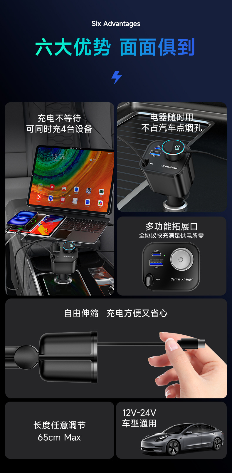 Автомобильное зарядное устройство с выдвижным кабелем, быстрая зарядка, 145 Вт, 4-в-1, с разъемом прикуривателя, быстрая зарядка PD с цифровым дисплеем