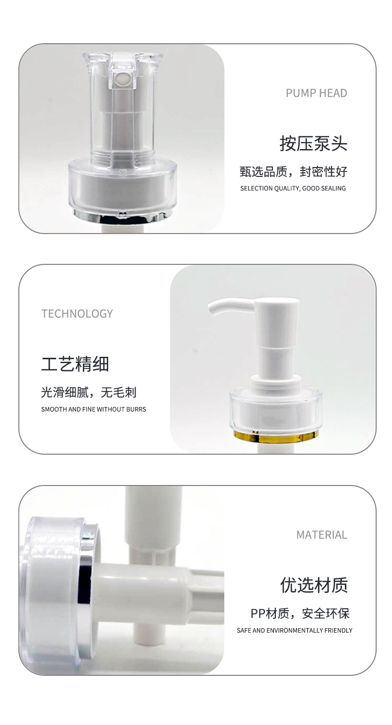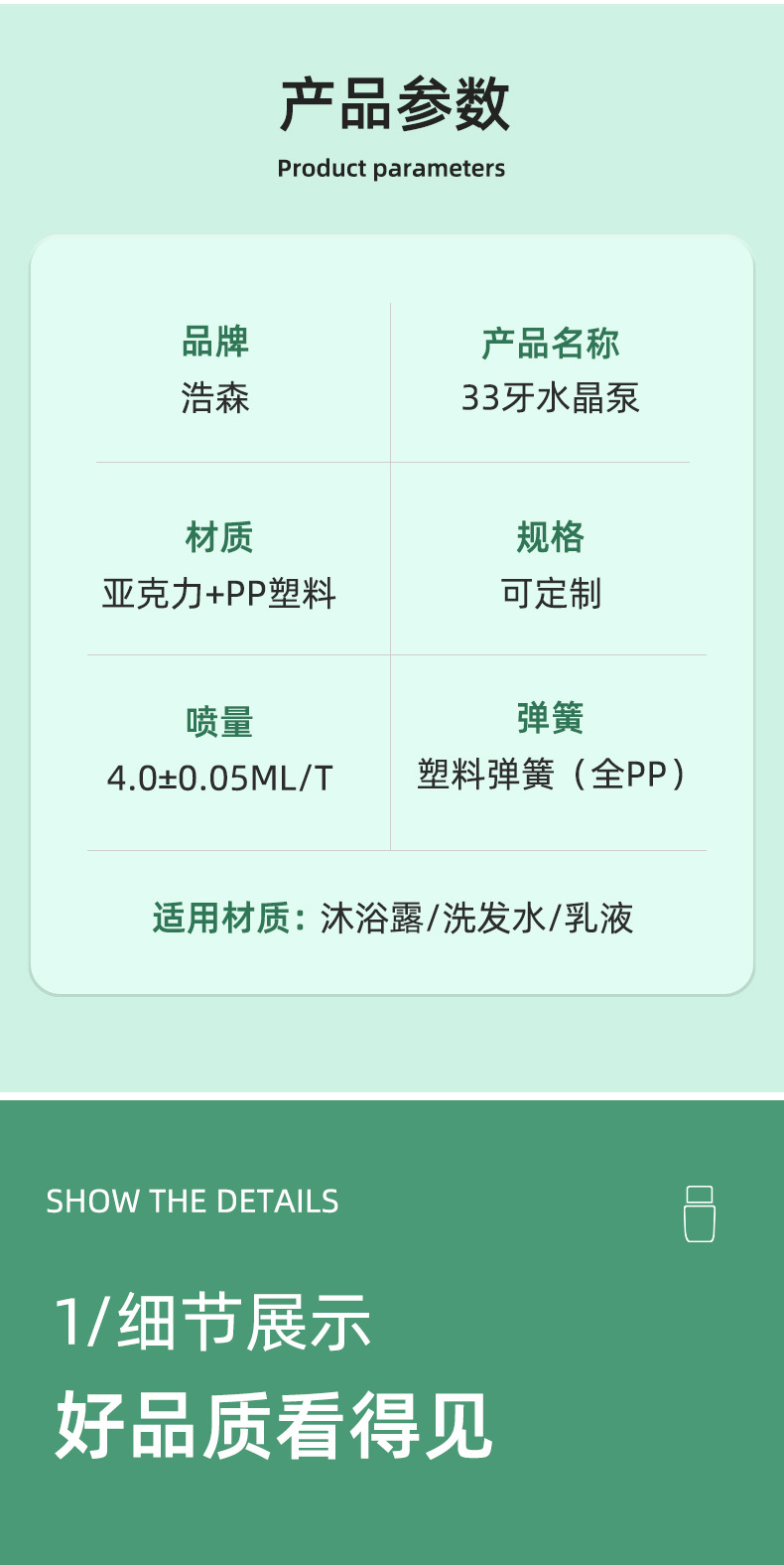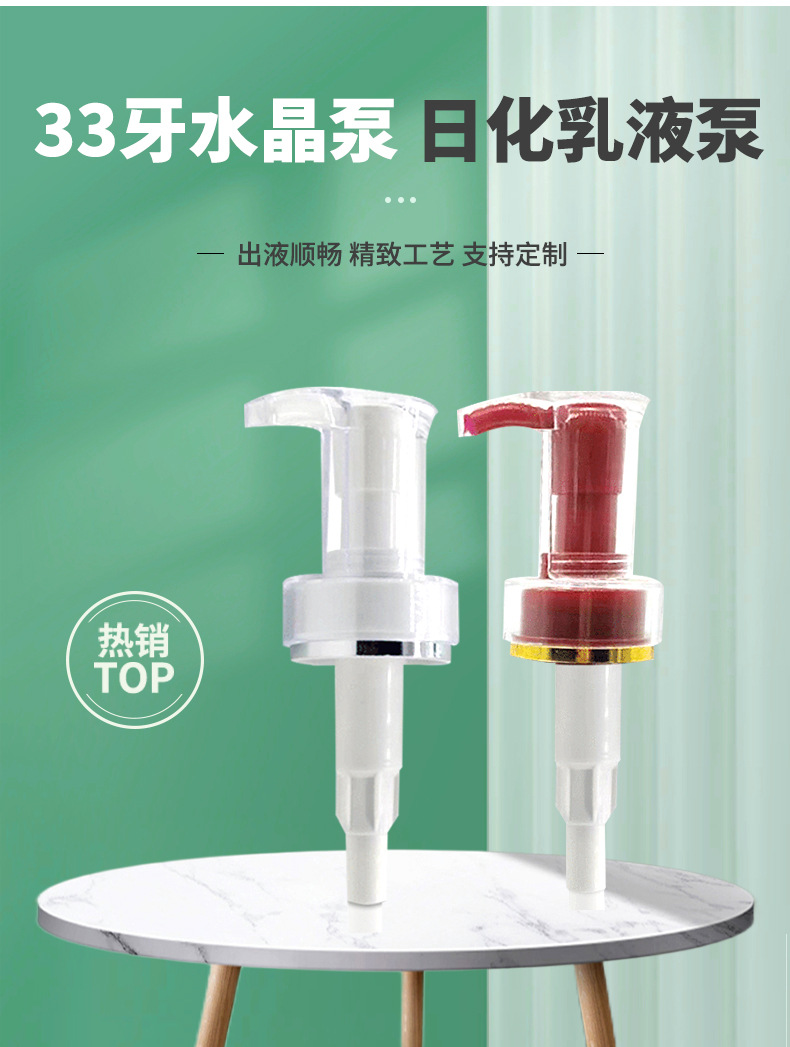Производитель поставляет на заказ двухслойный дозатор для лосьона и геля для душа из поликарбоната с 33 зубцами, с полупрозрачным пресс-дозатором.