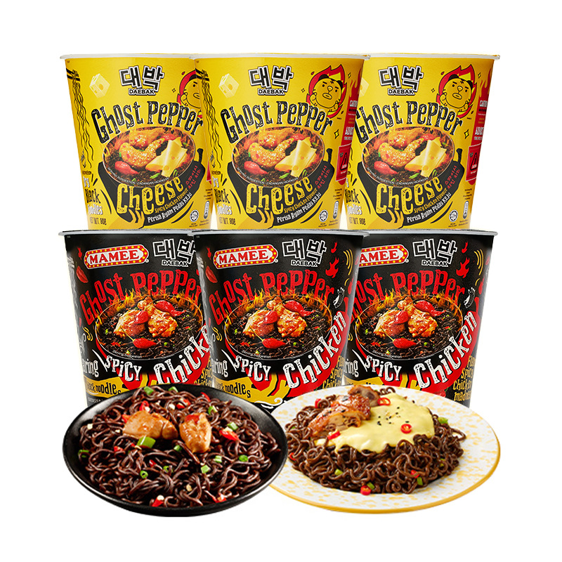 Лапша в стаканчике с сухим соусом со вкусом острого курица, 77 г; Сухая лапша с горячим и пряным сыром 80г; Картофельные чипсы Ghost Pepper с сильным пикантным вкусом 45 г