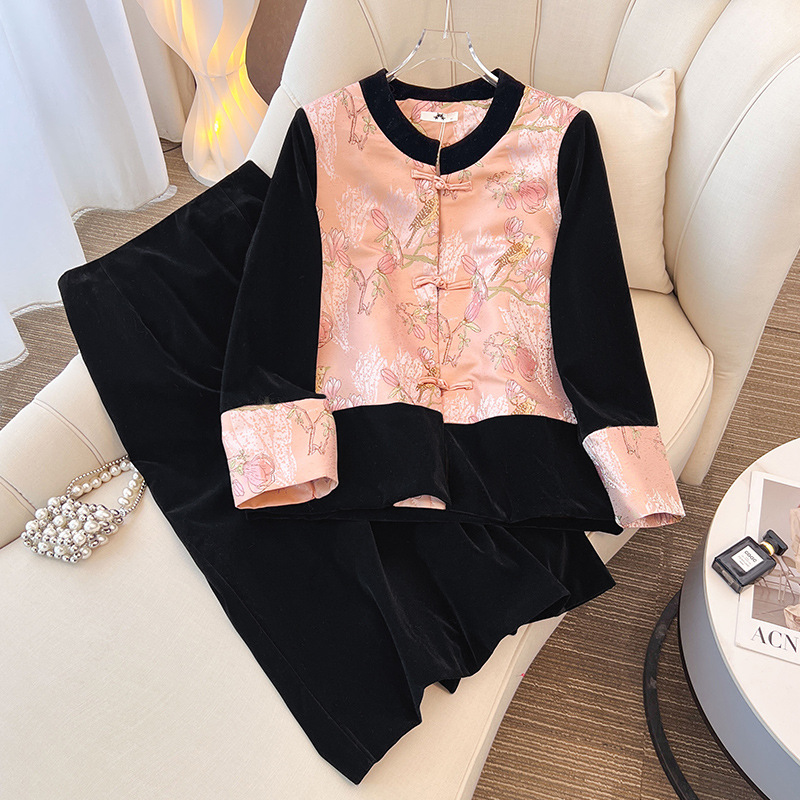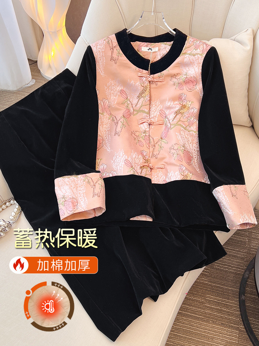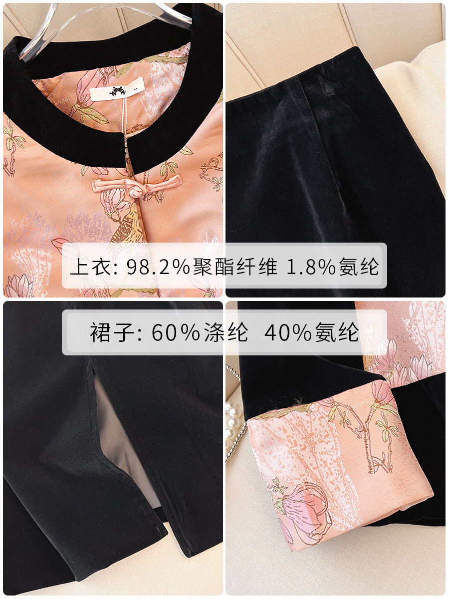 面料:外套:提花+丝绒,半身裙:丝绒,成分:外套:98.2%聚酯纤维1.8%氨纶,半身裙:60%涤纶40%氨纶。