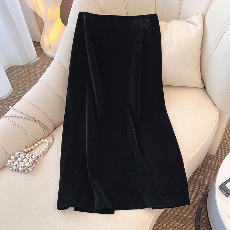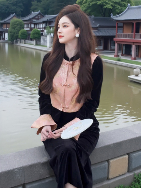 上衣黑色拼接部分和半身裙是高端丝绒面料,容易沾灰粘毛,