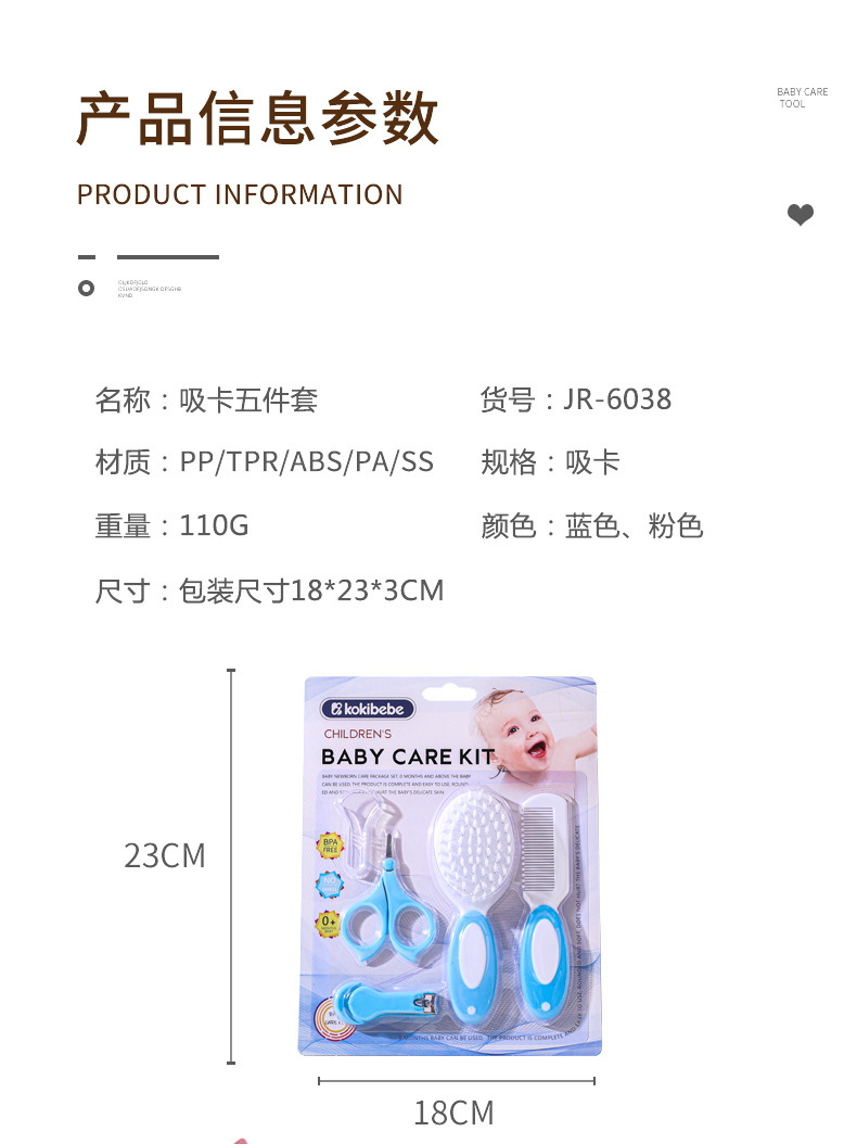 【尺寸】包装尺寸:18*23*2.5cm 梳子:13.5*3*1cm 刷子:14*5*2.3cm 指甲刀:10*5.3*0.8cm 指甲锉:9*1.2*0.5cm