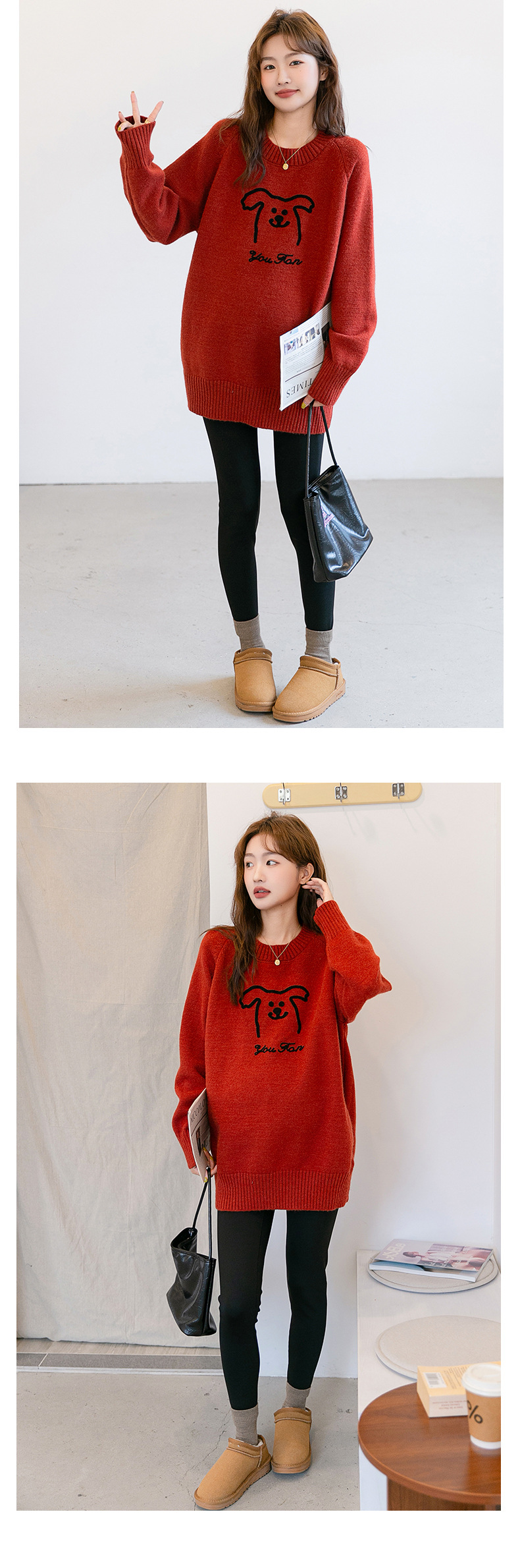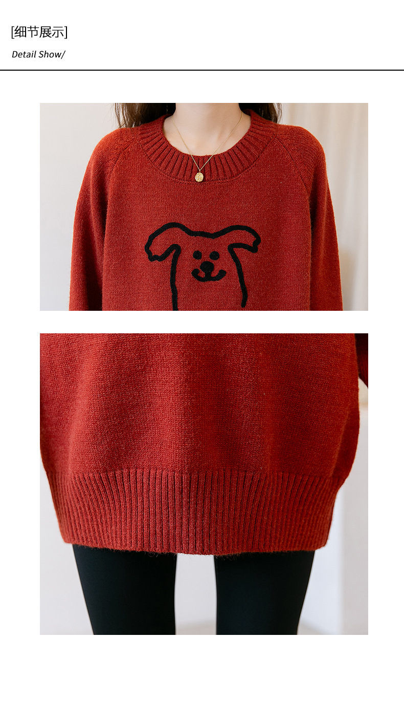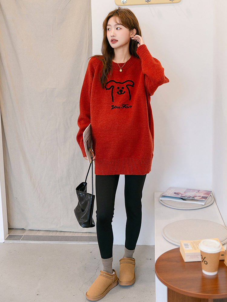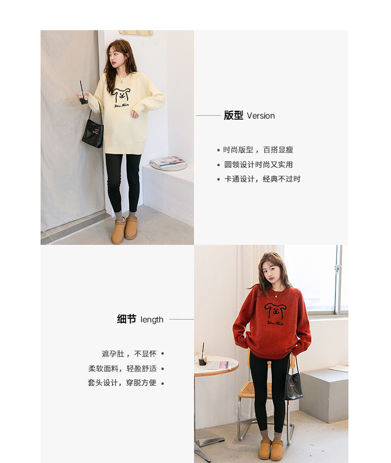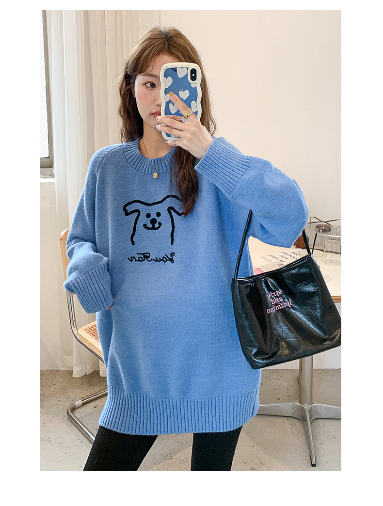 Осенняя и зимняя одежда для беременных мода корейский трикотажный свитер свободный эластический мультяшный узор с круглым вырезом трикотажный свитер средней длиной