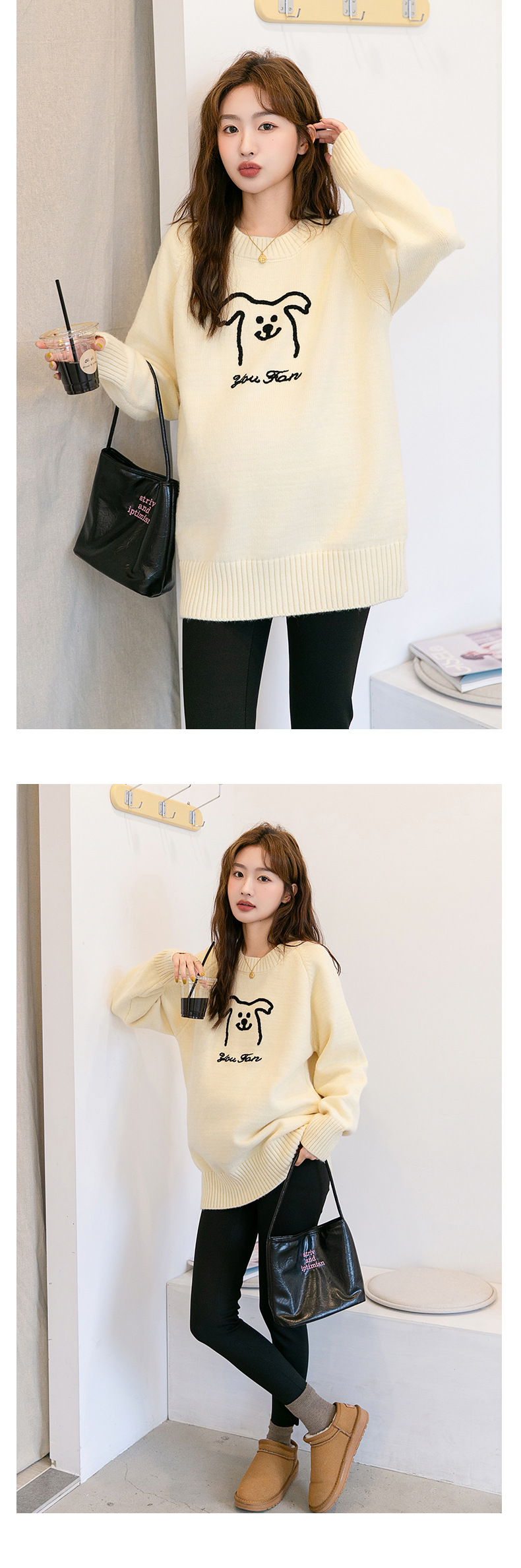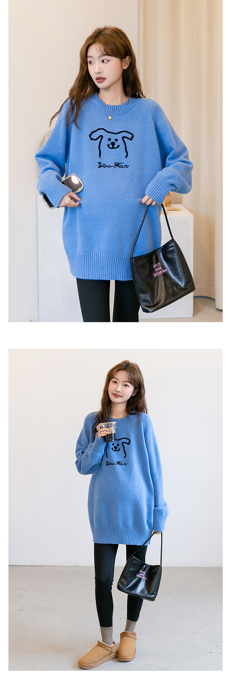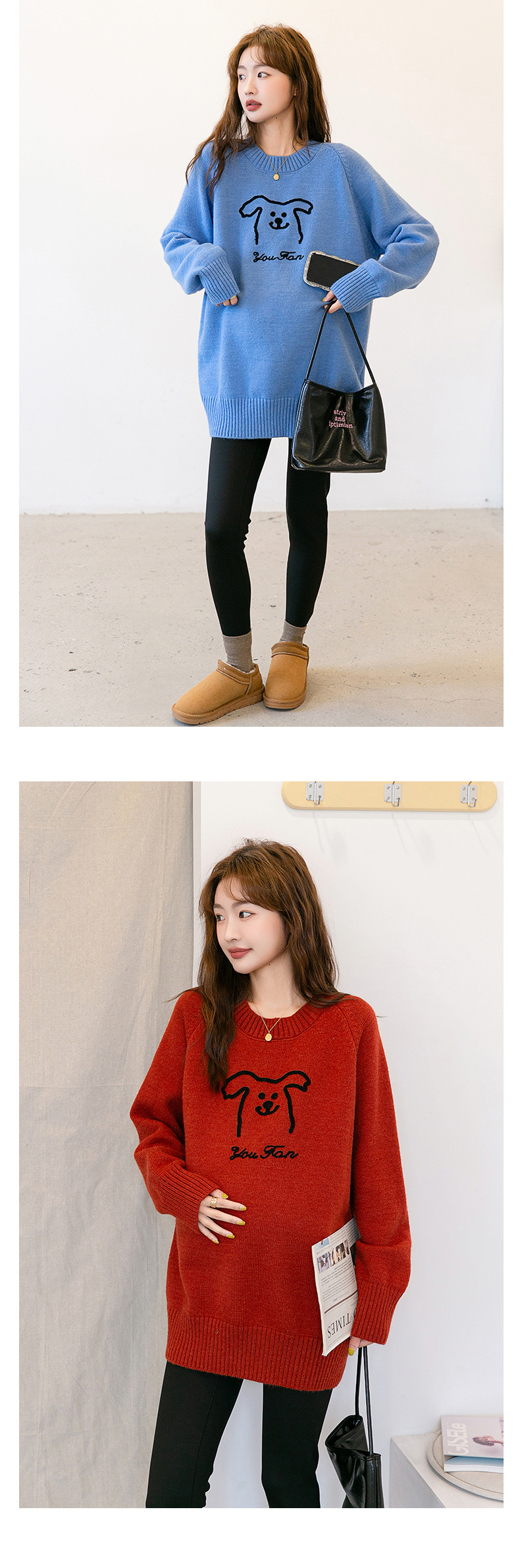 Осенняя и зимняя одежда для беременных мода корейский трикотажный свитер свободный эластический мультяшный узор с круглым вырезом трикотажный свитер средней длиной