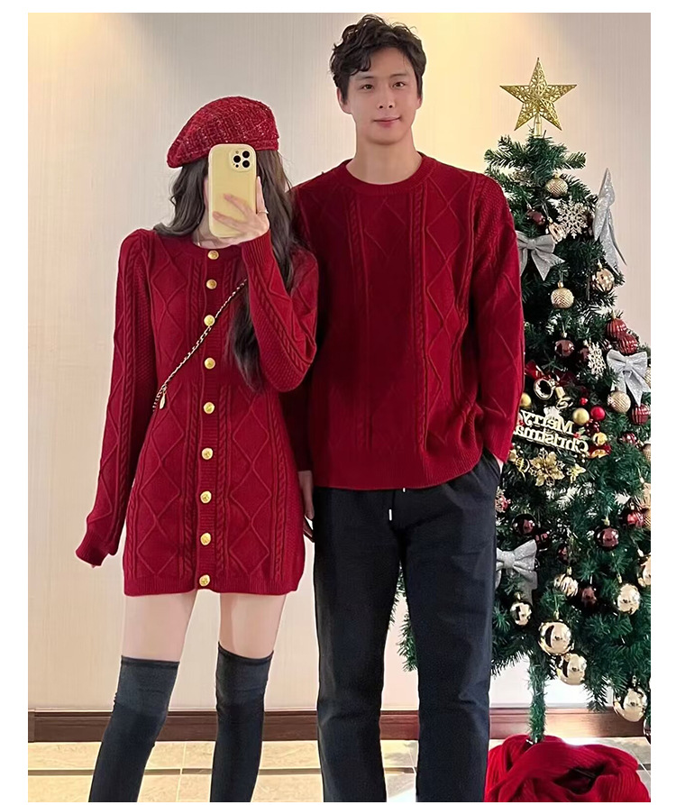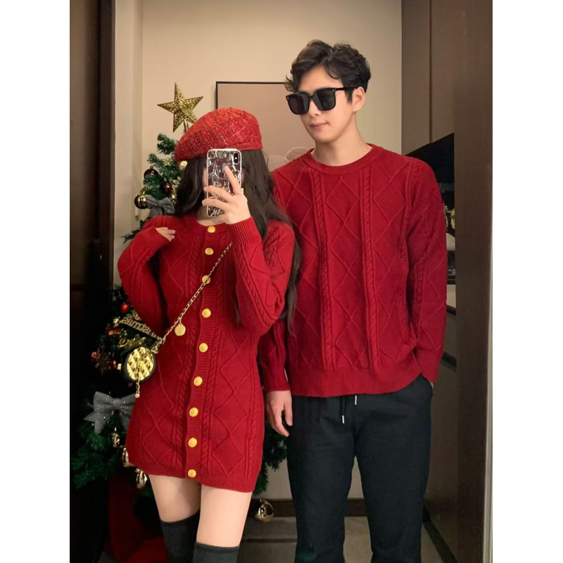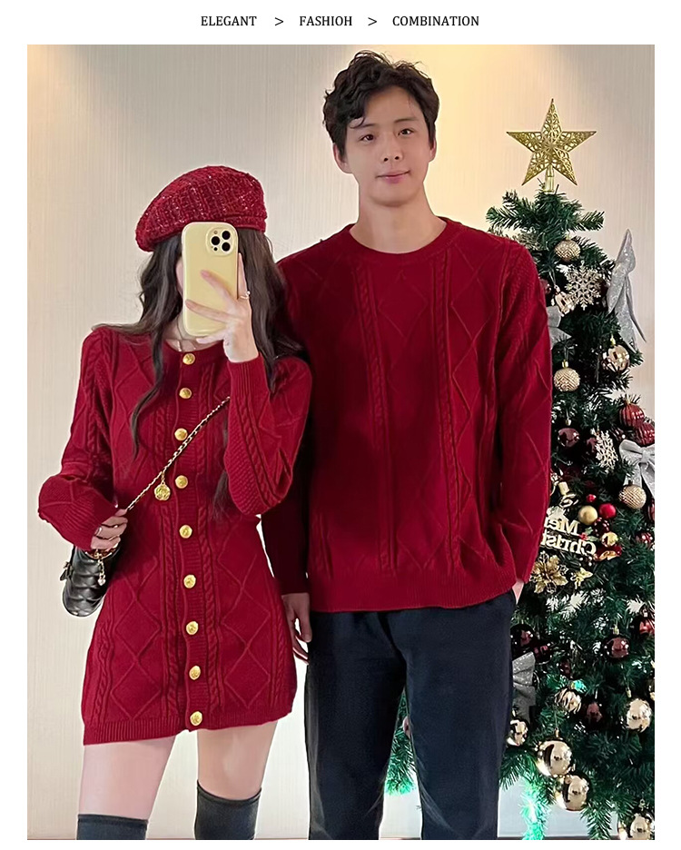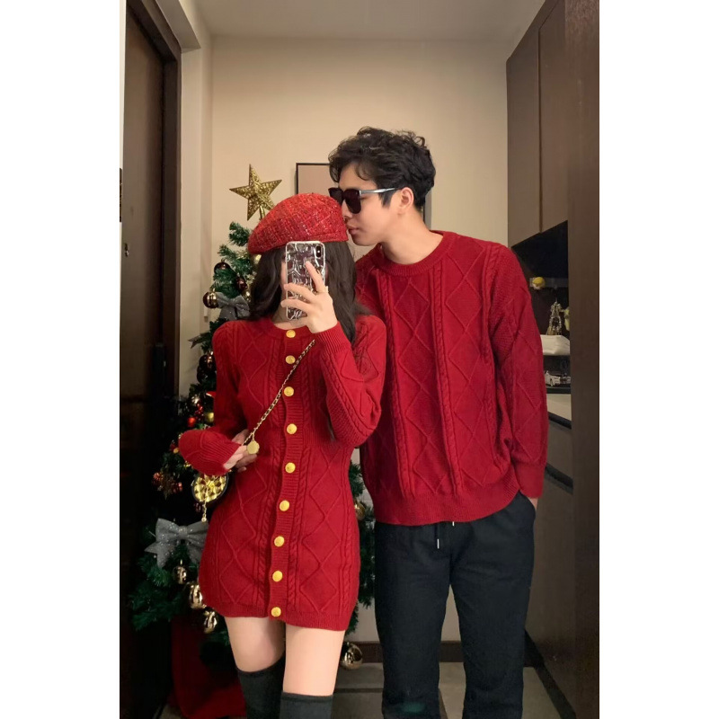 2024 осенний и зимний наряд для пар новогоднее красное платье свитер платье мужской свитер с круглым вырезом