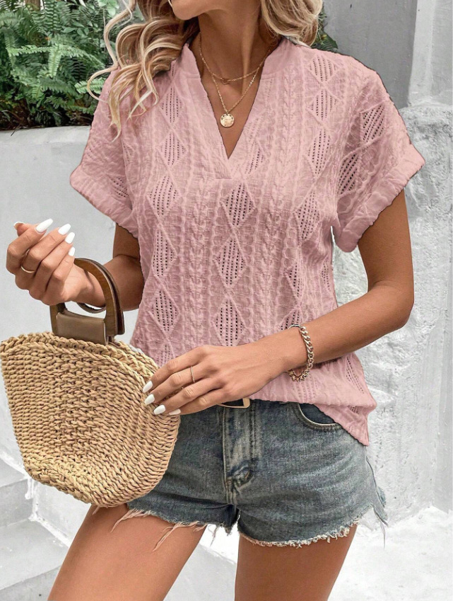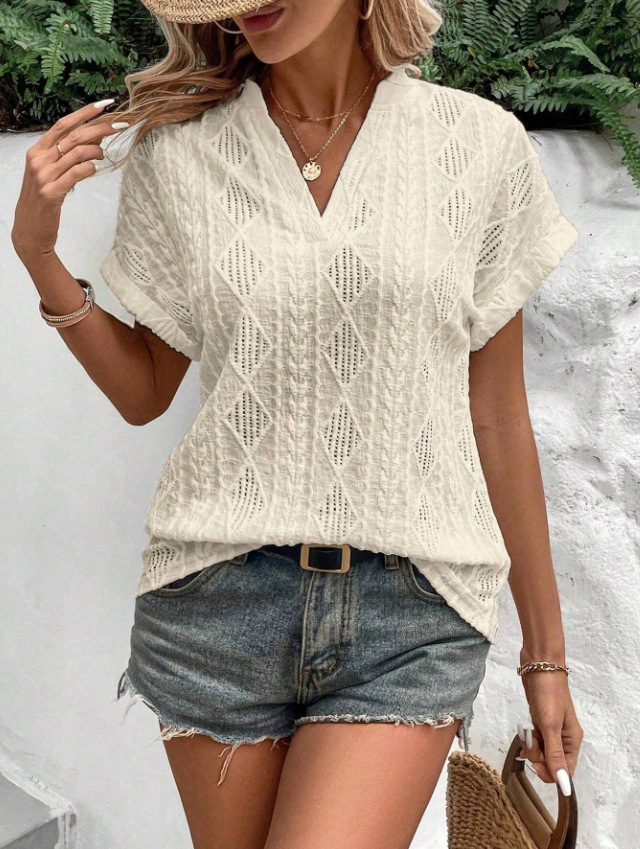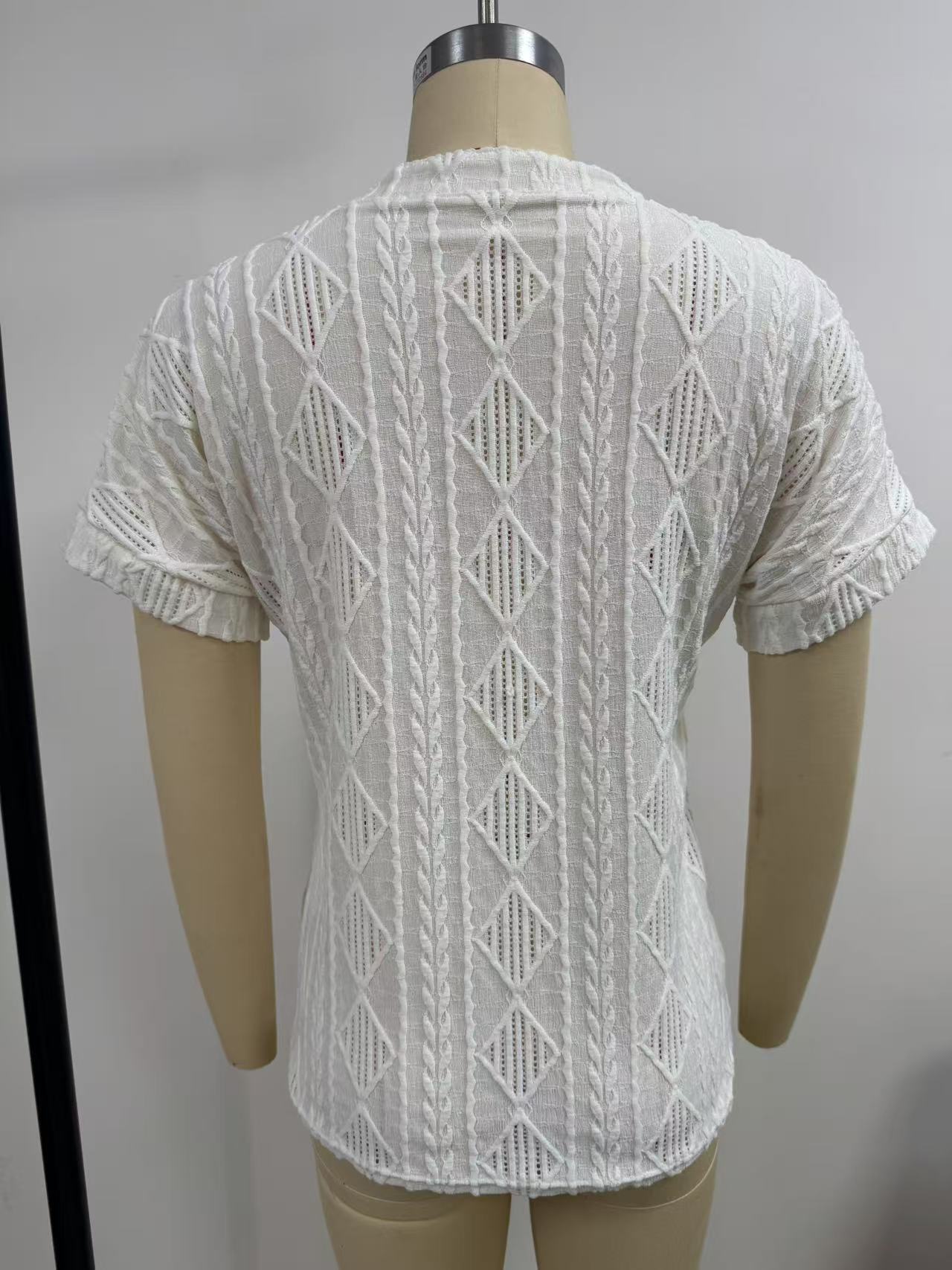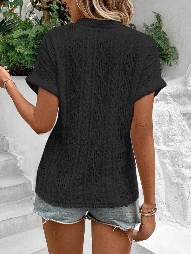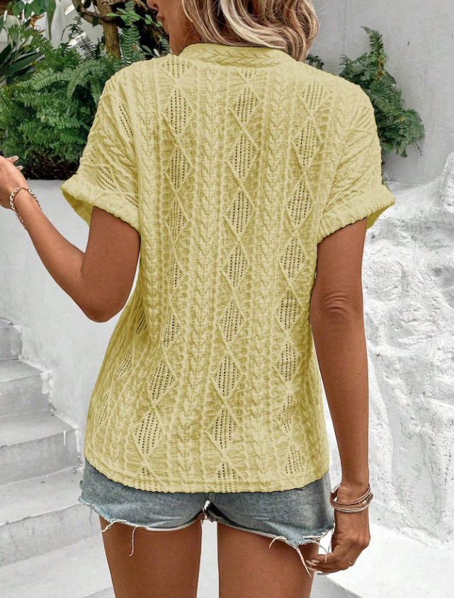 Amazon 2025 Европейский и Американский трансграничный летний новый повседневный полый жаккардовый воротник свободная рубашка с короткими рукавами для женщин