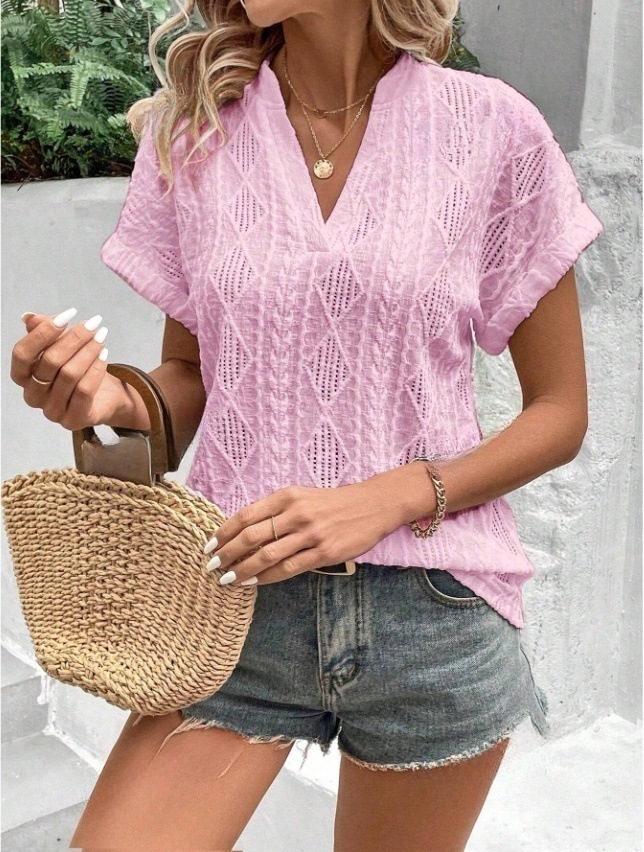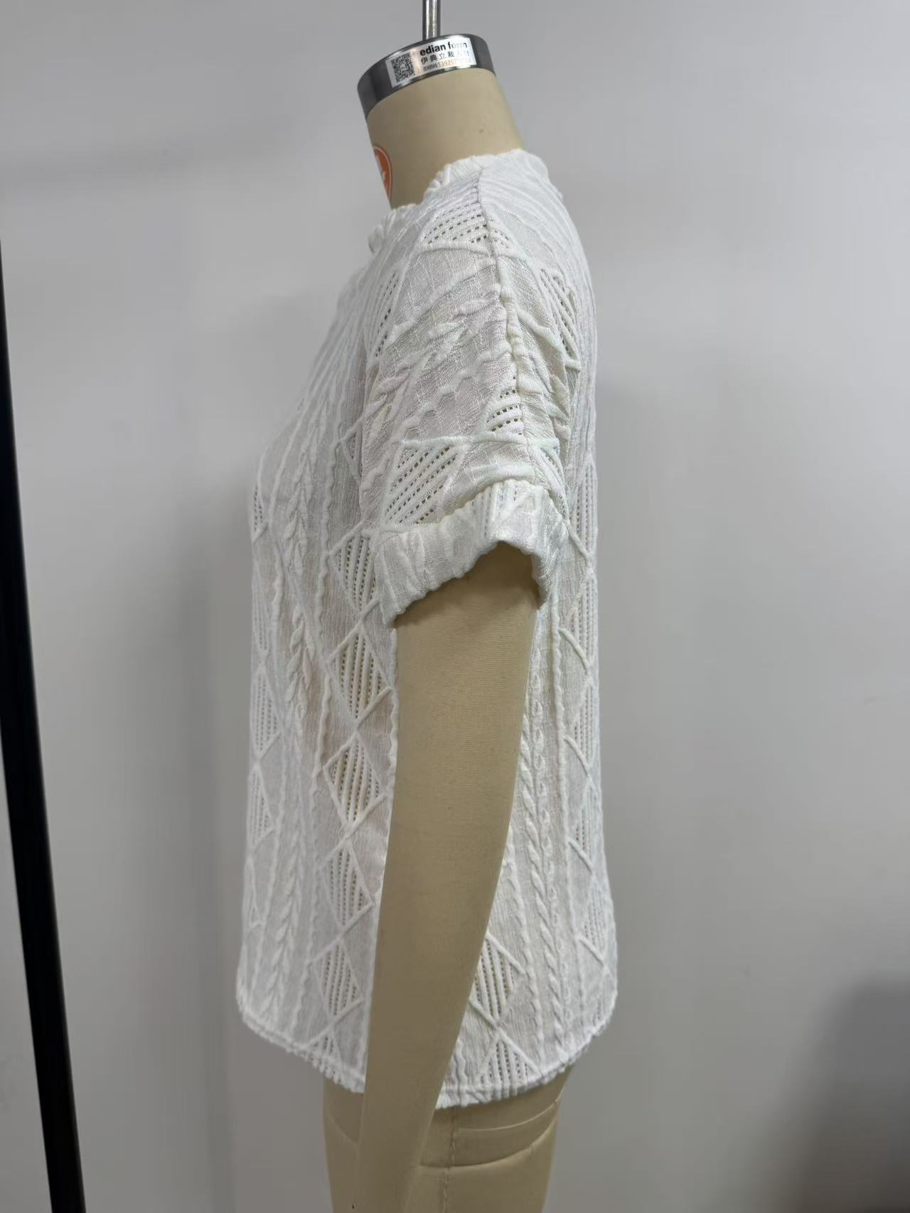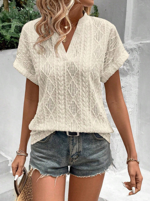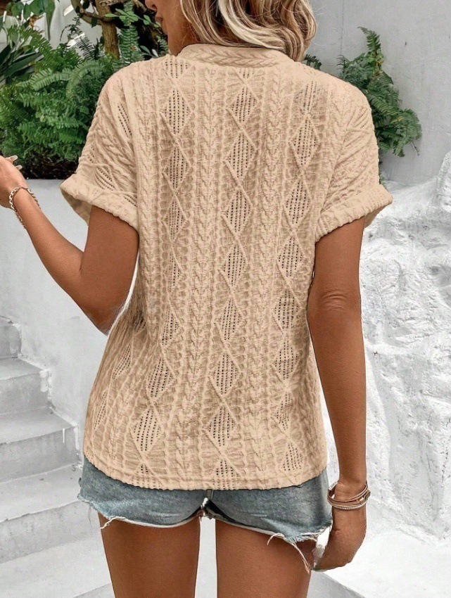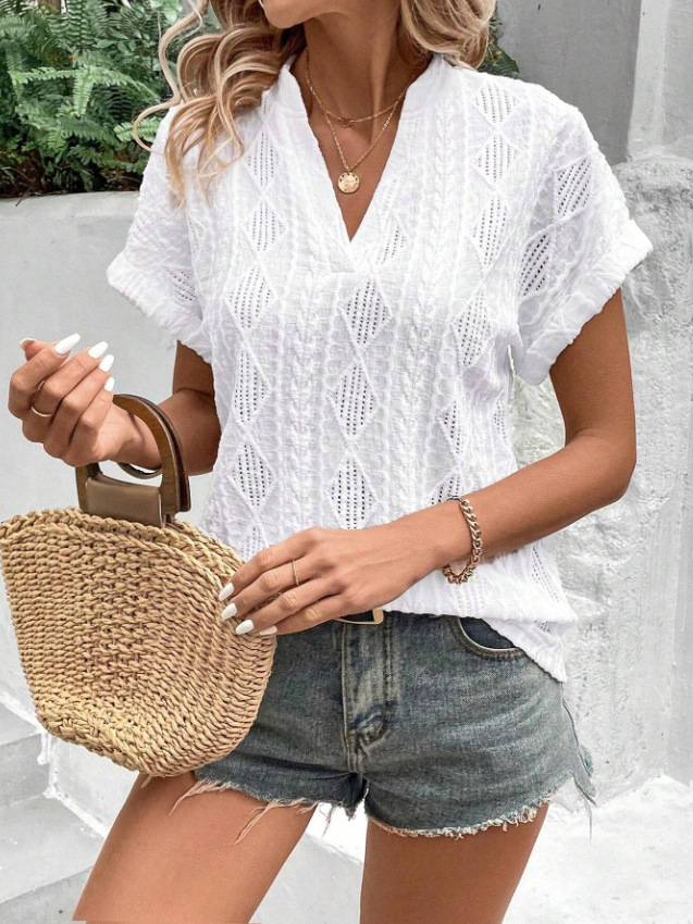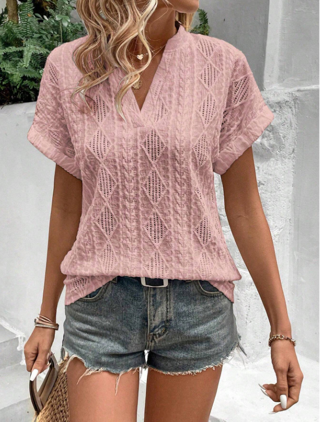 Amazon 2025 Европейский и Американский трансграничный летний новый повседневный полый жаккардовый воротник свободная рубашка с короткими рукавами для женщин