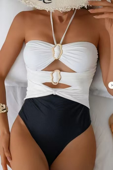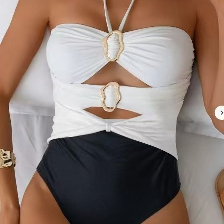 2025 новый кросс-бордерный черно-белый контрастный металлический аксессуар, цельный купальник с воротником-стойкой, купальник Amazon, женский купальник на заказ
