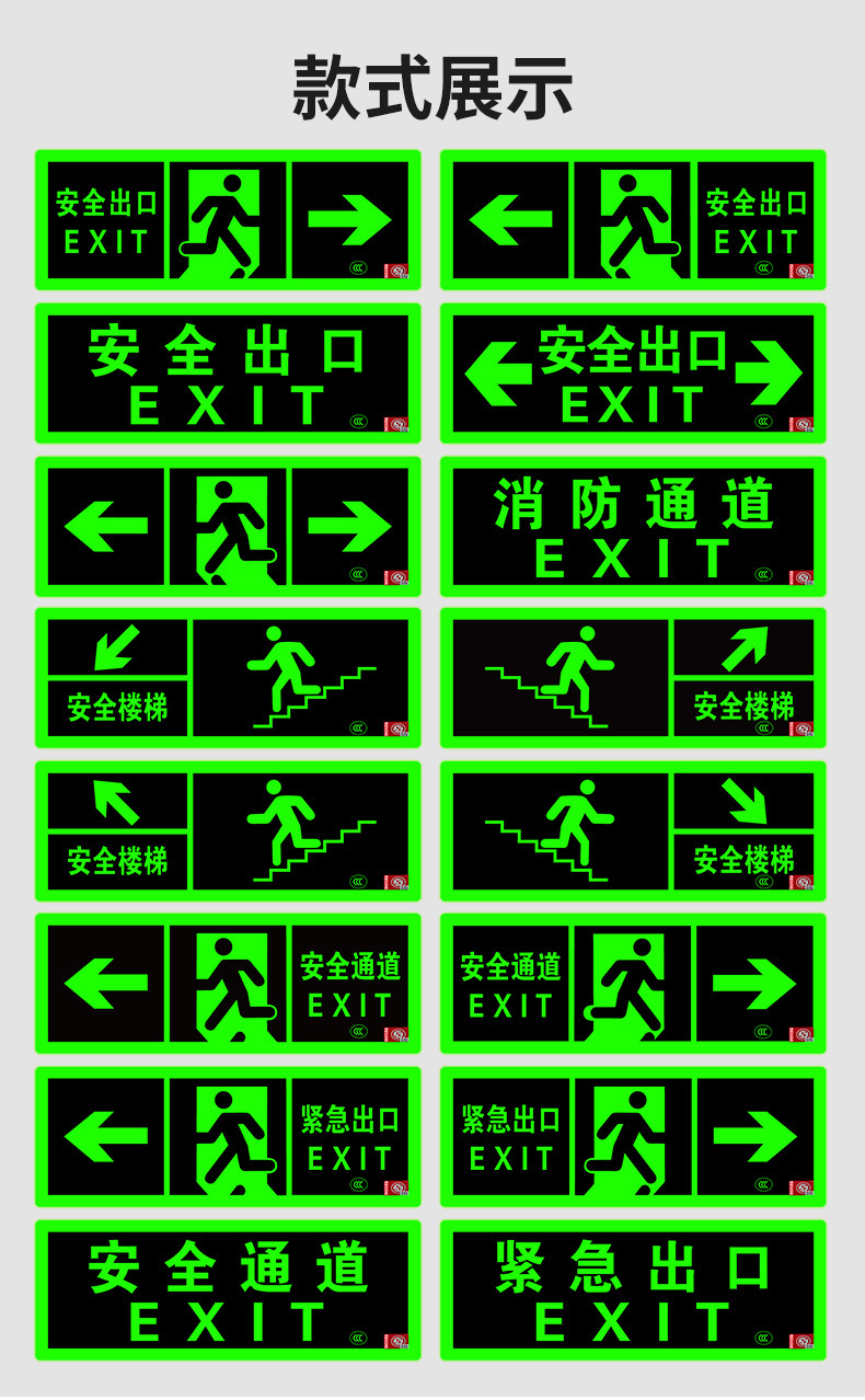 Аварийный выход (сертификация пожарной безопасности, с пожарной маркировкой); Аварийный выход слева (сертифицирован по пожарной безопасности, с пожарной маркировкой); Аварийный выход справа (сертифицирован по пожарной безопасности, с маркировкой пожарной безопасности).; Двусторонний аварийный выход (сертификация пожарной безопасности, с пожарной маркировкой); Двусторонний (сертификация на огнестойкость, с огнестойким знаком); Лестница безопасности внизу слева (сертифицирована противопожарной службой, с противопожарной маркировкой); Лестница безопасности внизу справа (сертифицирована противопожарной службой, с противопожарной маркировкой); Лестница безопасности вверху слева (сертификация пожарной безопасности, с огнестойким знаком); Лестница безопасности в правом верхнем углу (сертификация пожарной безопасности, с огнестойким знаком); Пожарный выход (сертификация пожарной безопасности, с пожарной маркировкой)