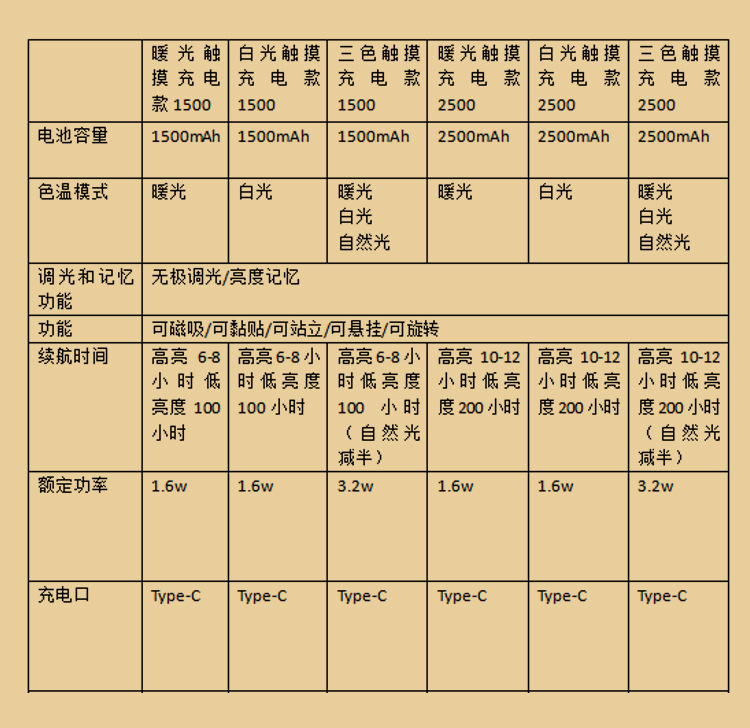 Теплый свет 800 мАч; 1500 мАч теплый свет; 2500 мАч теплый свет; 1500 мАч три цвета; 2500 мАч три цвета; Теплый свет 800 мАч + зарядная головка; Теплый свет 1500 мАч + зарядная головка; Теплый свет 2500 мАч + зарядная головка; 1500 мАч три цвета + зарядная головка; 2500 мАч три цвета + зарядная головка