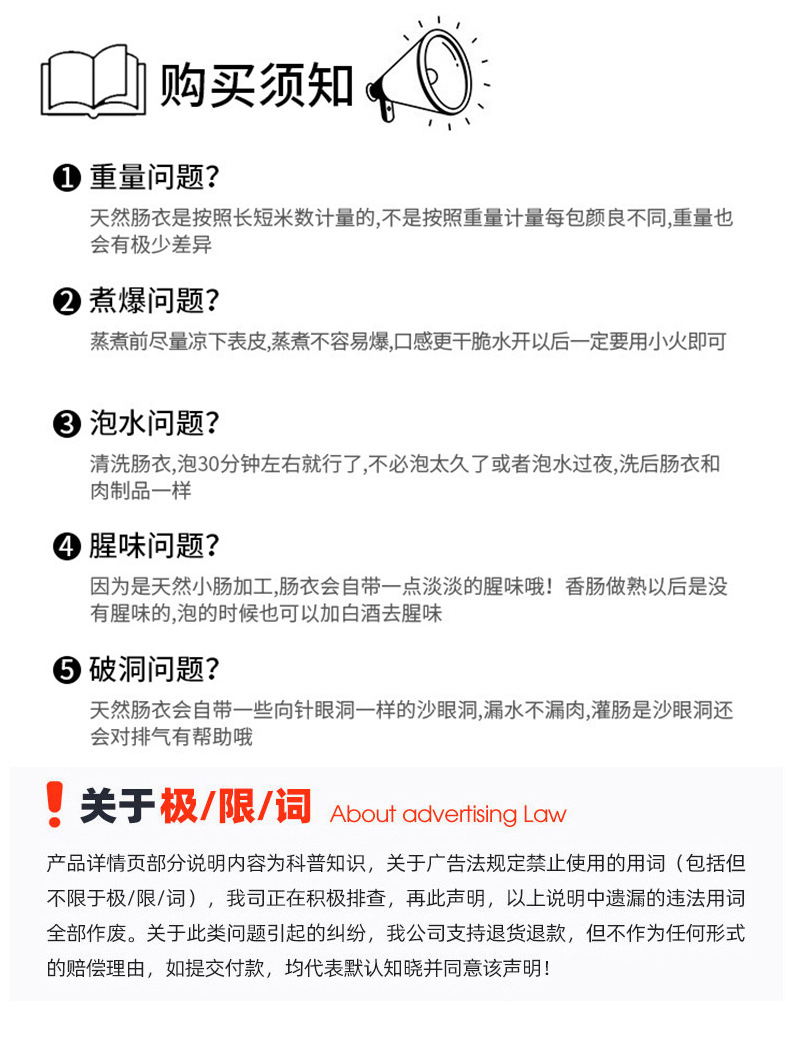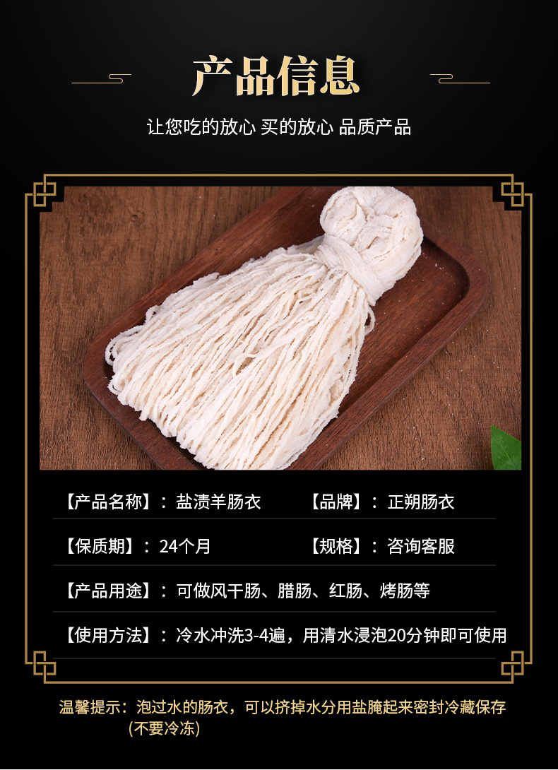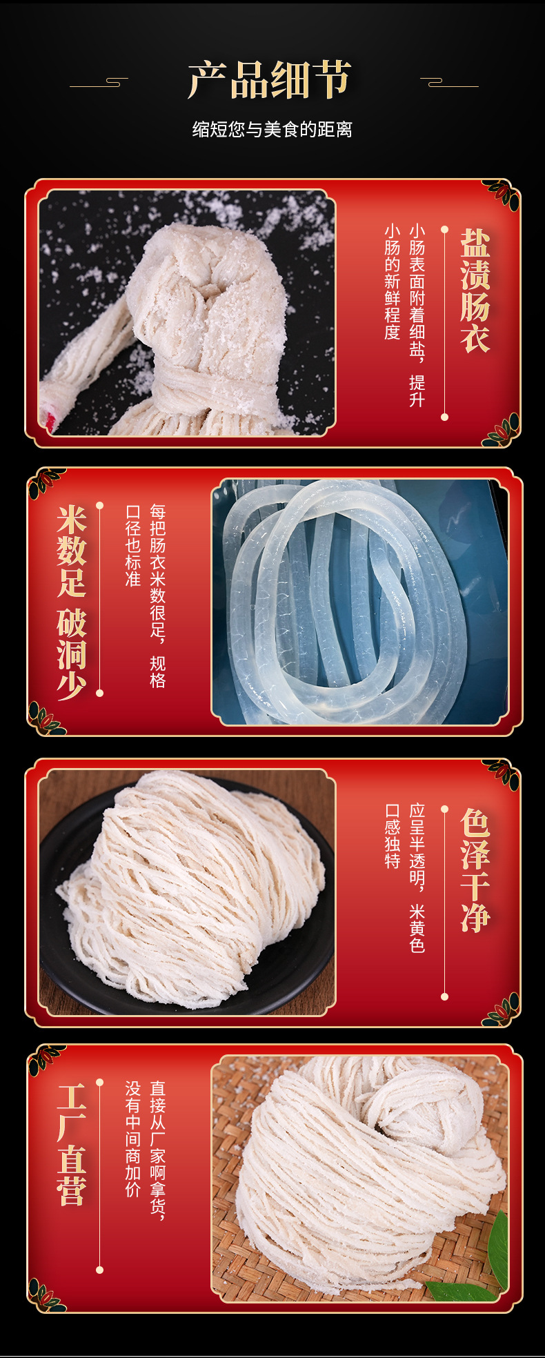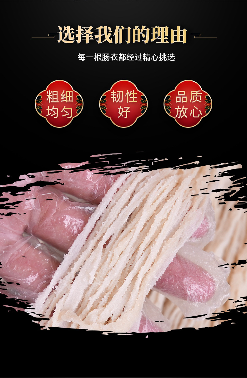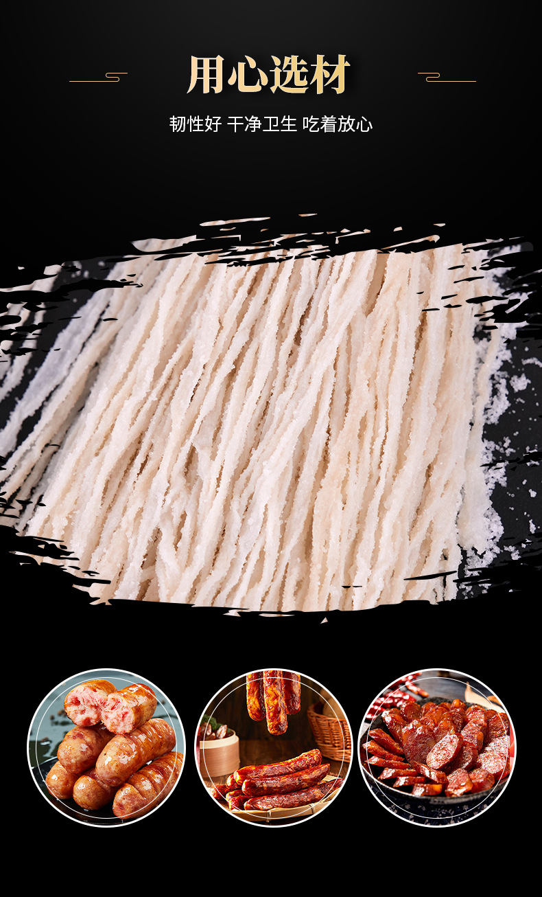 5-ходовой (14/16) 90m овечьих оболочек; 4-ходовой (16/18) 90m овечьих оболочек; 3-ходовой (18/20) 90m овечьих оболочек; 2-ходовой (20/22) 90m овечьих оболочек; 1 способ (22/24) 90m овечьих оболочки; Qingte Road (24/26) 90m овечьих оболочек; Дател (26/28) 90m овечьих оболочек; Головной кусок шошники (короткая жареная колбаса, колбаса для завтрака, колбаса в виде палочки и т.д.); Собачья колбаса средней длины (длинная колбаса, высушенная на воздухе).