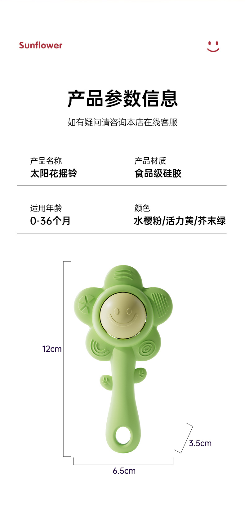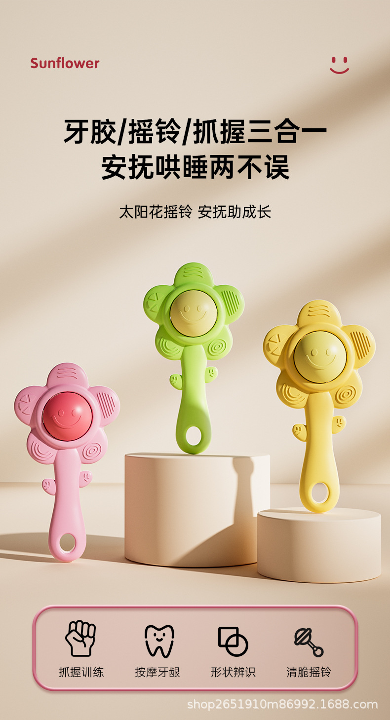 Силиконовый зуб, кусающий подсолнух, погремушка желтого цвета (сумка); Силиконовая погремушка с подсолнухом, зеленая (сумка); Силиконовая погремушка с подсолнухом, розовая (сумка); Силиконовая погремушка-подсолнух для кусания зубов (цветная коробка)