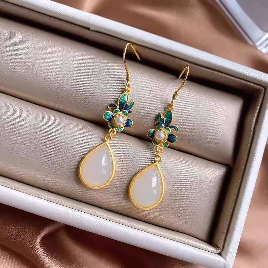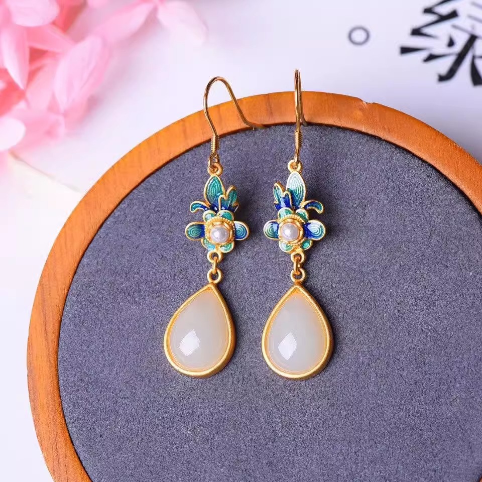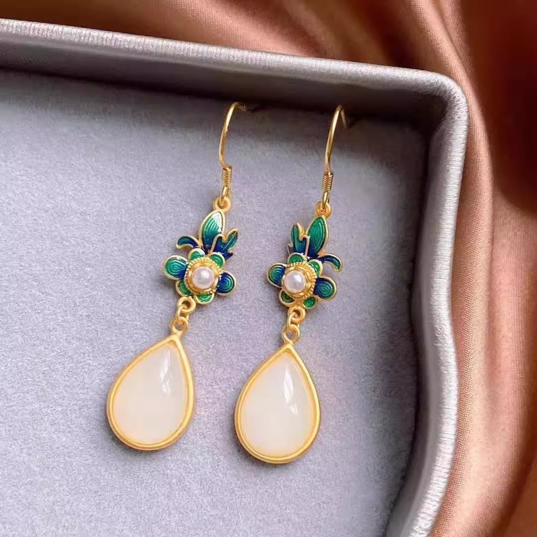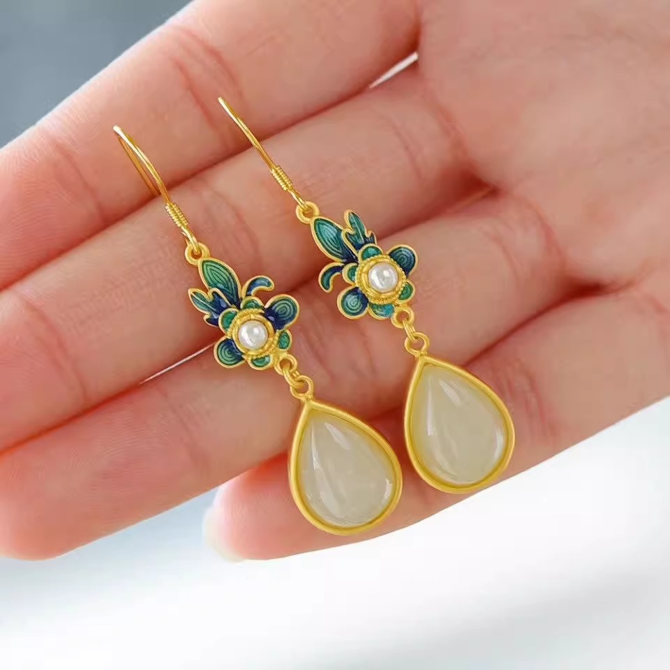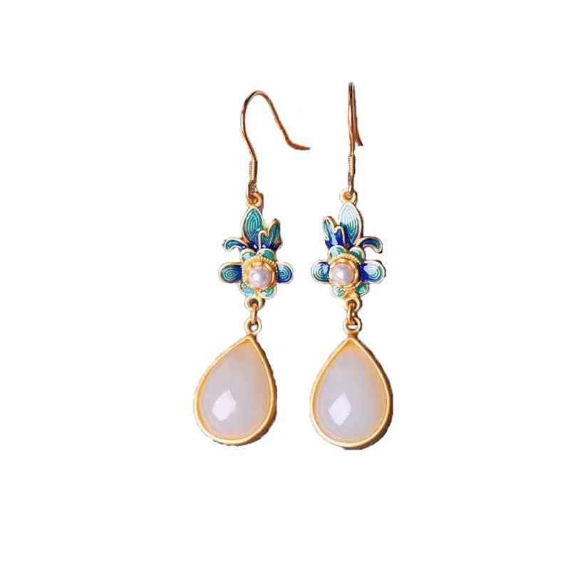 Производитель оптом Hutian Jade ретро китайский стиль эмаль ремесла лотос серьги серьги серьги кольцо ретро легкий роскоши