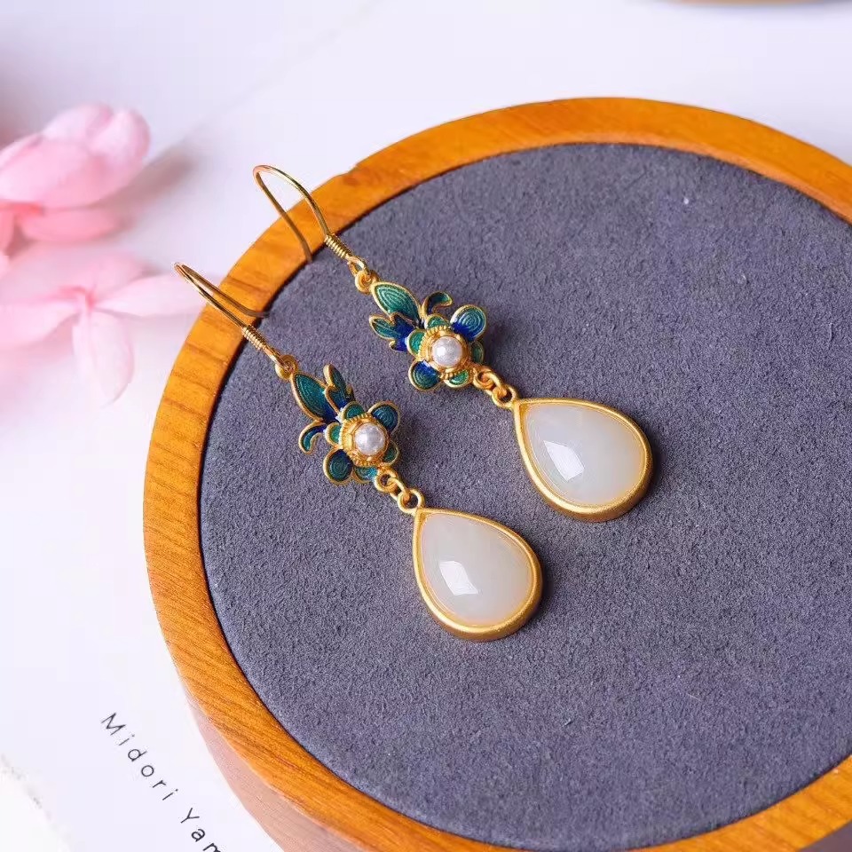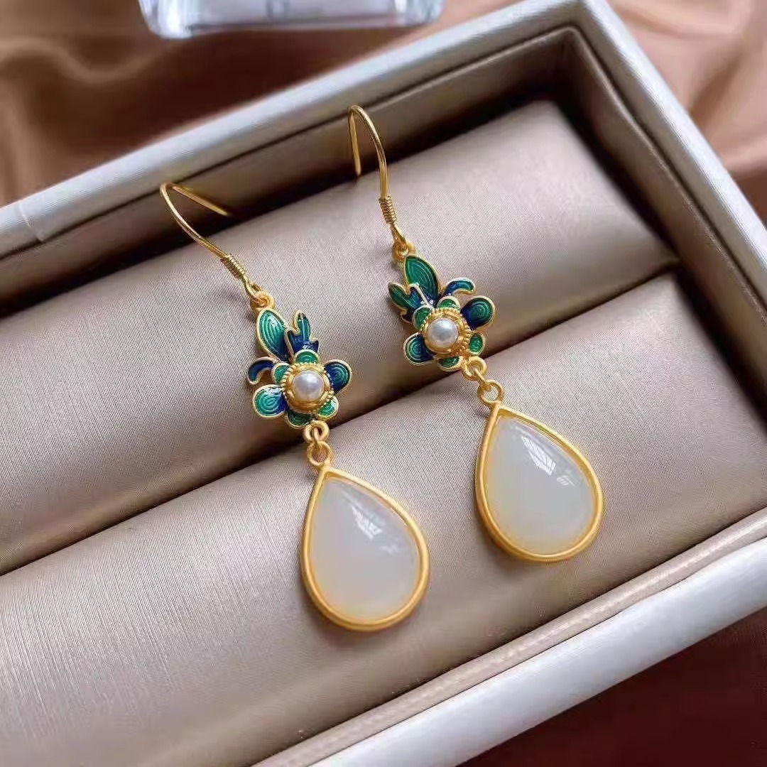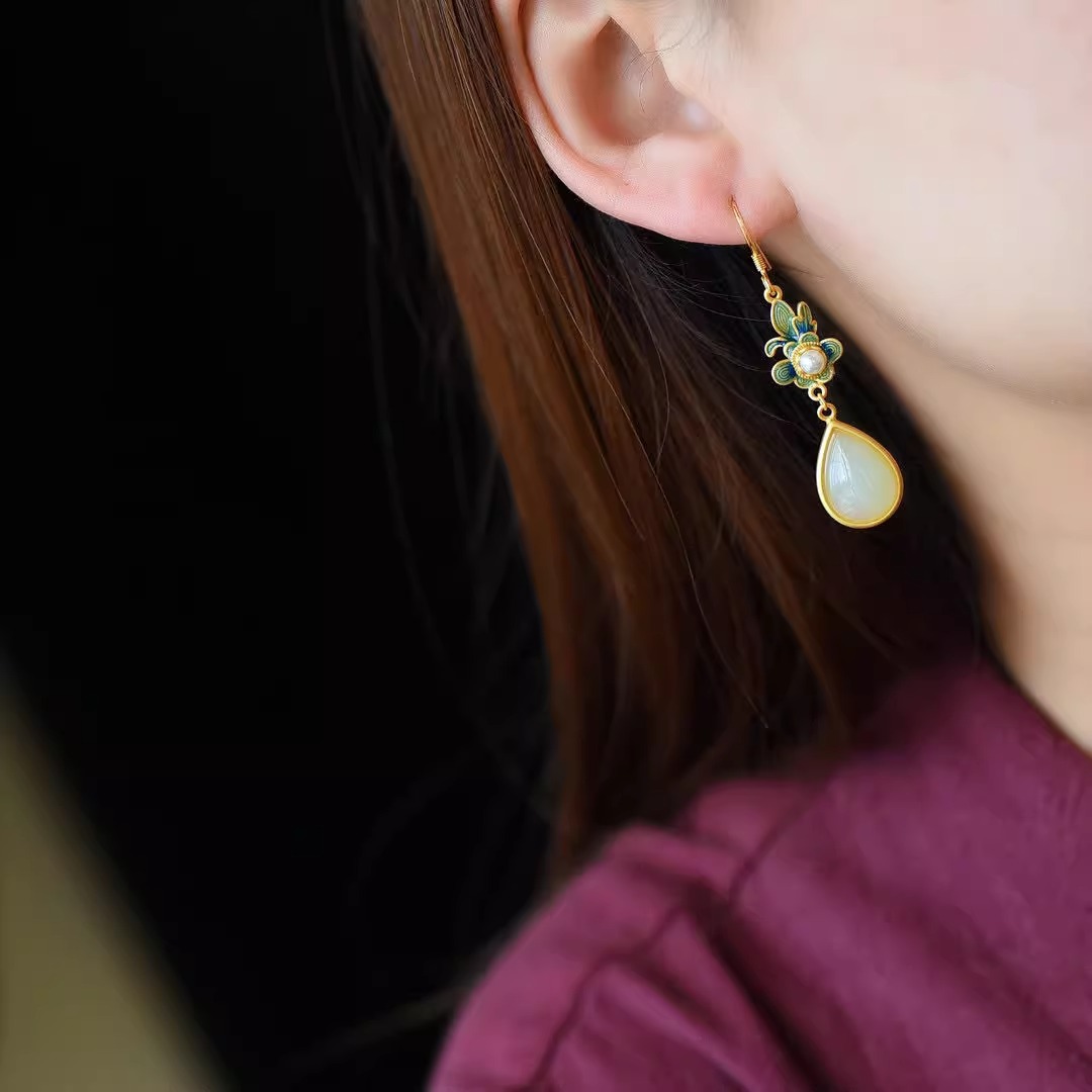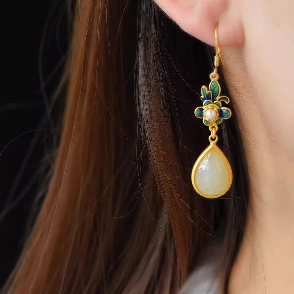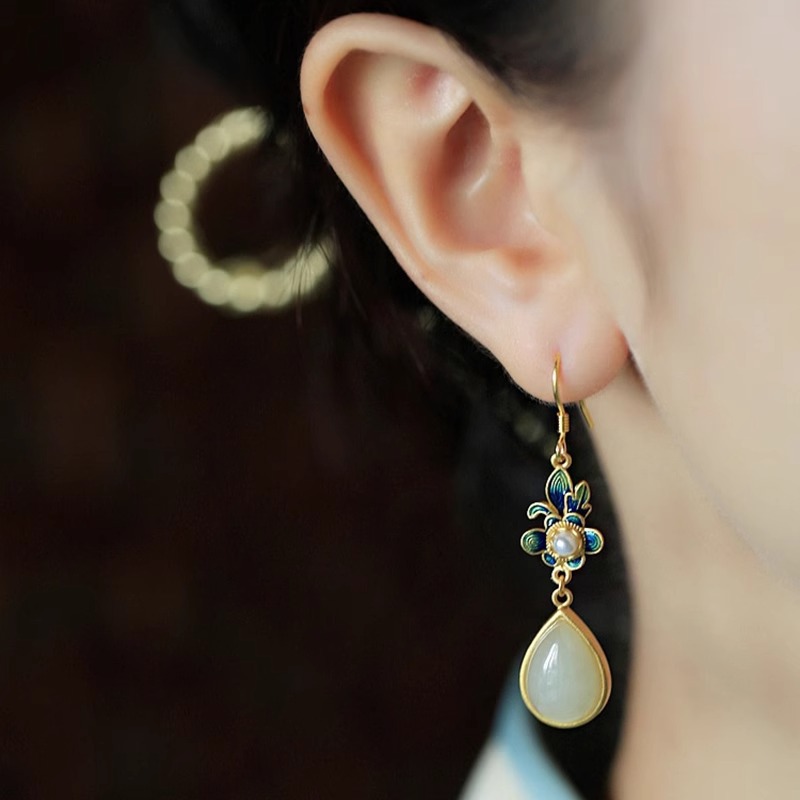 Производитель оптом Hutian Jade ретро китайский стиль эмаль ремесла лотос серьги серьги серьги кольцо ретро легкий роскоши