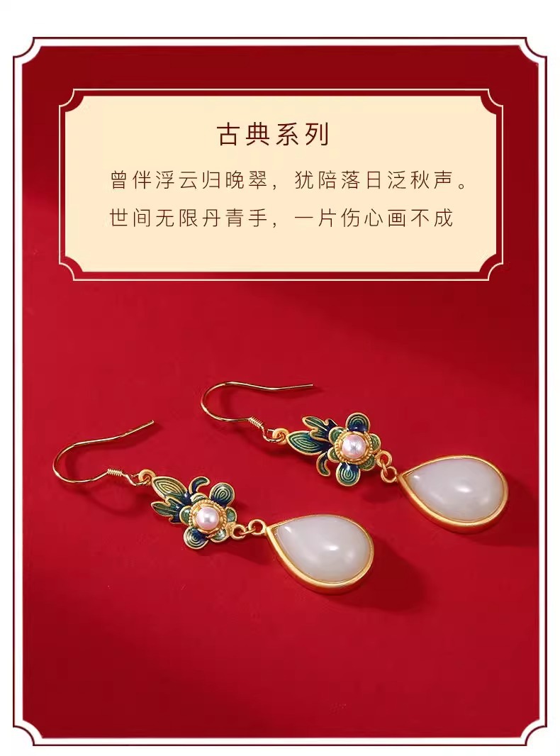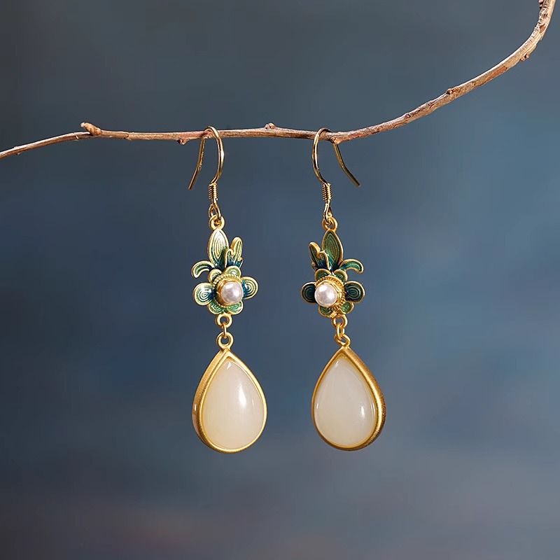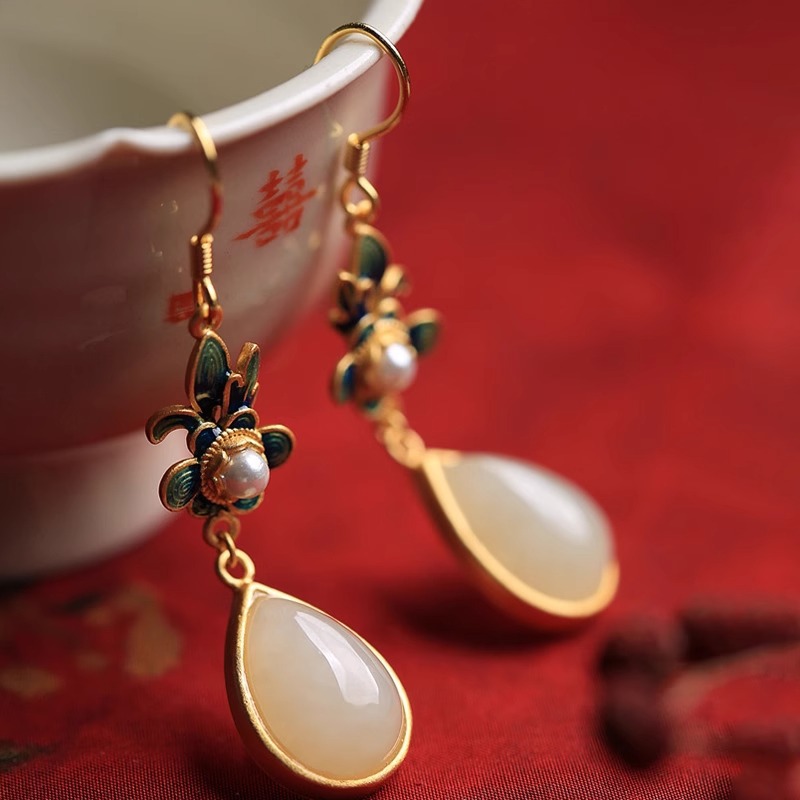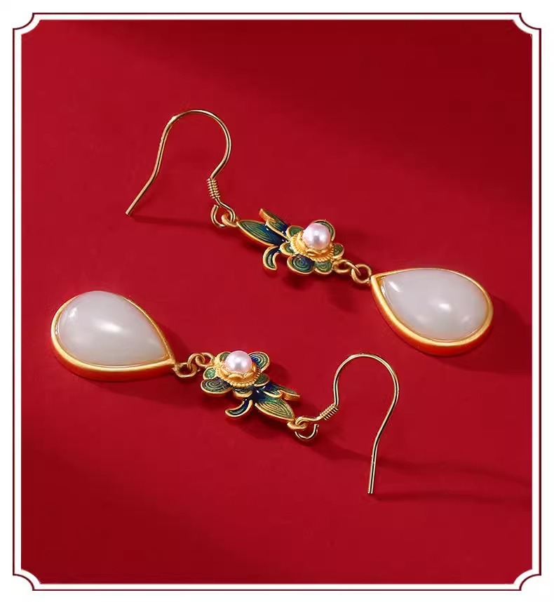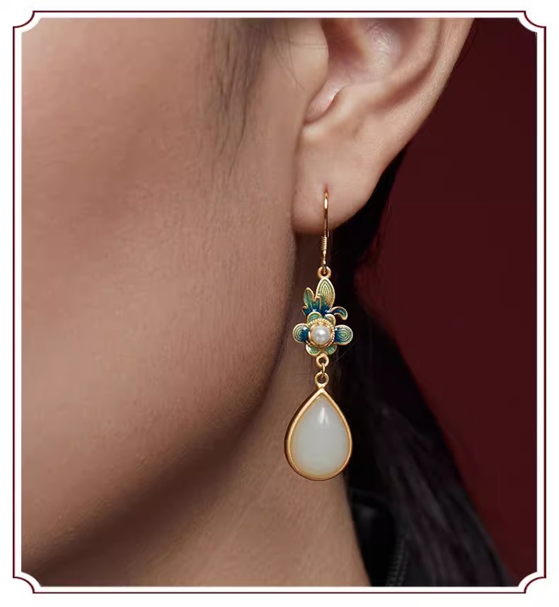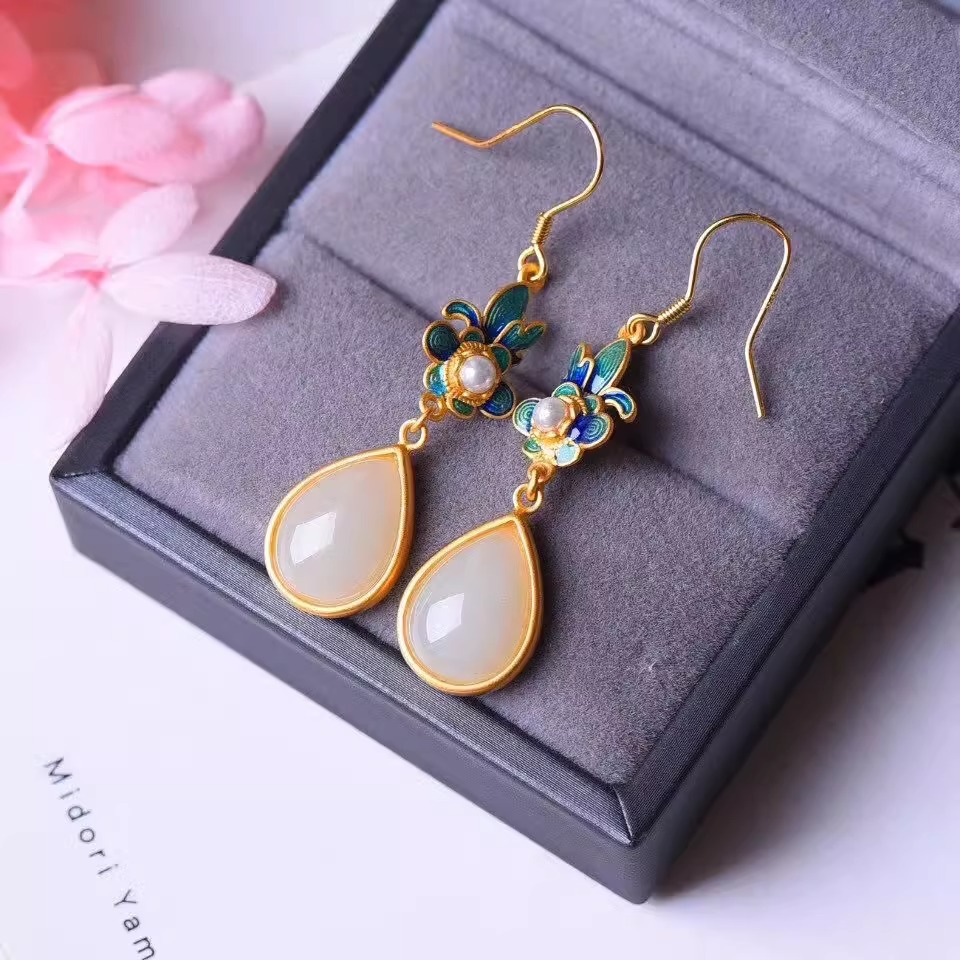 Производитель оптом Hutian Jade ретро китайский стиль эмаль ремесла лотос серьги серьги серьги кольцо ретро легкий роскоши