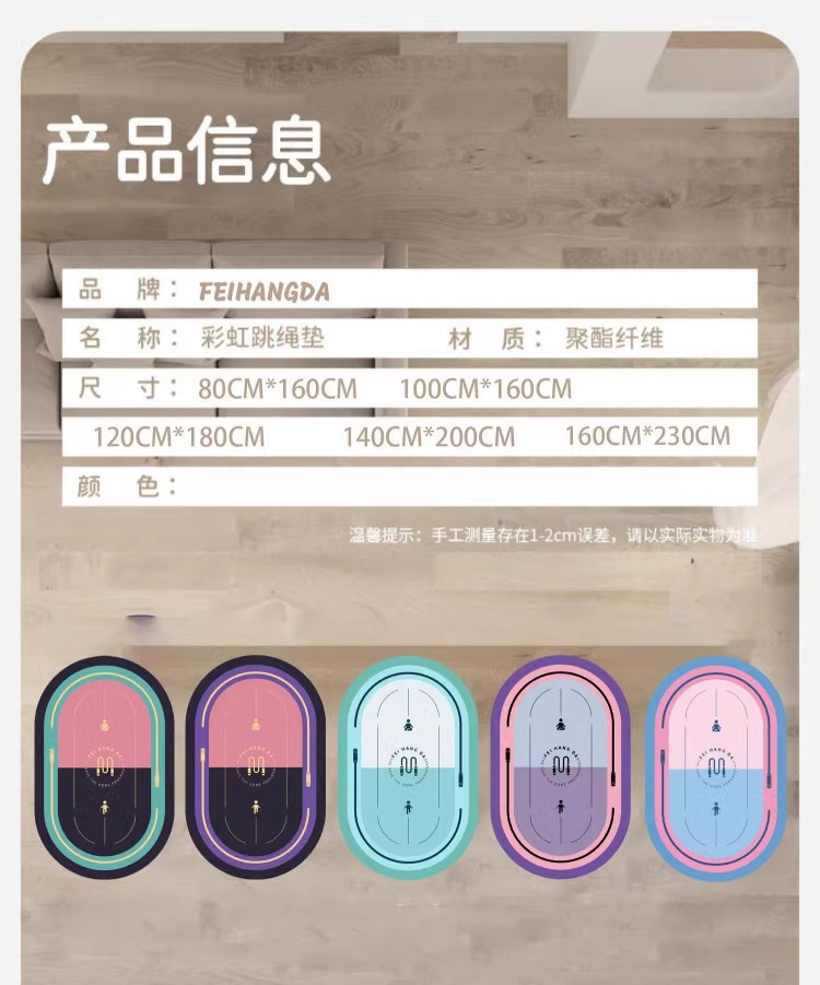 60см*100см [подушка]; 80 см * 120 см [Коврик для ламания]; 100 см * 160 см [рекомендуется учащимся, чтобы пропустить веревку]; 120*180 см [рекомендуется для прыжков на скакалке для взрослых]; 140*200 [Рекомендуется для взрослых, аэробика скакалки]; 160*230 см [Несколько спортивных рекомендаций]