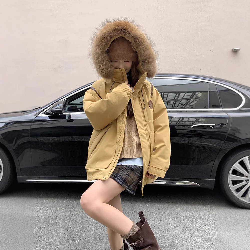 Желтая женская зимняя куртка-парка 2025 года, новая модель, с большим меховым воротником, рабочая, модная, на толстом белом утином пуху