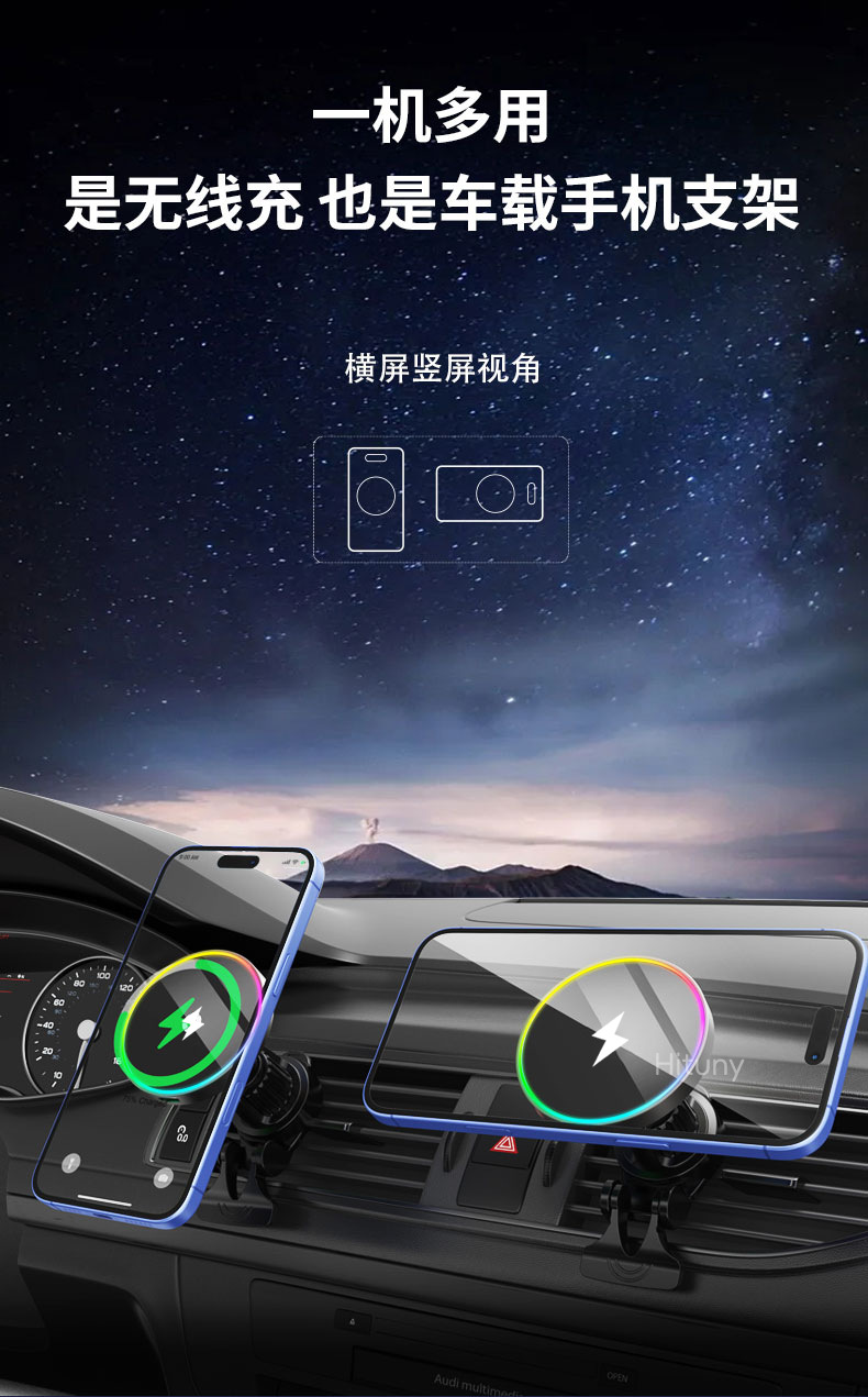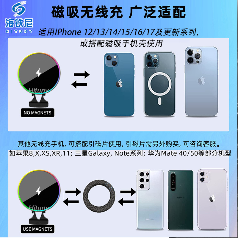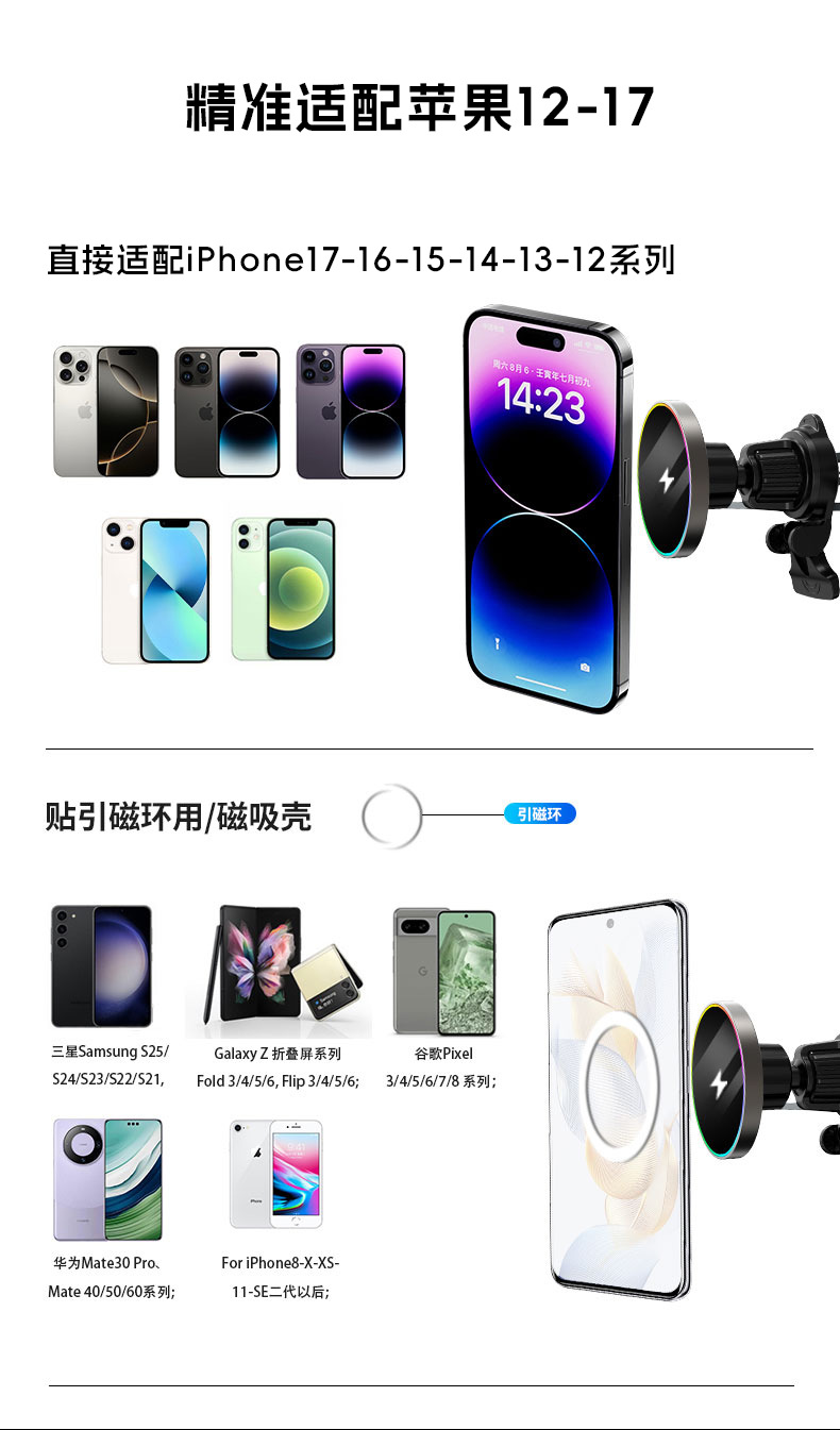 购买须知:此款车载磁吸无线充,磁吸适配iPhone17/16/15/14/13/12,谷歌 Google Pixel 10系列,其他安卓机型如三星Samsung Galaxy S26/S25,华为LG需手机自身支持无线充,再搭配磁吸手机壳或引磁片使用。