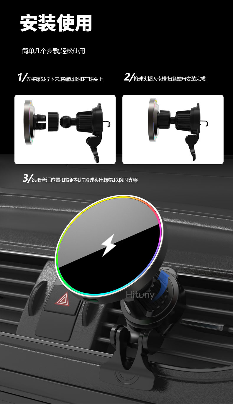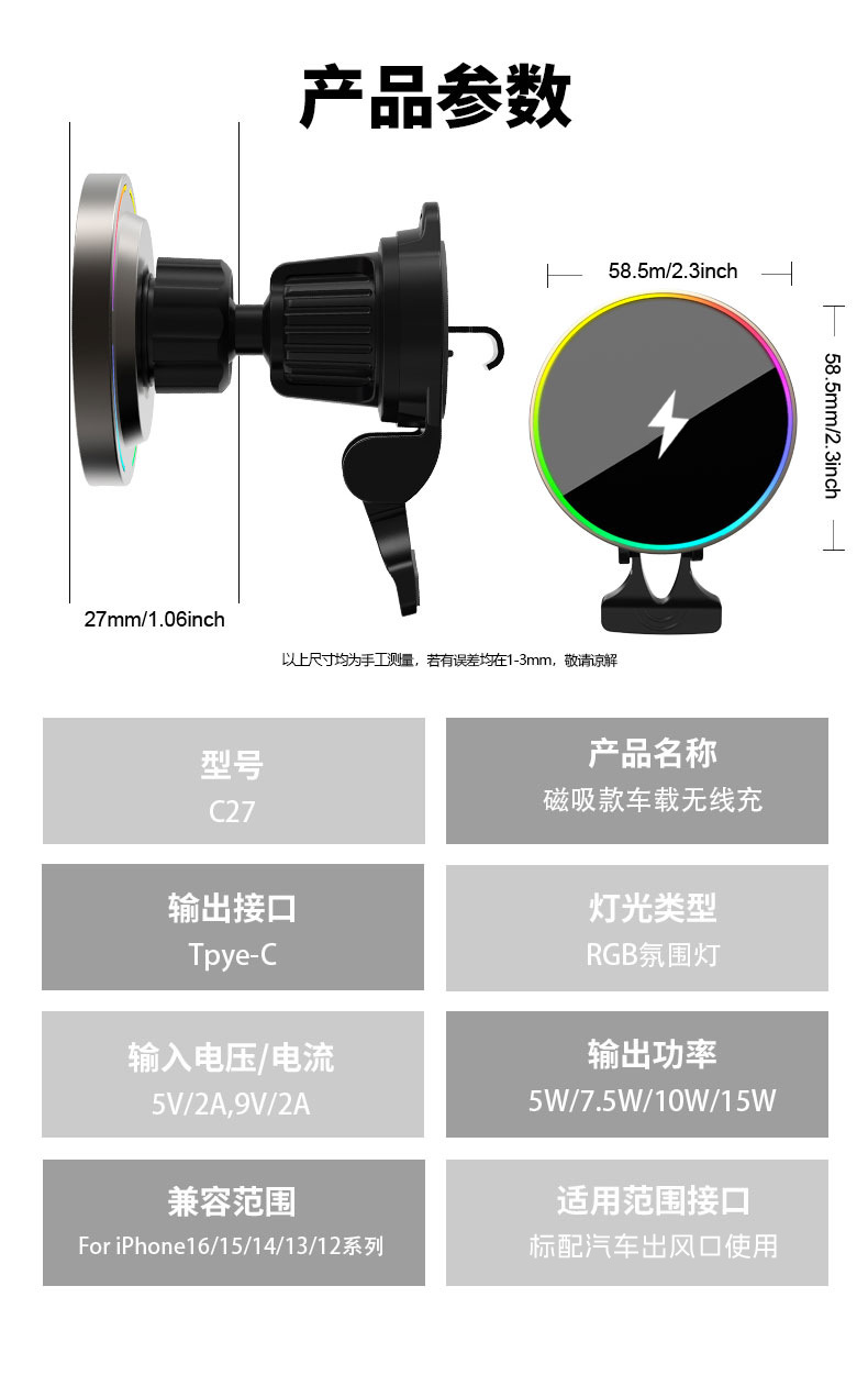 【包装清单】无线充,出风口夹子,1米A-C配线,中英文说明书,英文彩盒包装。