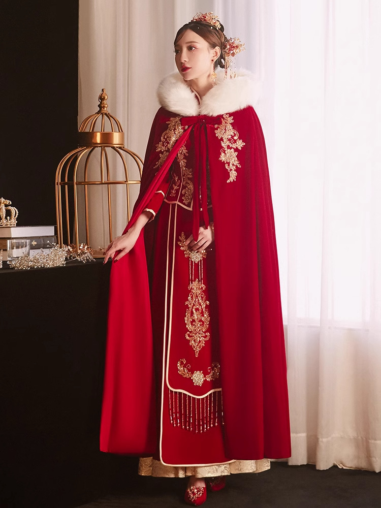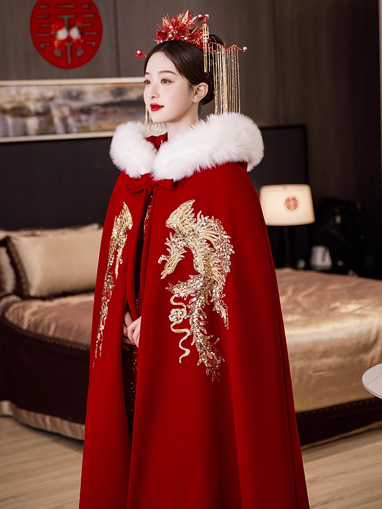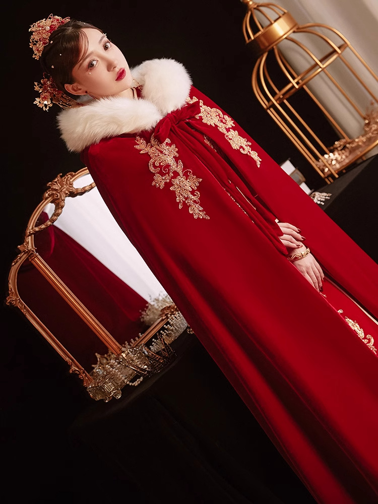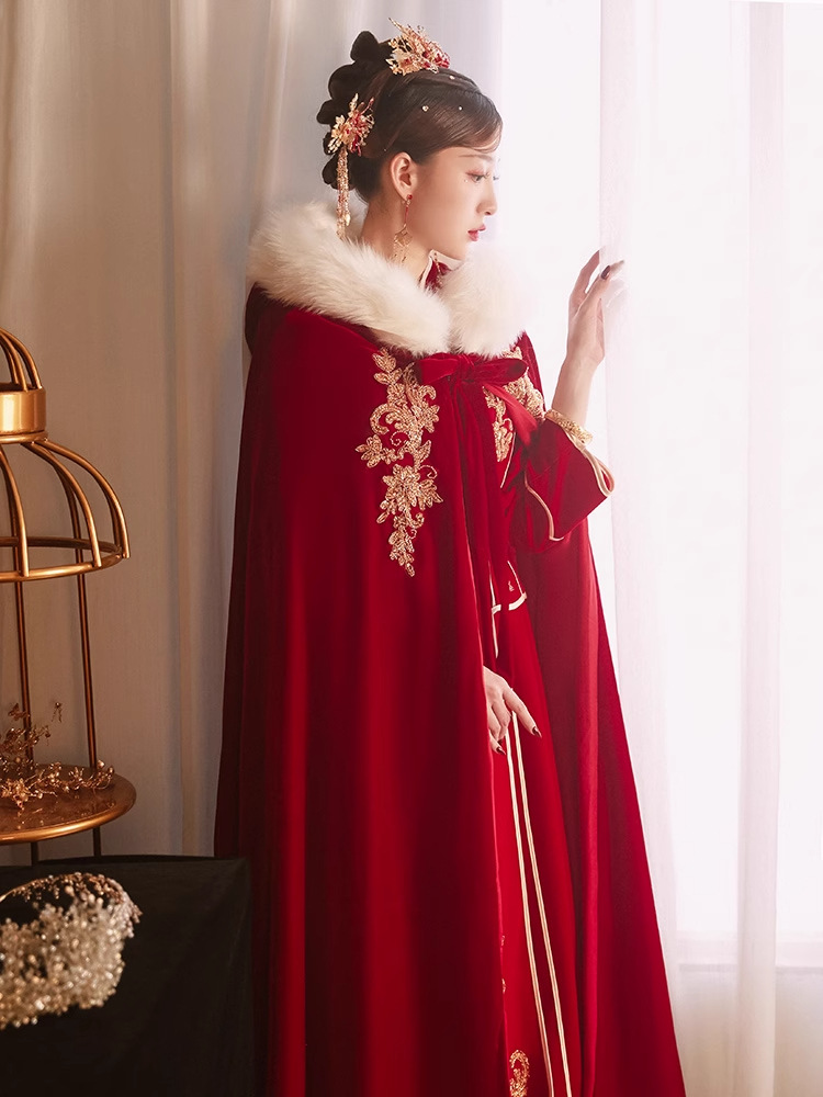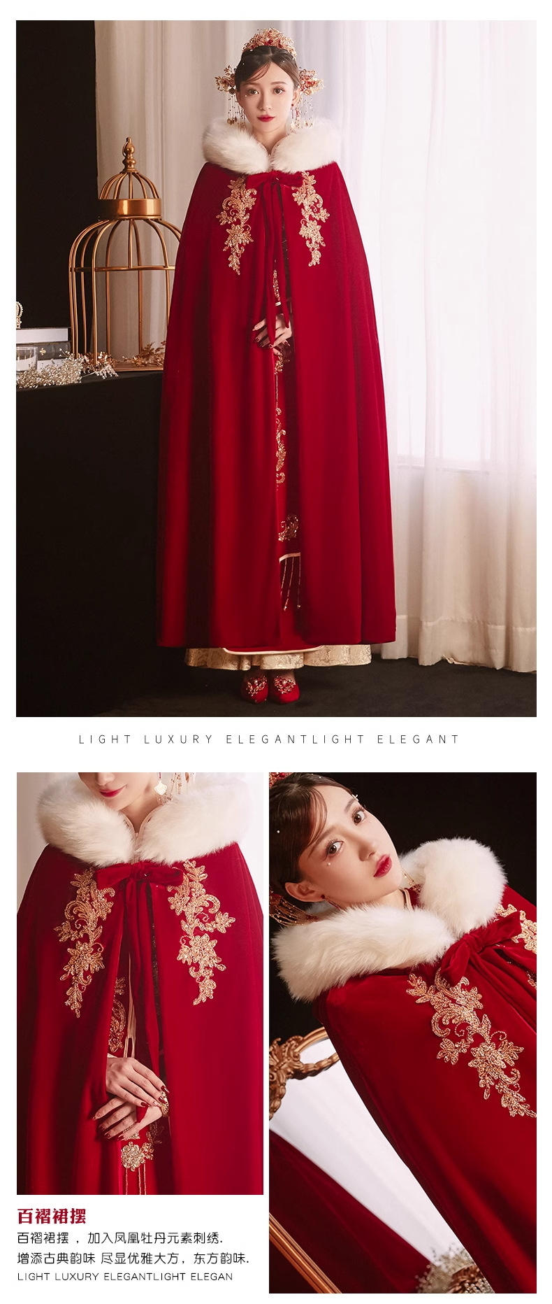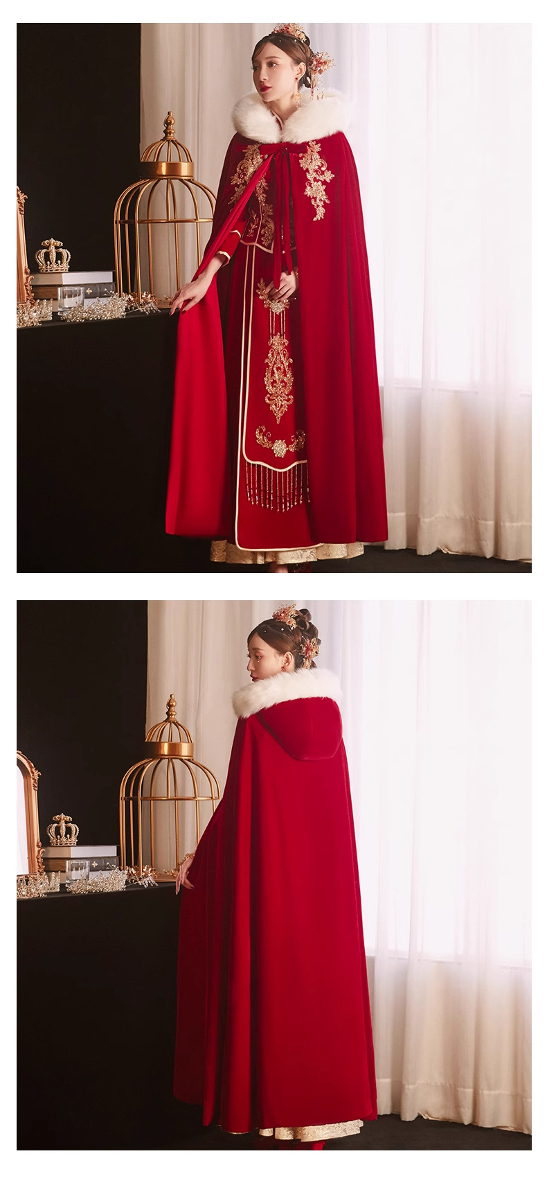Зимний ханьфу-шаль, плащ-накидка в стиле сюэ, китайский свадебный плащ для невесты на флисовой подкладке, женский длинный красный плащ с вышивкой
