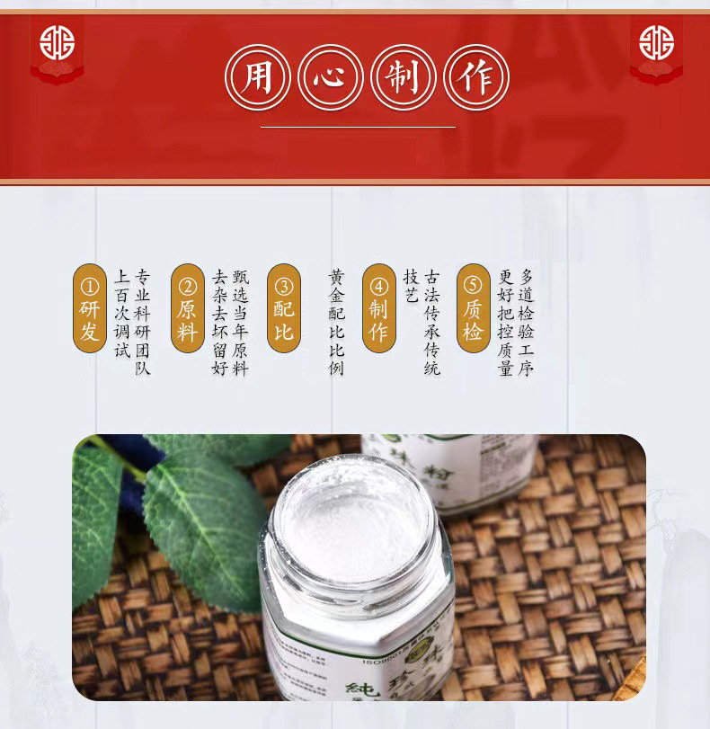 2)每次使用0.05g珍珠粉(约黄豆大小)配合使用爽肤水、乳液/膏霜,均匀涂抹于面部颈部肌肤,轻轻按摩至吸收,长期使用可使肌肤娇嫩透亮,光彩靓丽。