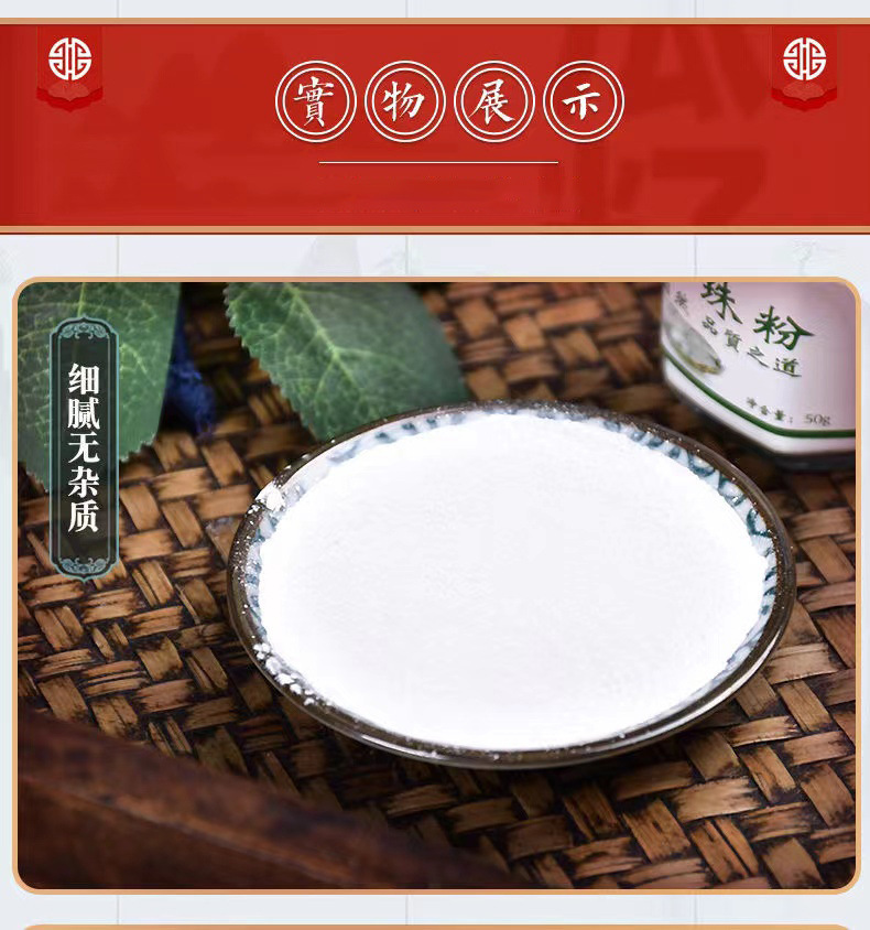 本品以优质珍珠为原料,物理法精制而成,粉质细腻,不破坏珍珠中的营养成分,美颜润肤,长期使用可使肌肤通透细腻、光彩亮丽。