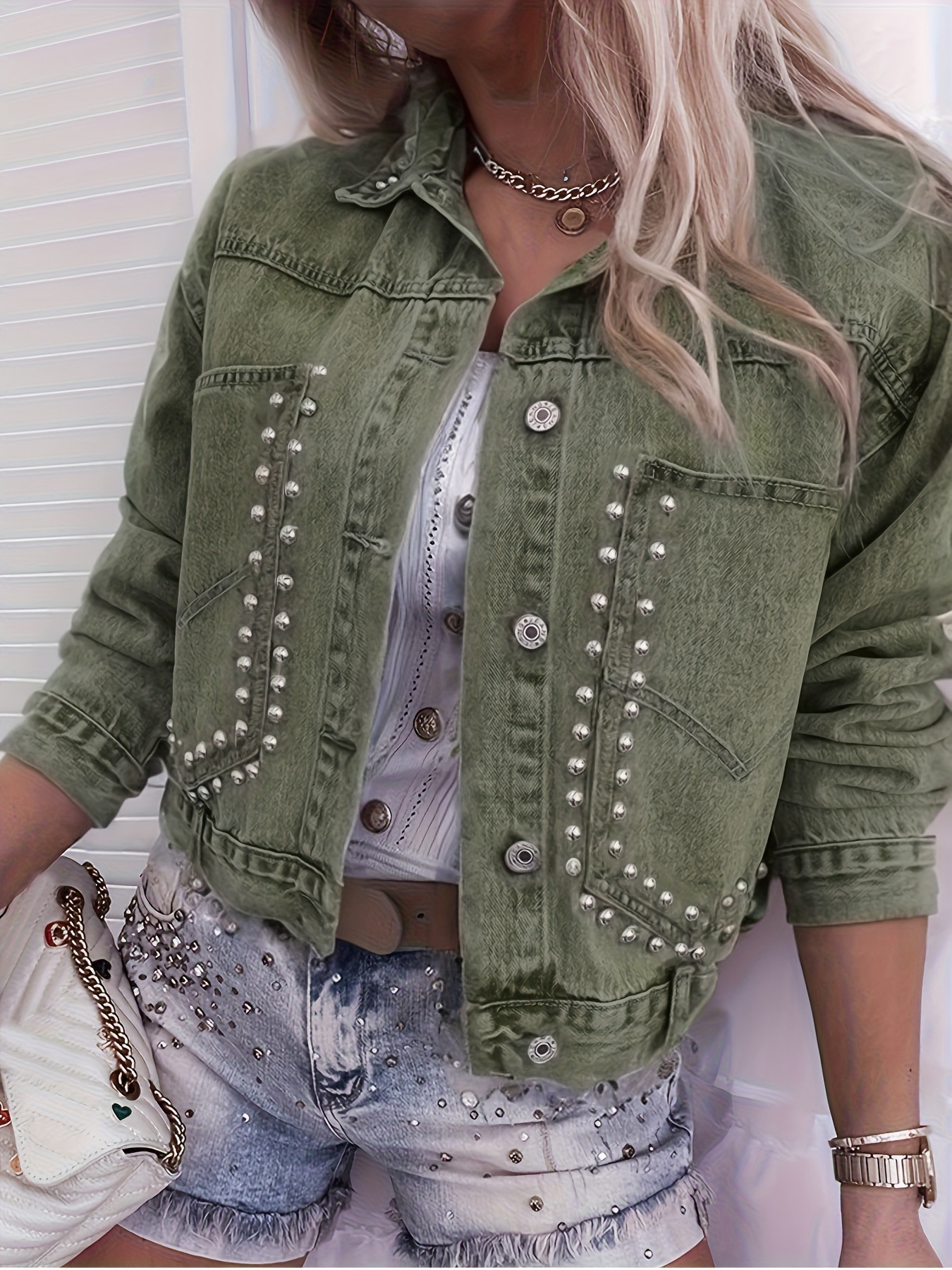 Женская заклепка декоративная джинсовая куртка OVERSIZE с длинным рукавом и отворотом короткая цветная куртка