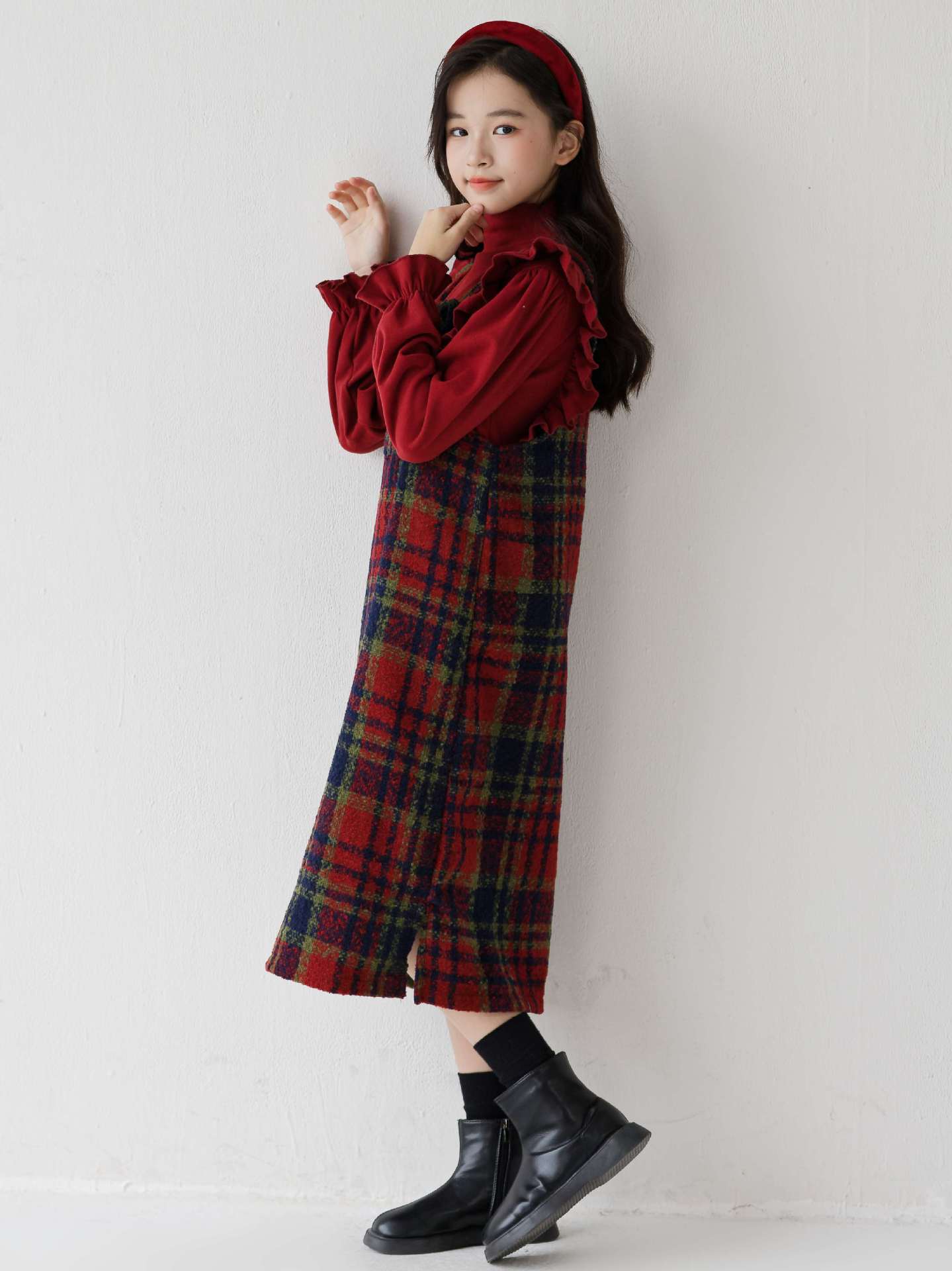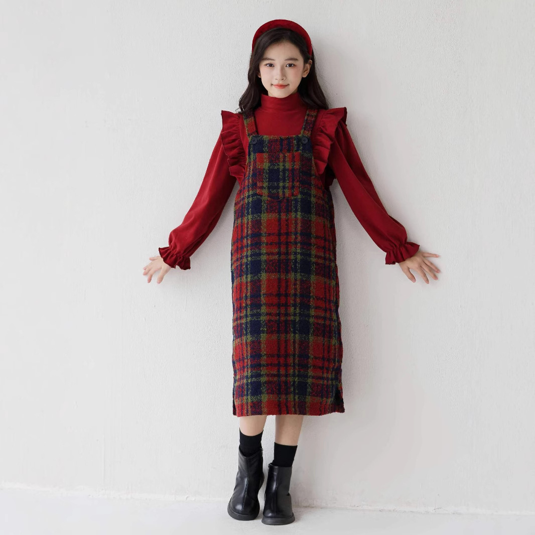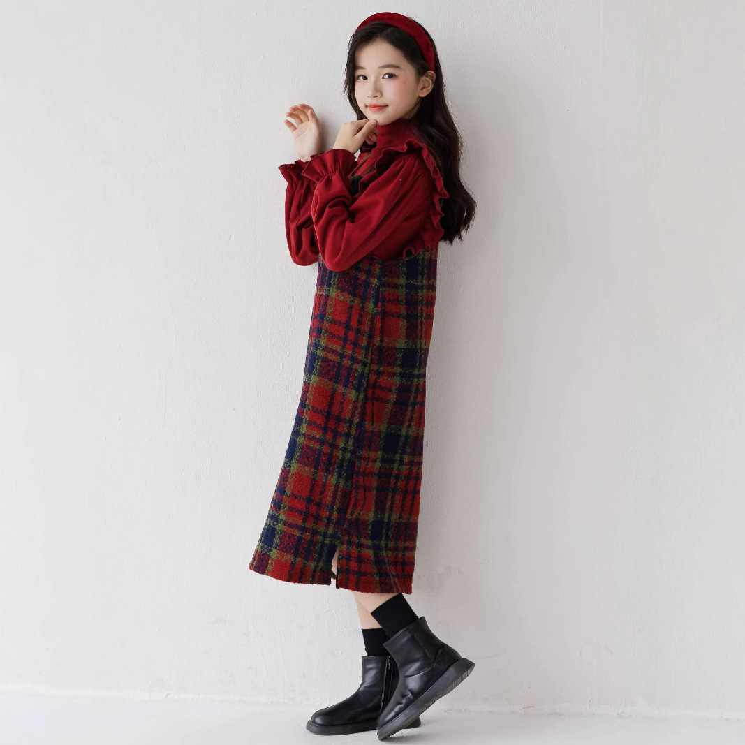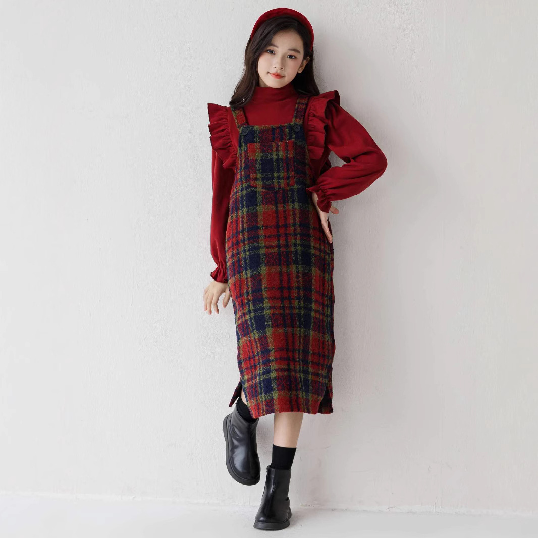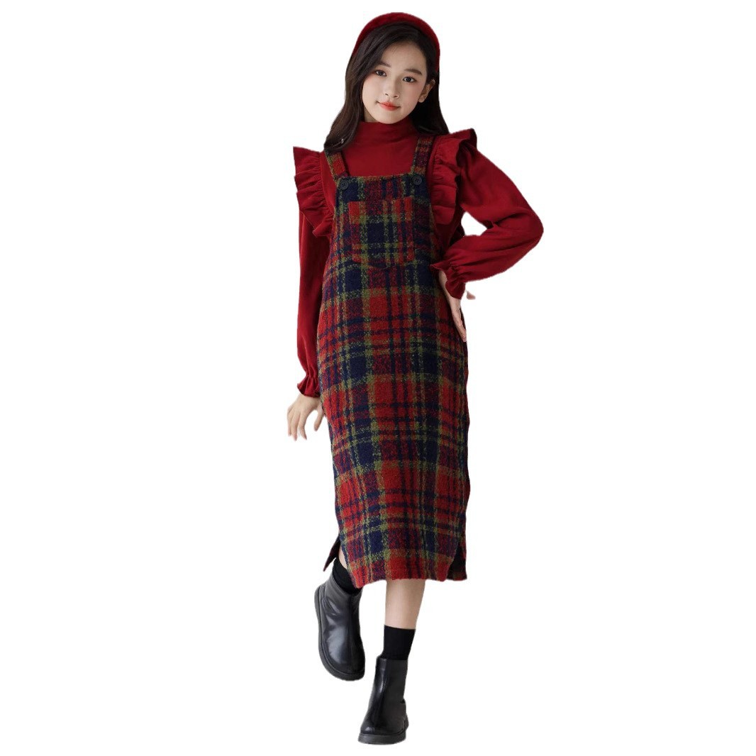 Комплект для девочек на осень-зиму 2026: блузка с рюшами, винтажная клетчатая юбка-сарафан средней длины, новогодний и рождественский комплект.