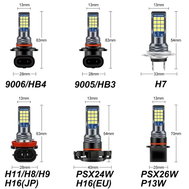 H1; H3; H4; H7; H8; H11; 9005; 9006; H10; 880; 881; PSX24W; H16; P13W