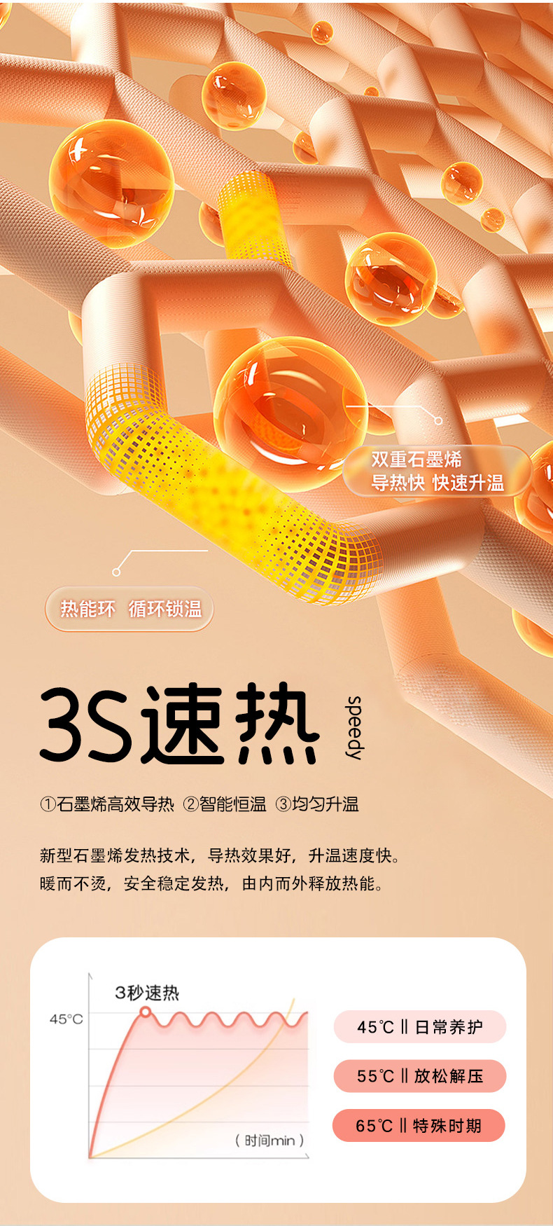 Три уровня горячего компресса, шесть уровней вибрации, модернизированная технология нагрева графеном.
