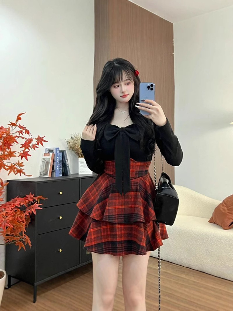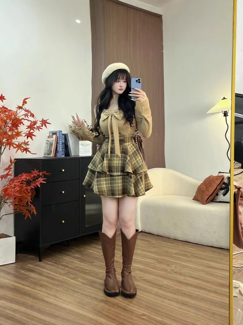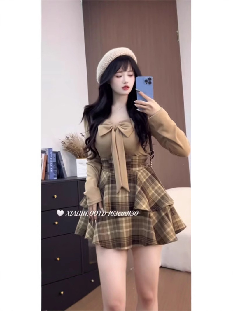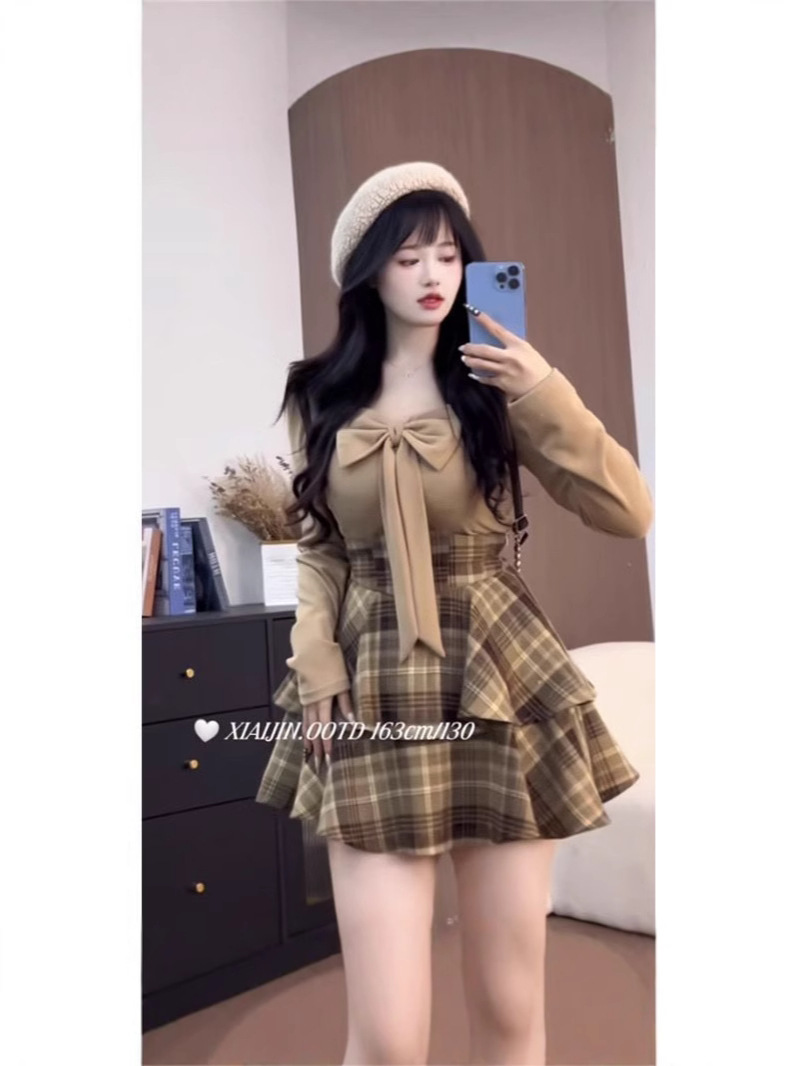 Большой размер толстый мм чистый ветер сладкий горячий девушка с длинными рукавами рубашка женская осенняя и зимняя клетчатая юбка с талией