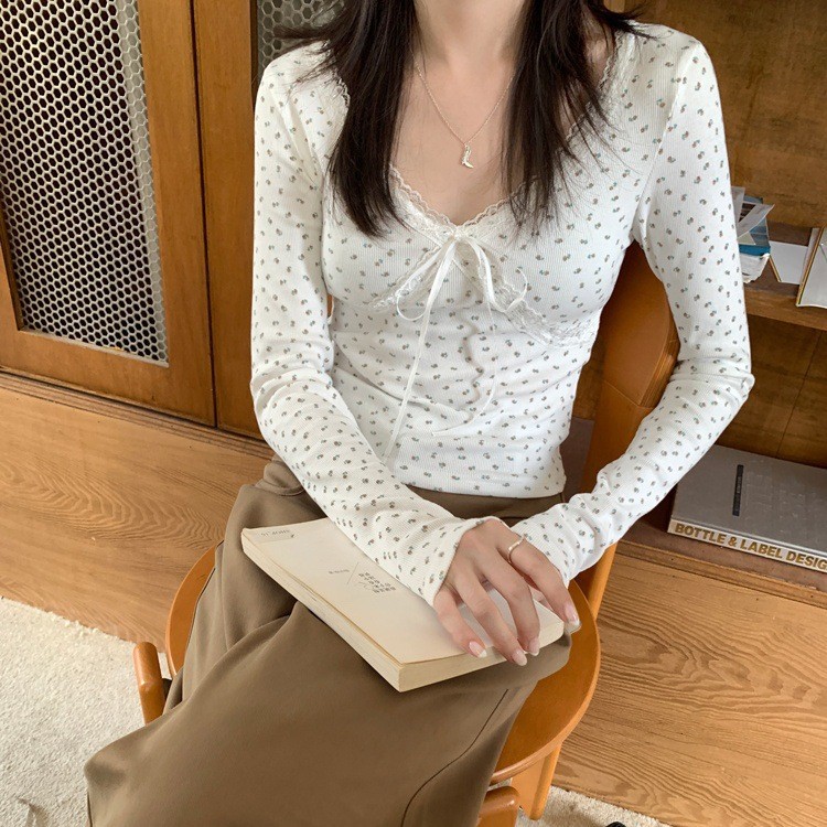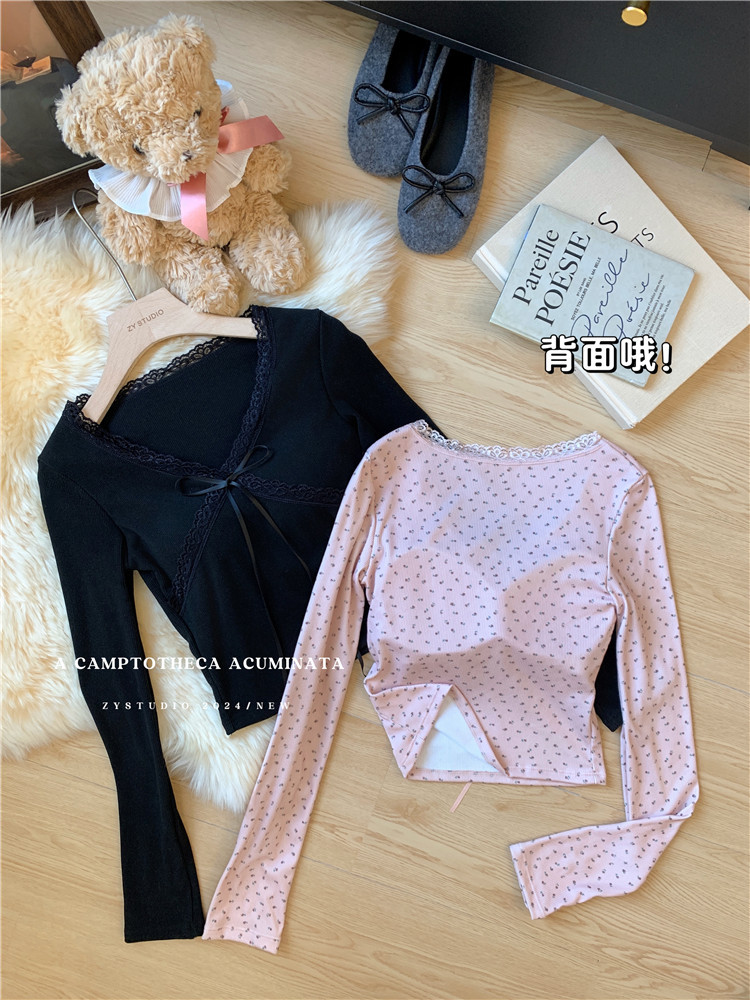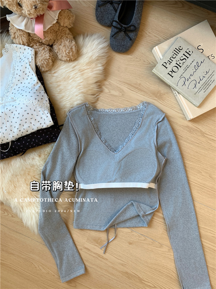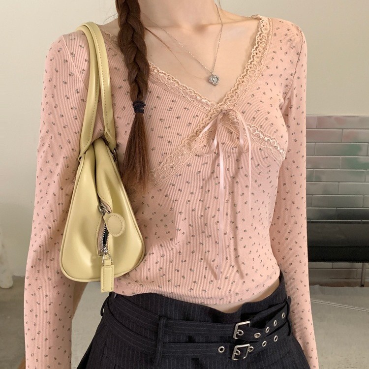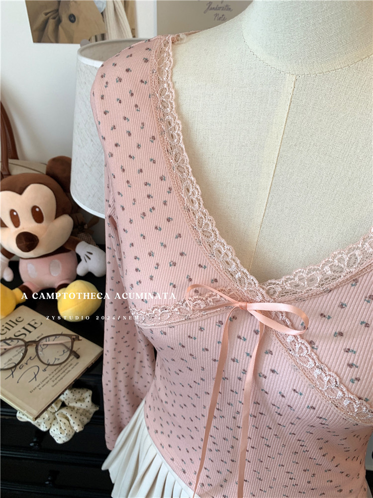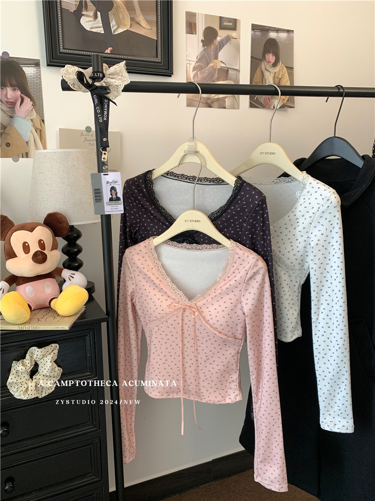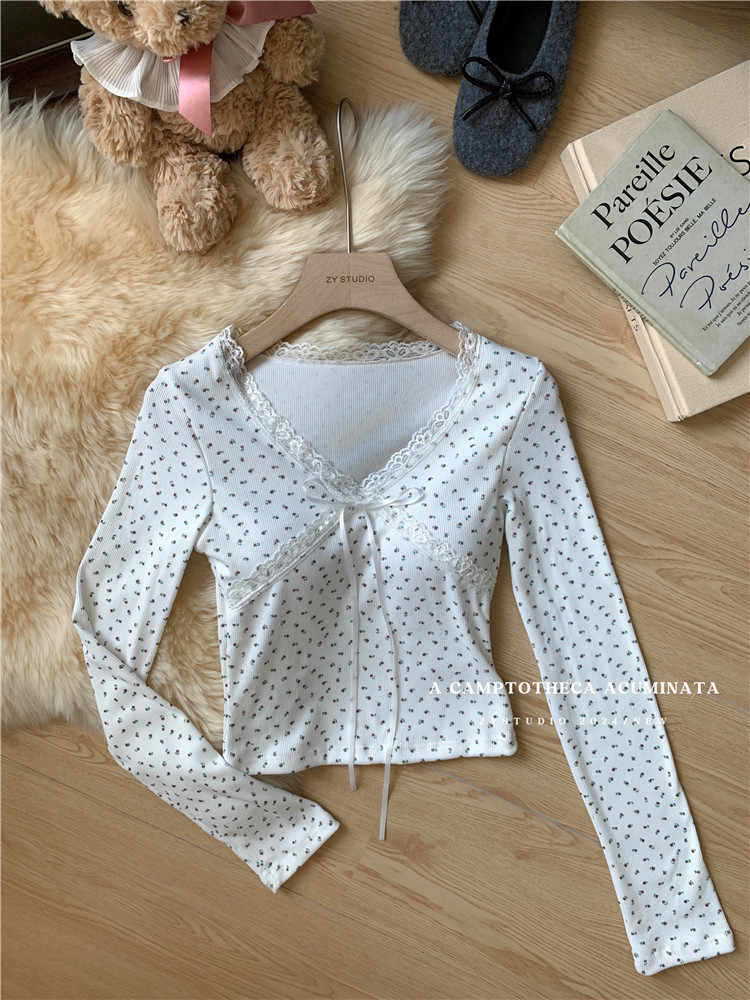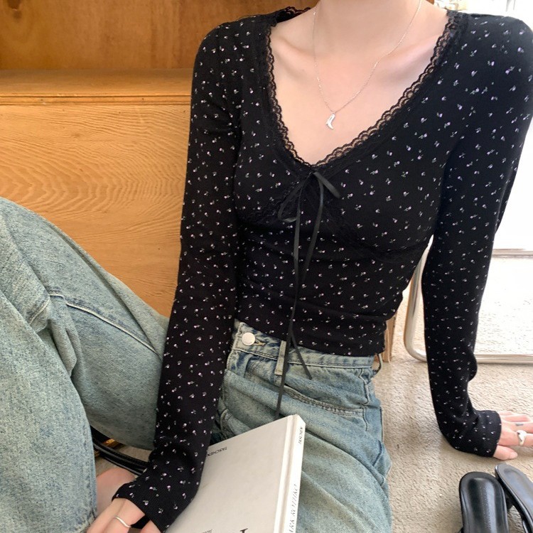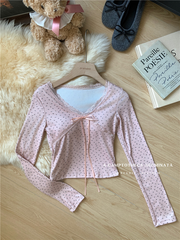 5080 # чистое желание V-образным вырезом кружева сшивания футболка с длинными рукавами Derong Sweet Цветочный Короткий тонкий топ
