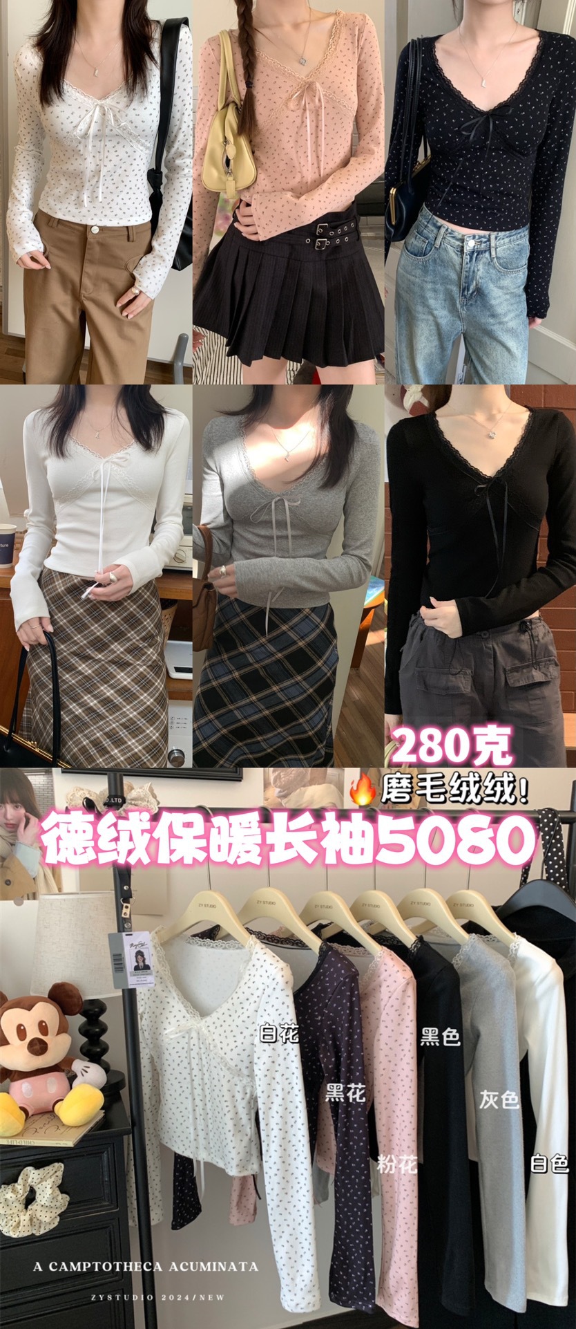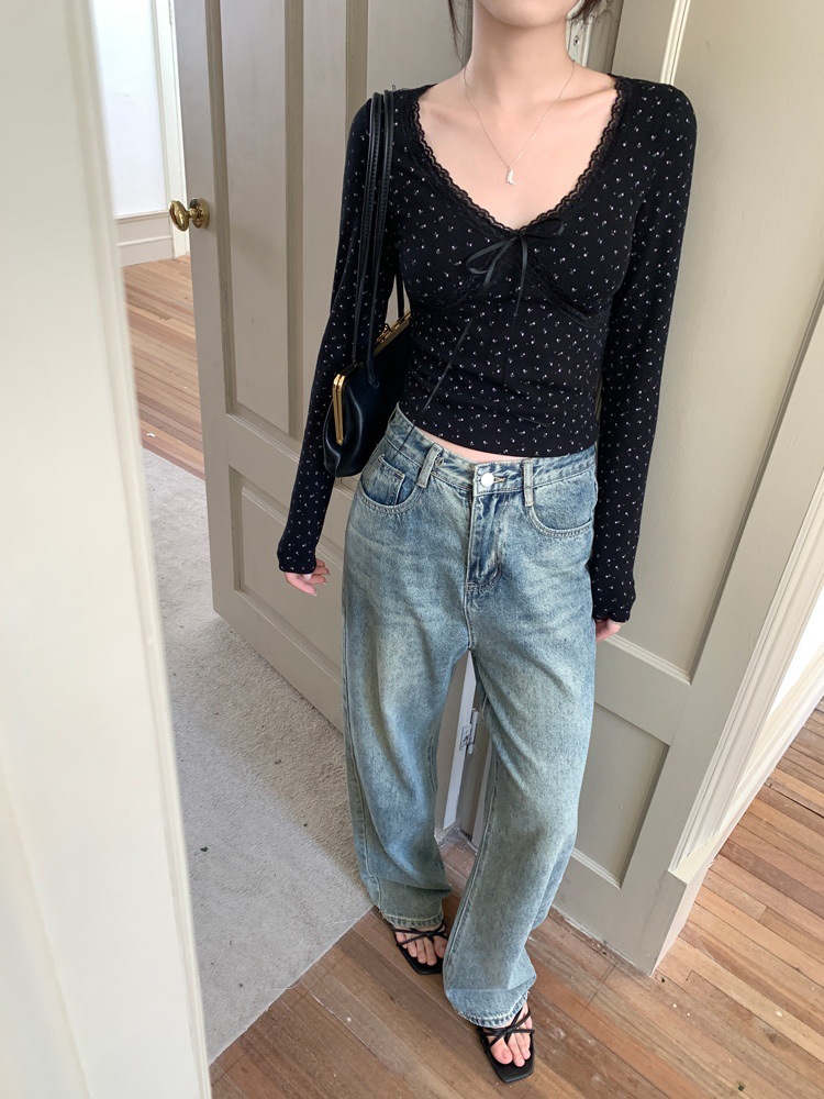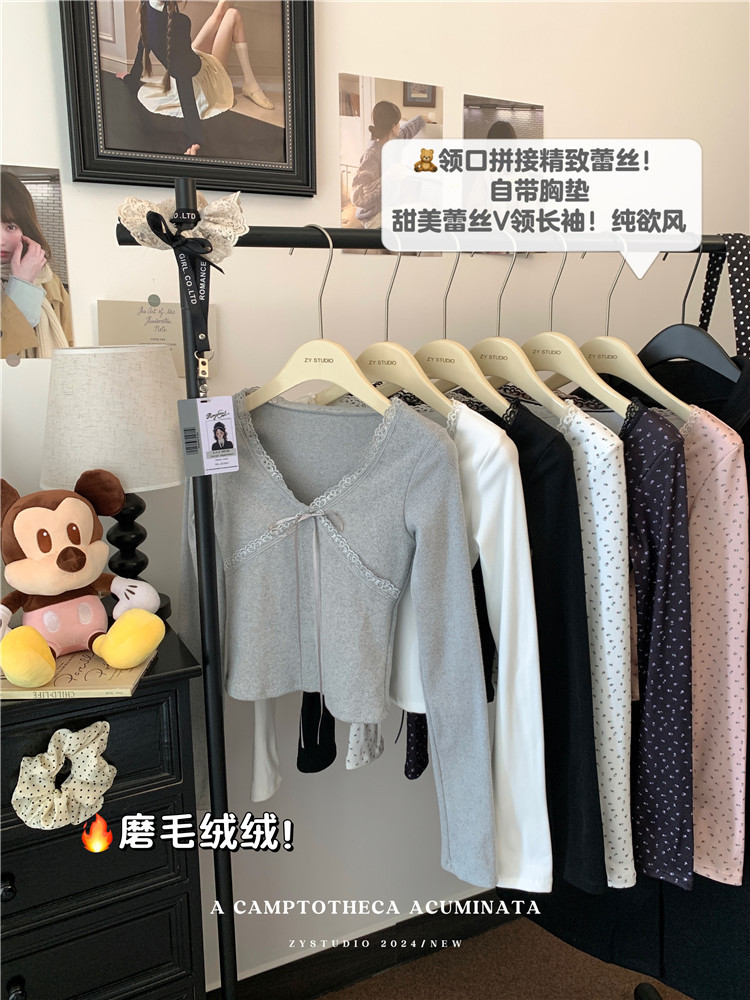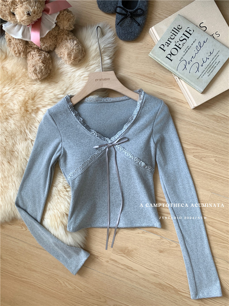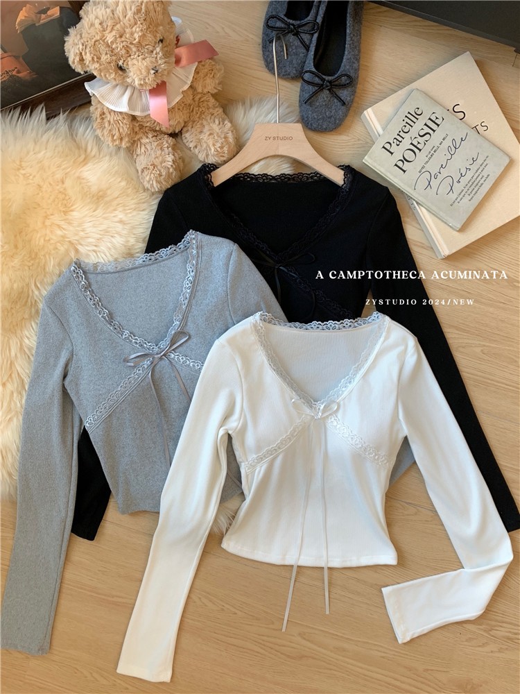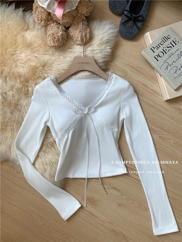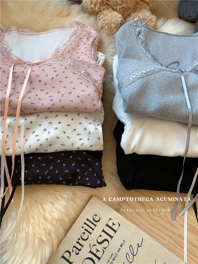 5080 # чистое желание V-образным вырезом кружева сшивания футболка с длинными рукавами Derong Sweet Цветочный Короткий тонкий топ