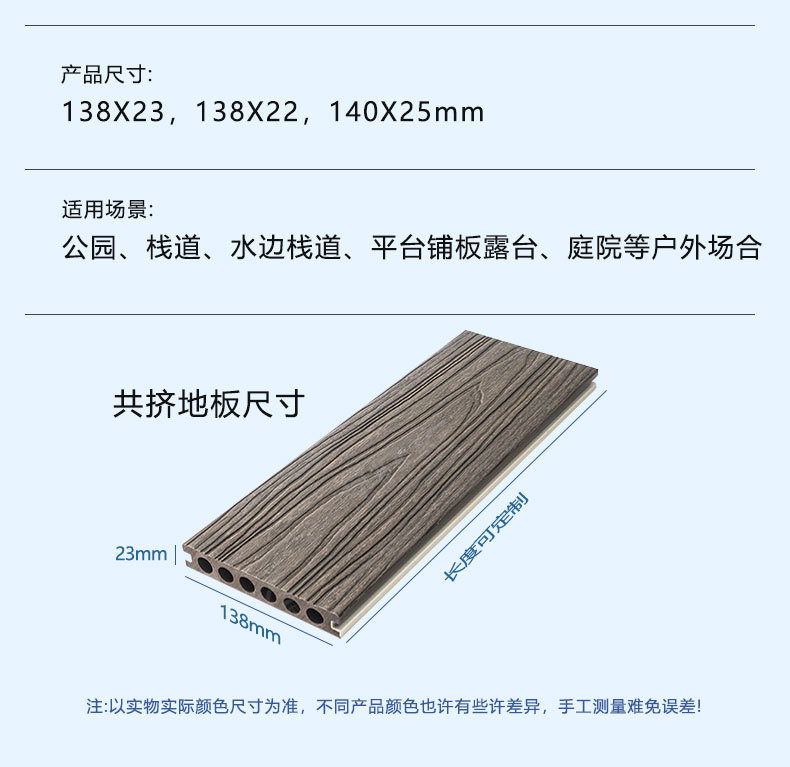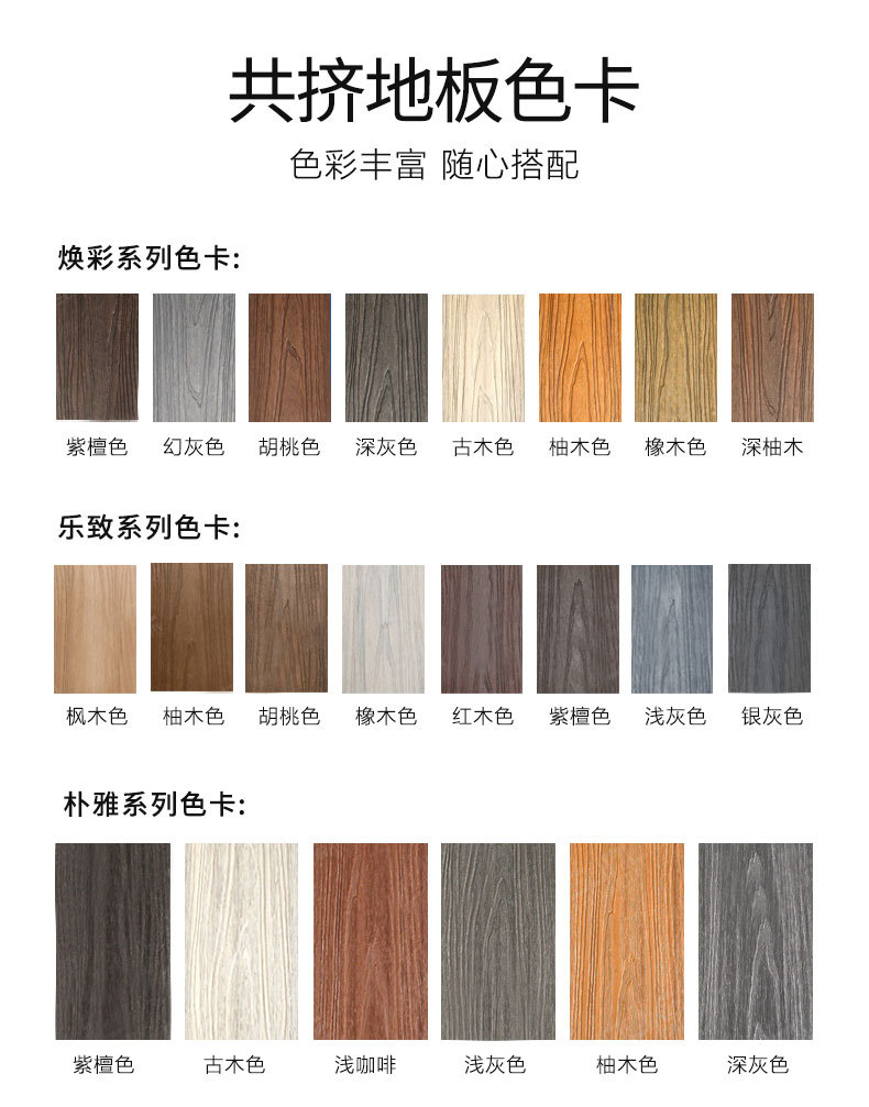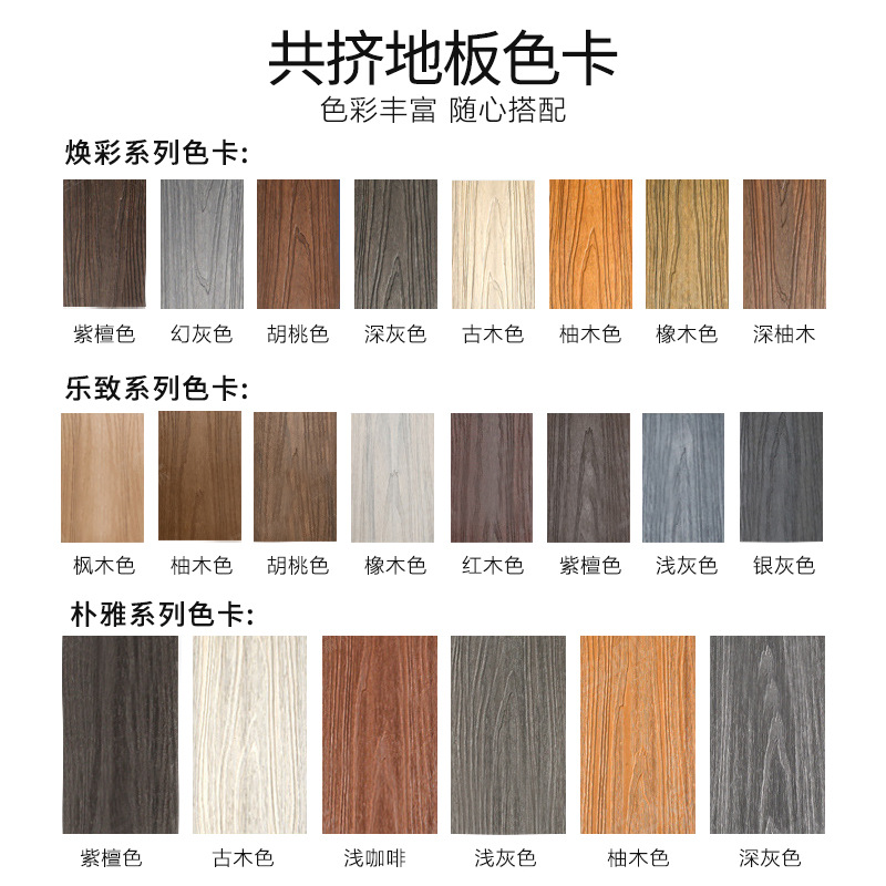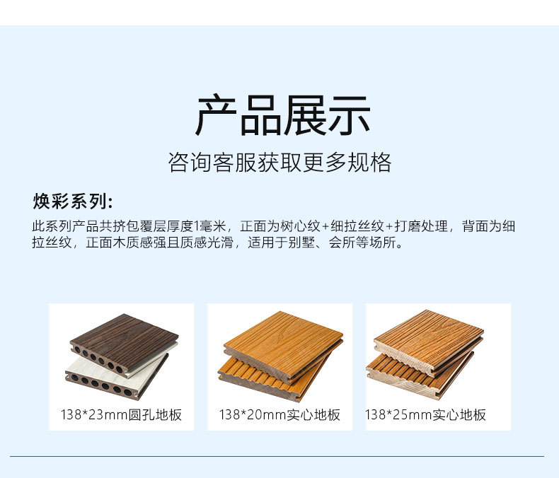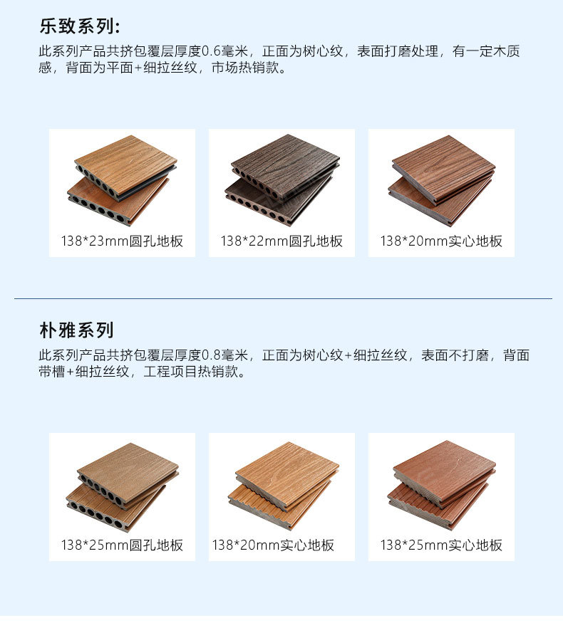 Деревянный пол с квадратными отверстиями первого поколения 140*25 мм; 150*25 мм пластиковый деревянный пол первого поколения с квадратными отверстиями; 140*25 мм, экструдированный тонкий пластиковый деревянный пол первого поколения с круглыми отверстиями; Пластиковый деревянный пол с круглыми отверстиями первого поколения 145*23 мм; 165*30 мм3D тисненый пол с круглыми отверстиями; Твердый пол 100*20 мм; Твердый пол 140*20 мм.; Твердый пол 140*30 мм.; Твердый пол 146*26 мм