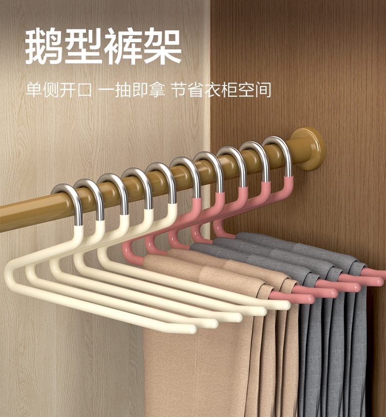 Кремовая вешалка для брюк в форме гусины (вперед); Вешалка для брюк в форме серой гусины (вперед); Вешалка для брюк в форме черной гусины (вперед); Европейская вешалка для брюк в форме розовой гусины (вперед)