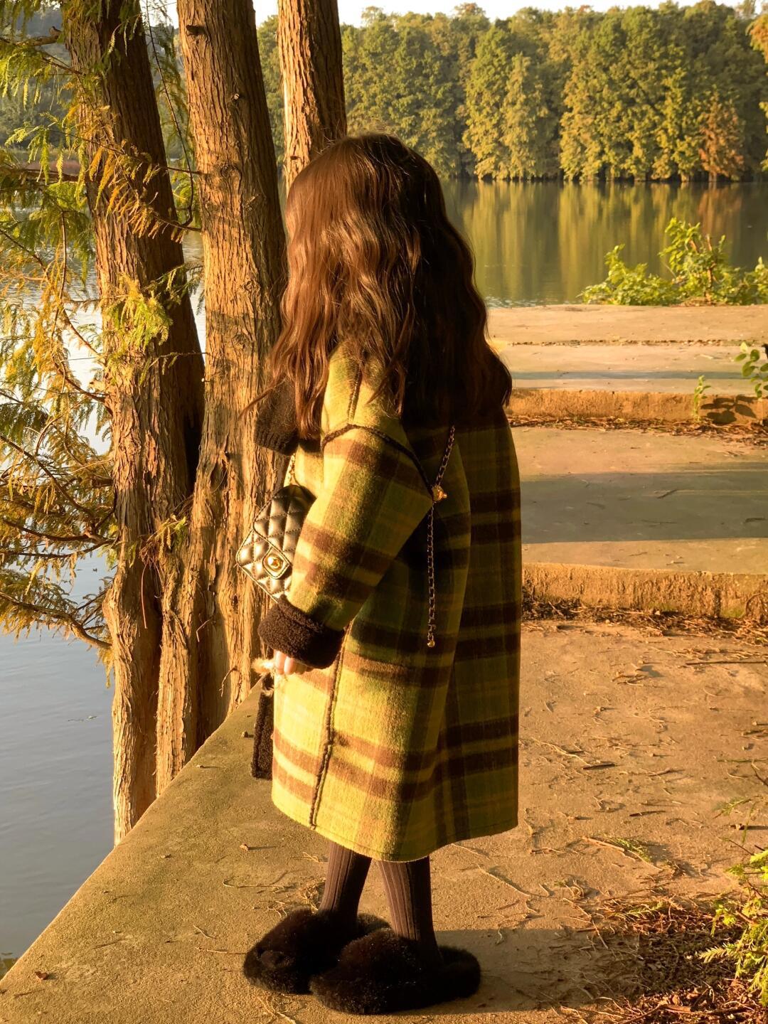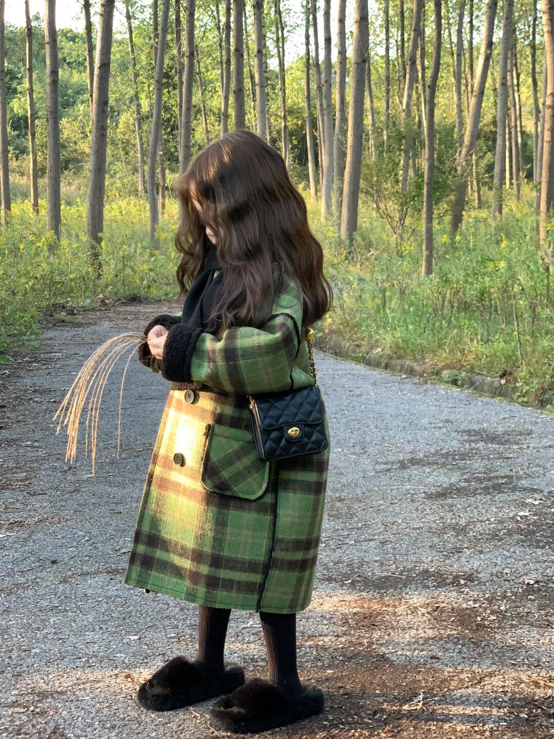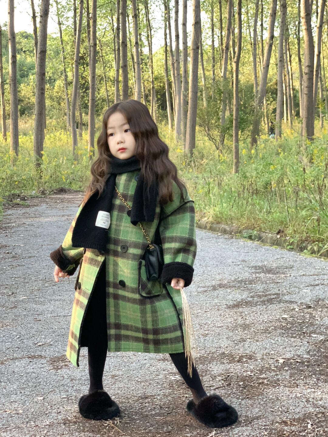 2024 девушки осень и зима утолщенные, теплые двубортные зеленые клетчатые шерстяные пальто средней и длинной шерстяные пальто
