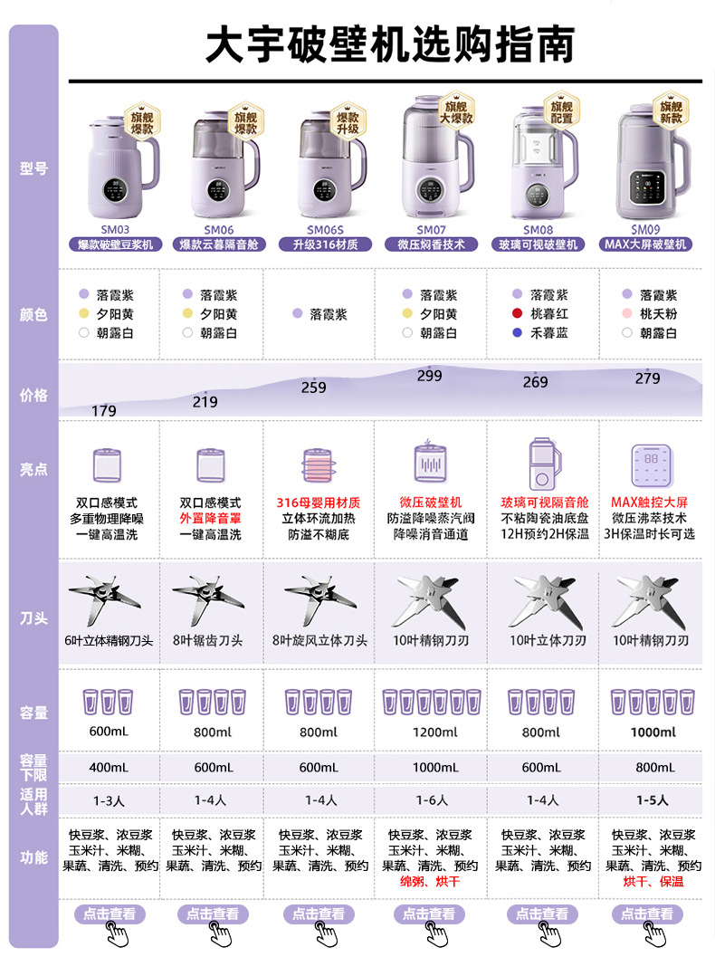 Daewoo DY-SM09 Yunmu машина для соевого молока-тихая модель-белый; Daewoo DY-SM09 Аппарат для соевого молока Yunmu-тихая модель-розовый; Daewoo DY-SM09 Yunmu Машина для соевого молока-Бесшумная модель-Фиолетовый; Daewoo DY-SM07 Машина для производства соевого молока Yunmu-Белая модель-Белый; Daewoo DY-SM07 Машина для соевого молока Yunmu-тихая модель-желтый; Daewoo DY-SM07 Машина для производства соевого молока Yunmu-Тихая модель-Фиолетовый; Daewoo DY-SM06 Машина для соевого молока Yunmu-тихая модель-белый; Daewoo DY-SM06 Машина для соевого молока Yunmu-тихая модель-желтый; Daewoo DY-SM06 Машина для соевого молока Yunmu-Бесшумная модель-Фиолетовый