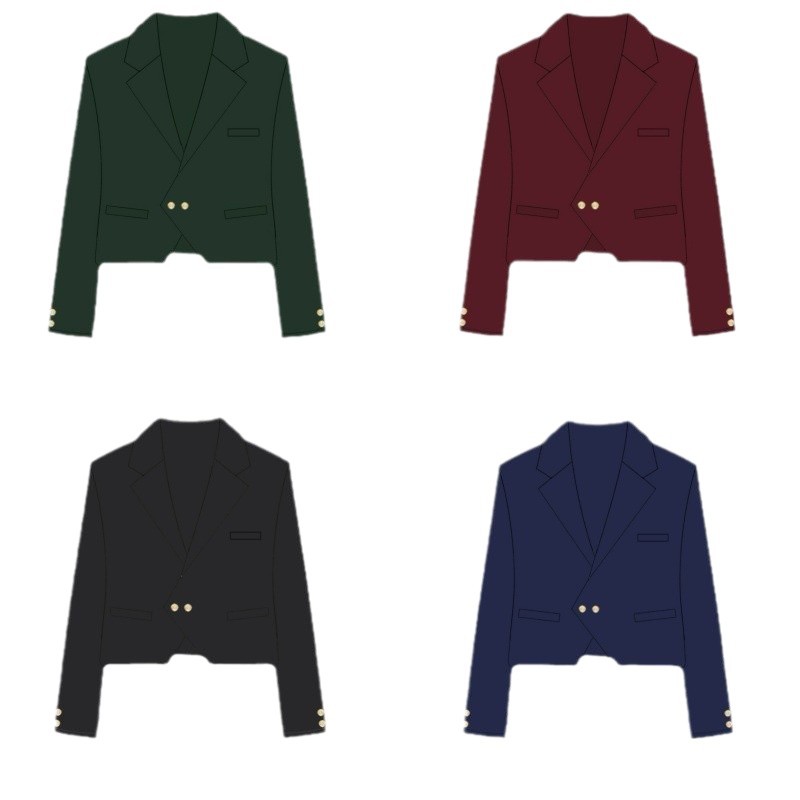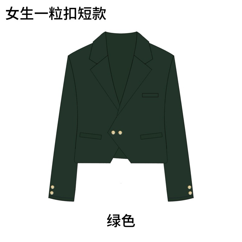 Красный короткий костюм для девочек на одной пуговице.; Зеленый короткий костюм для девочек на одной пуговице.; Черный короткий костюм на одной пуговице для девочек.; Короткий костюм для девочки на одной пуговице.