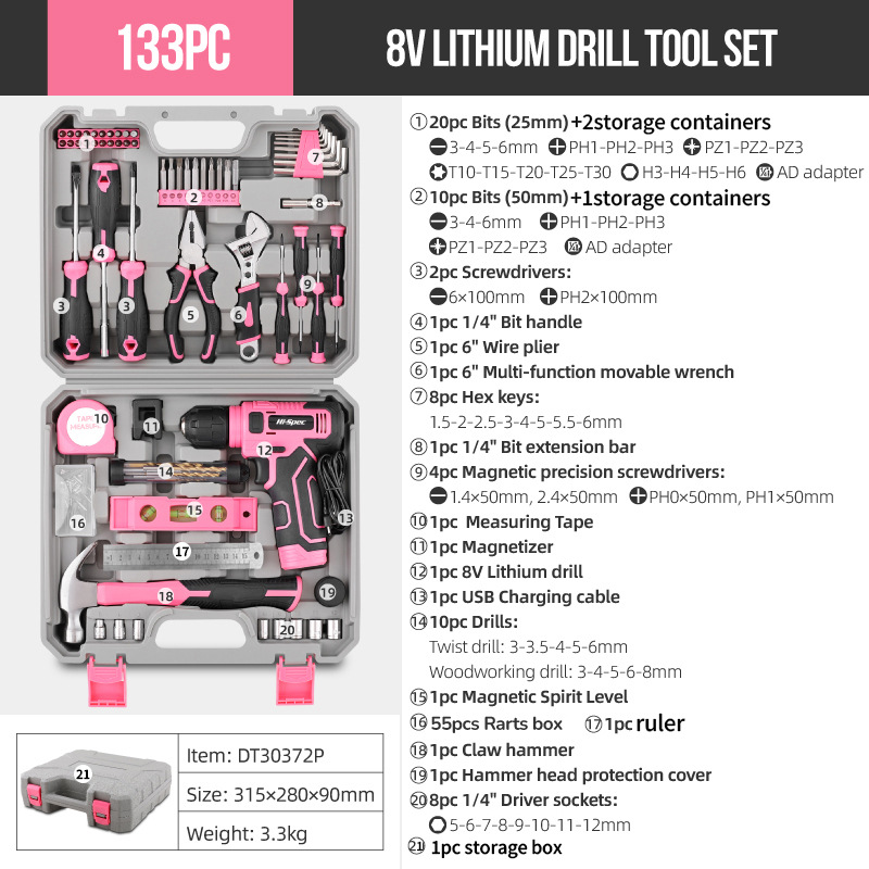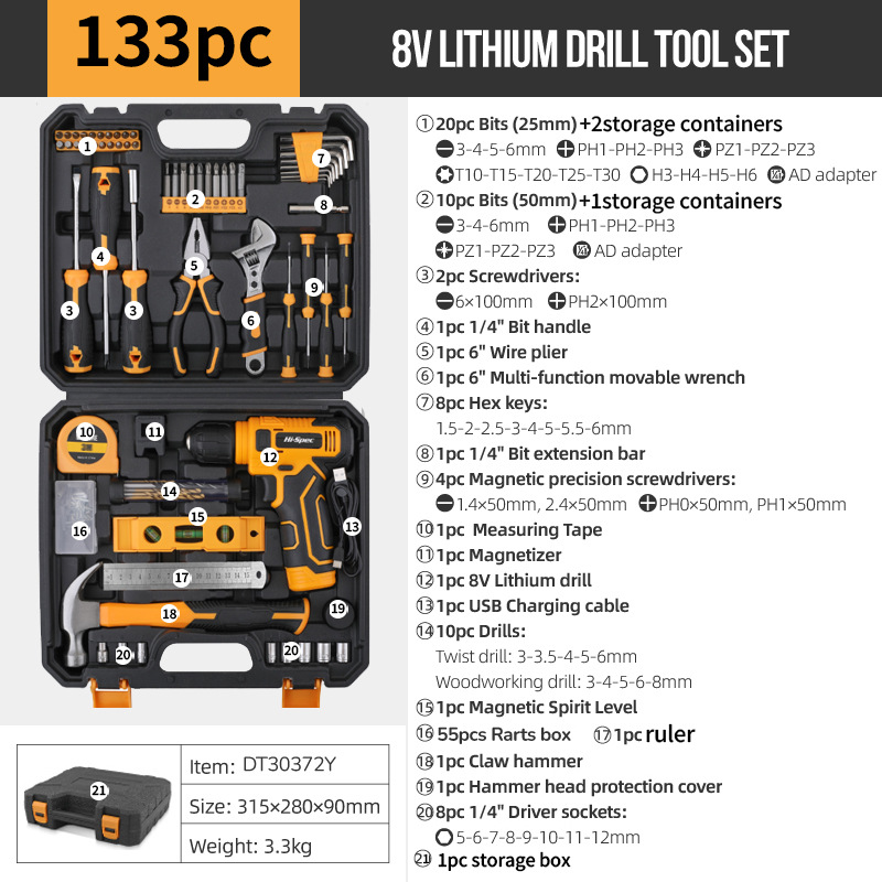 Набор электроинструментов Hi-Spec: 133 предмета, 8В литиевая дрель-шуруповерт, многофункциональный бытовой компактный инструмент в кейсе