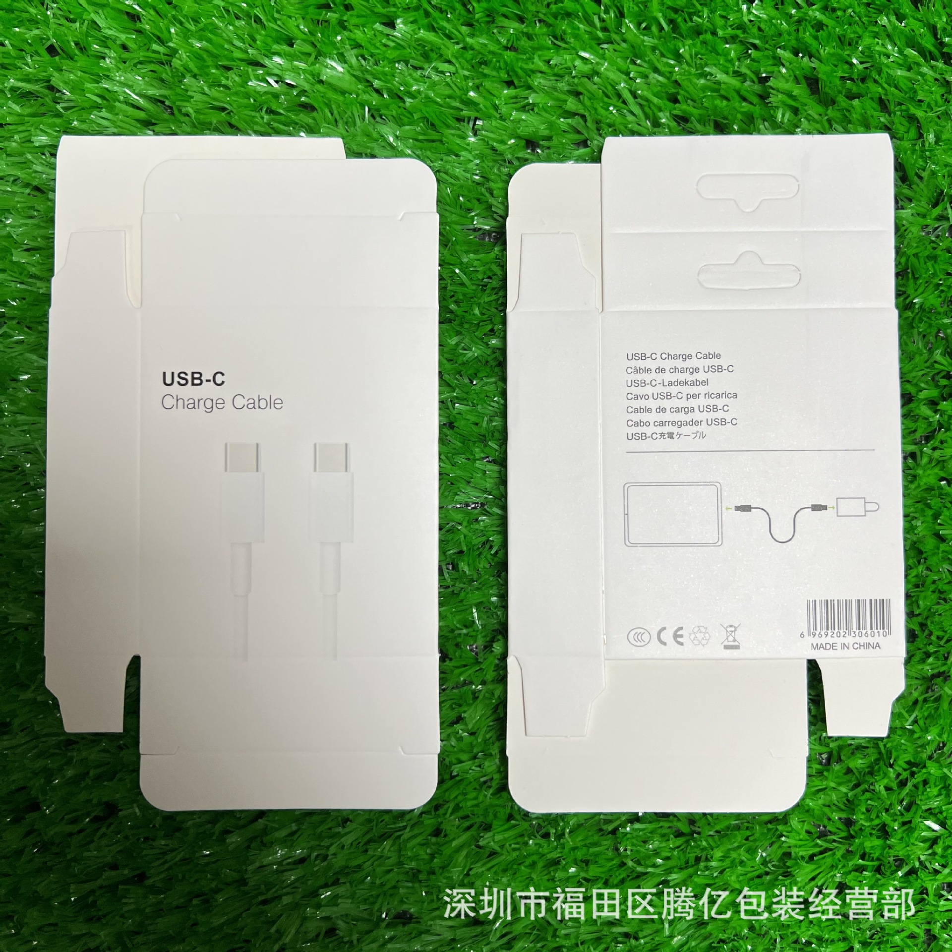 深圳市福田区腾亿包装经营部 【产品名称】双Type-c数据线中性包装盒 【配件】单纸盒 【功能】适用于1米Type-c to Type-c线中性包装盒 【规格】尺寸2.1*6.8*8cm 【备注】承接OEM订单,只要有量可订做可丝印LOGO
