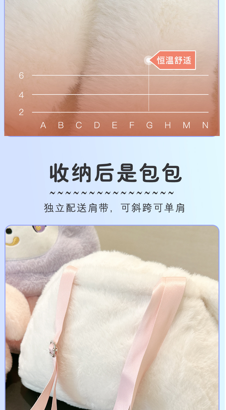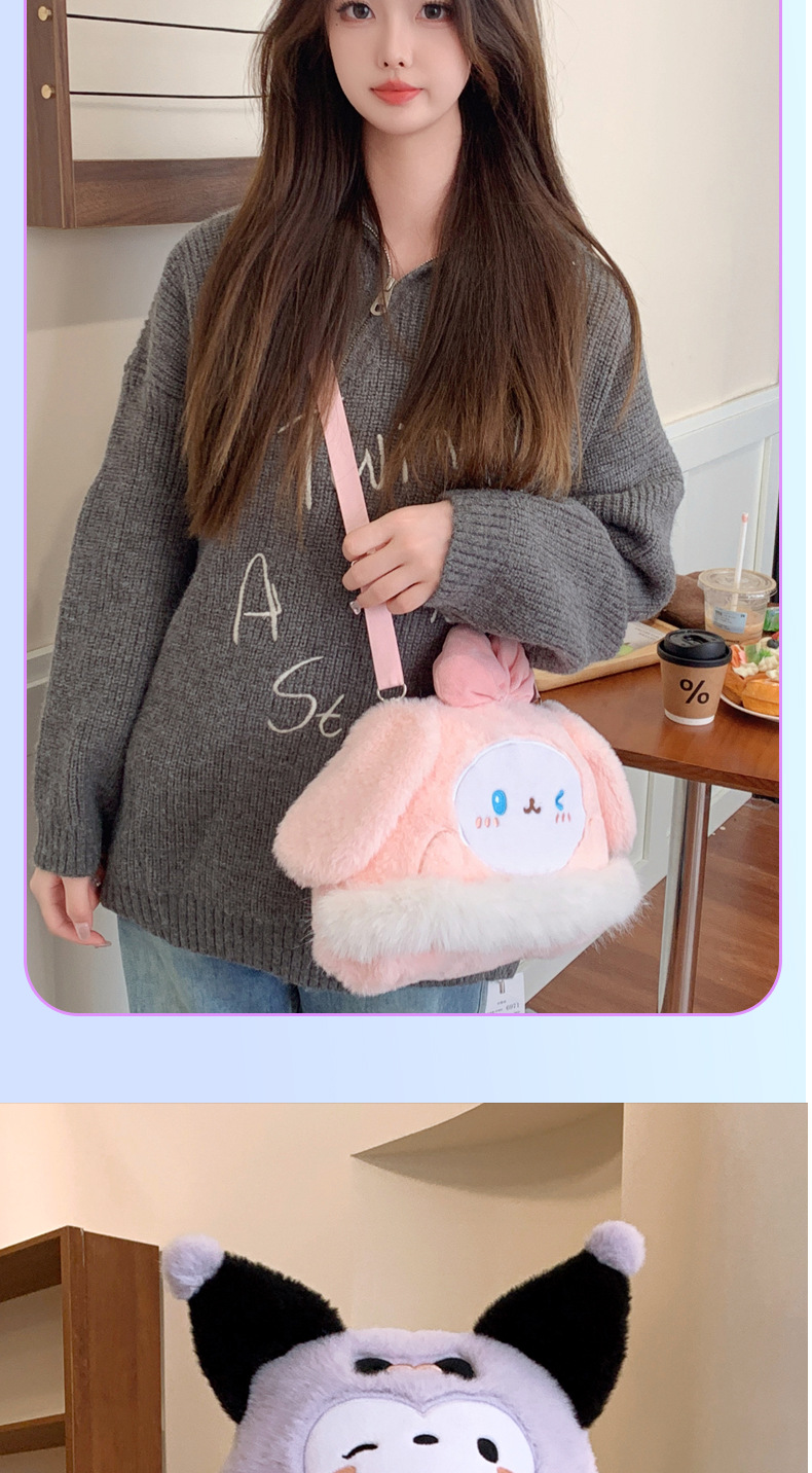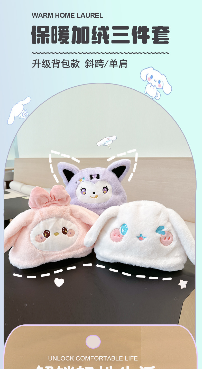 Бараничный бежевый — высококачественный бархат и утолщенный комплект из трех предметов для сумок двух назначения.; Белый ягненок — высококачественный бархатный утолщенный комплект из трех предметов для двух целей сумок.; Ягнено-розовый — высококачественный бархатный утолщенный комплект из трех предметов для сумок двух целей.; Панда — высококачественная бархатная утолщенная сумка-тройка двойного назначения.; «Корица Собака» — высококачественный бархат и утолщенный комплект из трех предметов, сумка двойного назначения.; Kuromi — высококачественный бархатный утолщенный комплект из трех предметов, сумка двойного назначения.; Melody — высококачественный бархатный утолщенный комплект из трех предметов, сумка двойного назначения.