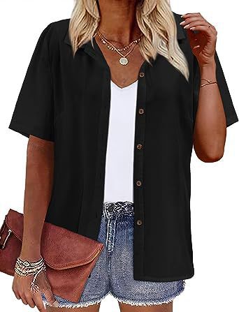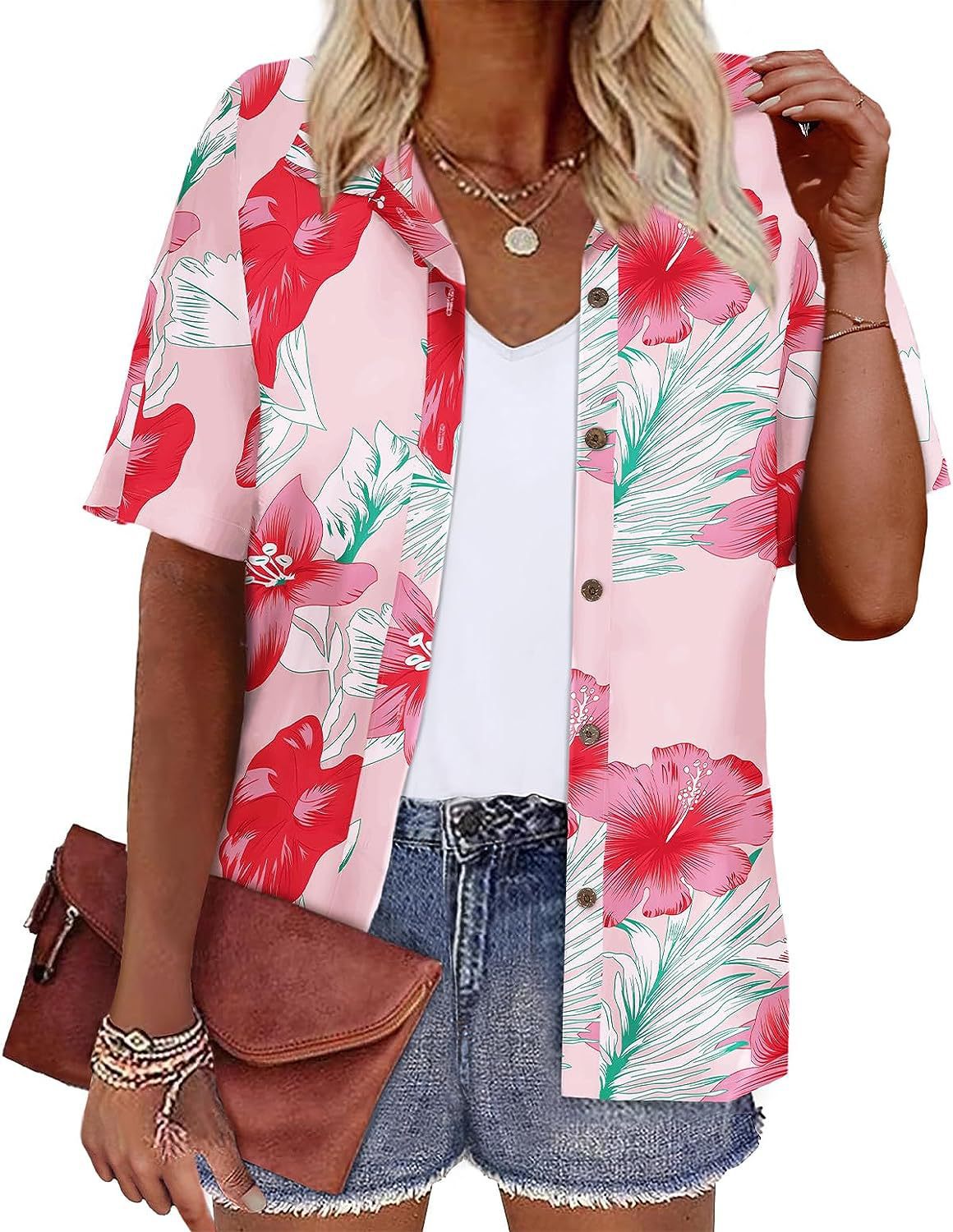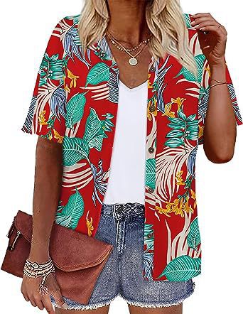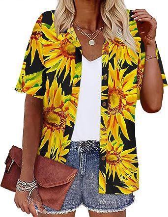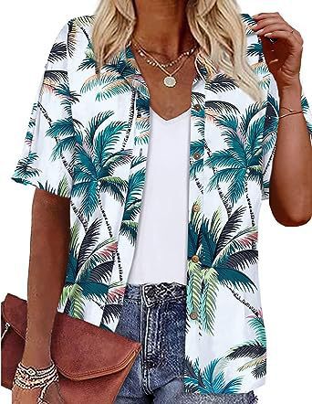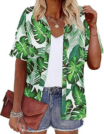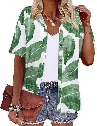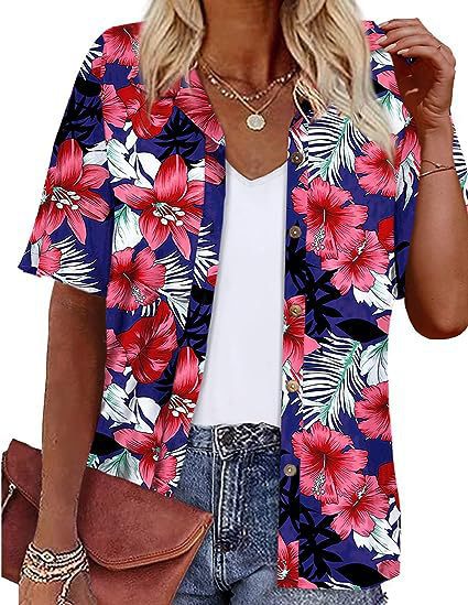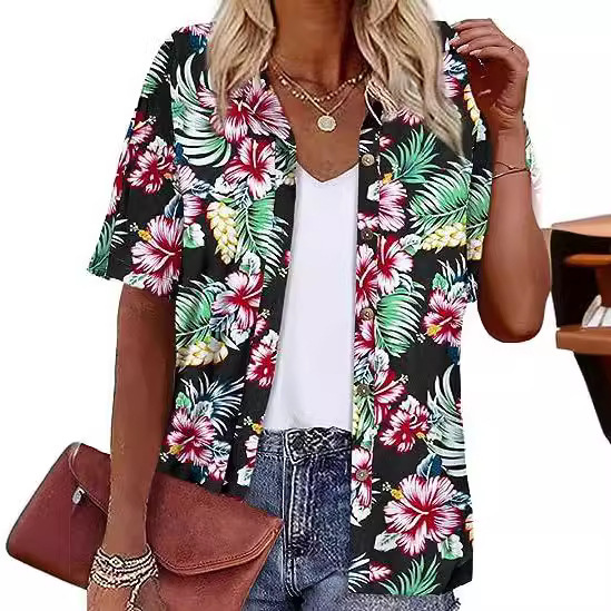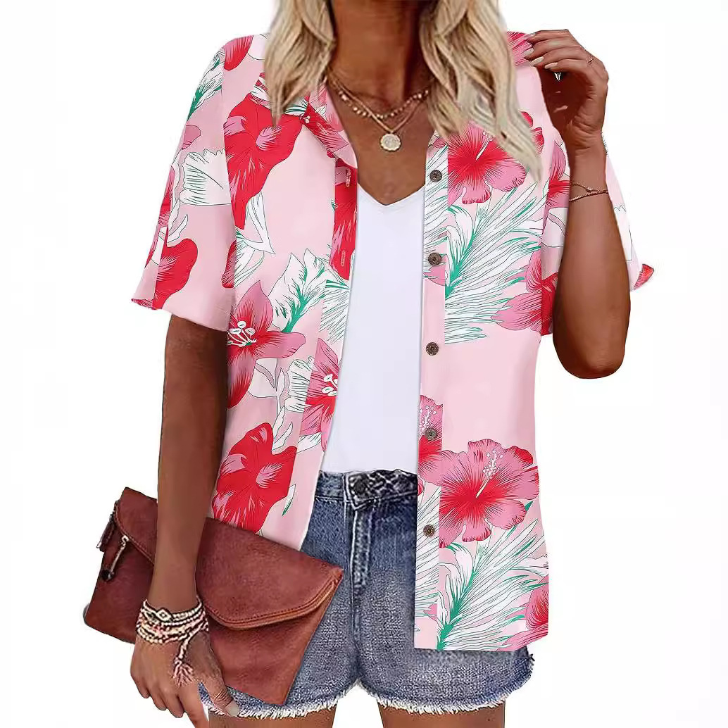 Европейская и американская женская одежда Amazon 2023 летний новый топ с короткими рукавами и лацканами с принтом гавайский стиль женская рубашка