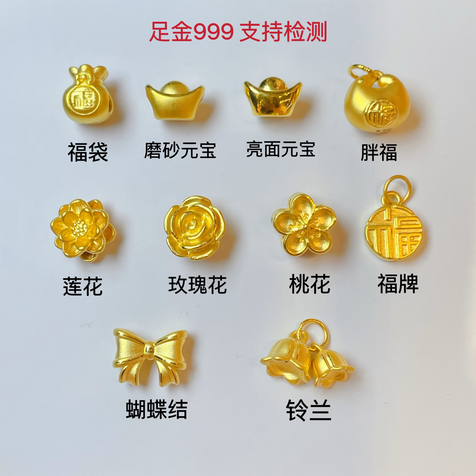 Подвеска-звезда (около 0,1 г); Подвеска в виде лебедя (около 0,1 г); Подвеска в виде подсолнуха (около 0,1 г); Листья абрикоса (около 0,1 г); Подвеска «Хорошие вещи случаются» с арахисом (приблизительно 0,15 г); Роза (около 0,1 г); Роза (около 0,2 г); Роза (около 0,3 г); Талия в горошек (около 0,1 г); Маленькая талия (около 0,3 г); Лотос (около 0,3 г); Цветок персика (около 0,1 г); Цветок персика (около 0,2 г); Персиковый цвет (около 0,3 г); Лотос (около 0,1 г); Лотос (около 0,2 г); Лотос (около 0,3 г); Корона (около 0,3 г); Пиксиу малыш (около 0,1 г); Пиксиу малыш (около 0,2 г); Кольцо Мобиуса (около 0,2 г); полоска Мобиуса (около 0,3 г); Кулон Лотос (около 0,15 г); Стручки лотоса (около 0,15 г); Полая карта Fu (около 0,2 г); Полая карта Фу (около 0,3 г); Абакус (около 0,12 г); Счеты (около 0,22 г); Привлеките богатство и удачу (примерно 0,2 г); Рыбий хвост (около 0,11 г); Полое сердце (около 0,3 г); Бренд Фу (около 0,3 г); Благословение четырех сезонов (около 0,3 г); Принцесса в бегах (около 0,3 г); Кулон с персиковым цветом (около 0,32 г); Шестислоговая мантра (приблизительно 0,22 г); Насколько богатый (около 0,3 г); Хорошая вещь арахис (около 0,3 г); Лилия лесная (около 0,3 г); Два мира радости (около 0,5 г); Хороший хурма-лотос (около 0,3 г); Полая тыква (около 0,3); Полая тыква (около 0,8); Счастливая сумка-кисть (около 0,18 г); Пакетик (около 0,3 г); Пиксиу (около 0,2 г); Пиксиу (около 0,5 г); Руйи (около 0,3 г); Бренд Фанфу (около 0,2 г); Четырехлистная роза (около 0,3 г); Официальный сервер (около 0,36 г); Ложка золотой чаши (около 0,3 г); Оберег мира (около 0,3 г); Золотой замок (около 0,5 г); Тао Ти (около 0,5 г); Юаньбао (0,18 г); Деньги на расходы (около 0,3 г); Маленькие монеты (около 0,15 г); Монеты (около 0,18 г); Трехмерная роза (около 0,3 г); Тыква (около 0,3 г); Подвеска Пиксиу (около 0,3 г); Маленькая жирная большая версия (около 0,5 г); Пинг Ан Лок (около 1 г)