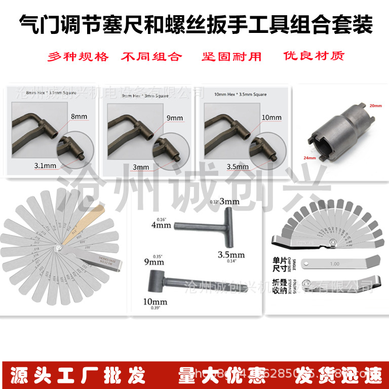 16 штук щупов для измерения зазоров (0,127–0,508 мм); 16 штук щупов для измерения зазоров на локтях (0,05–1,00 мм); 15 штук щупов для измерения зазоров (0,2–4,2 мм); 32 листа латуни (0,04–0,88 мм); 32 штуки без латунного листа (0,02–1,0 мм); 16 штук локтей и 32 штуки комбинации (0,05–1,0 мм); 16-секционный изгиб и 32-секционный комбинированный набор (0,127–0,508 мм); Комбинация из 32 предметов и L-образный гаечный ключ; Комбинация гаечных ключей Т-типа на 16 и 32 предмета.