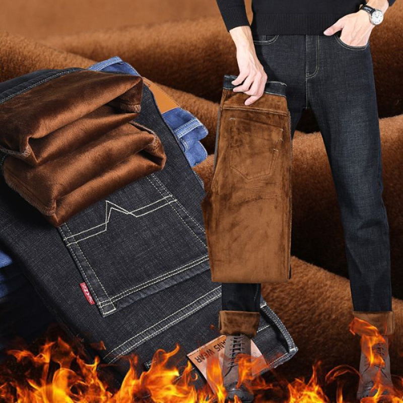 Трансграничная осень и зима новые эластичные джинсовые брюки молодые мужчины деловая стройность толстые прямые мужские теплые