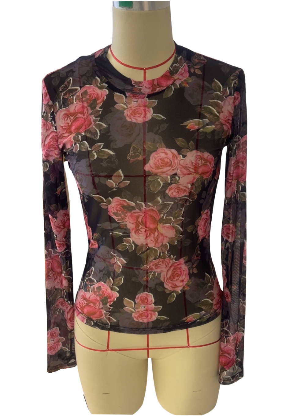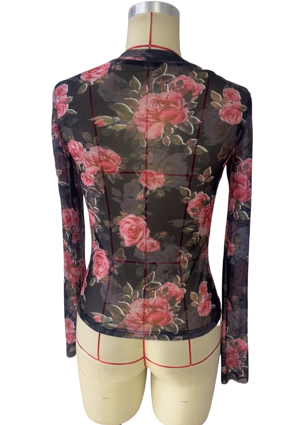 Европейские и американские трансграничные осенне-зимние новые элегантные облегающие топы с маленьким воротником-стойкой и сетчатым принтом в виде роз для женщин