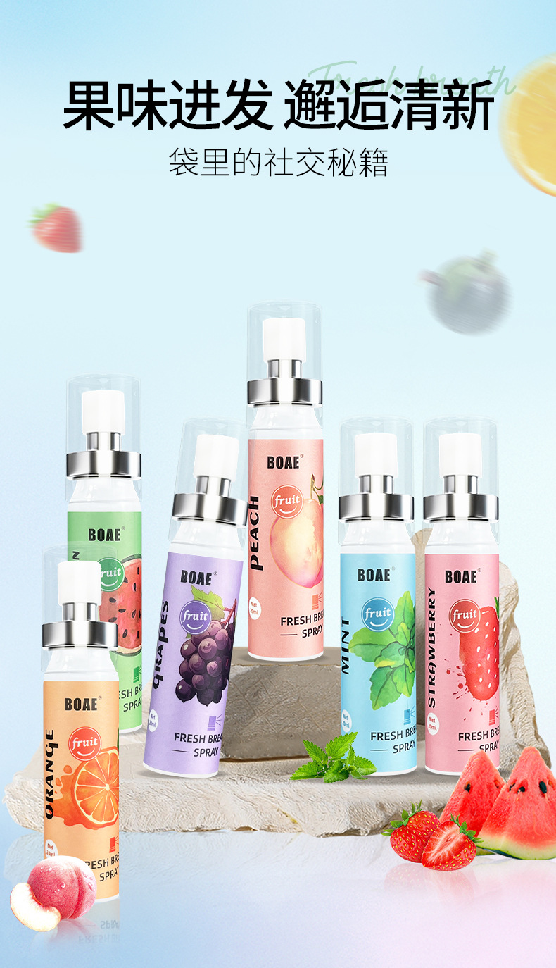 Фруктовый спрей для полости рта (клубничный вкус) английская версия; Оральный спрей со вкусом фруктов (аромат арбуза) английская версия; Фруктовый спрей для полости рта (вкус белого персика) английская версия; Фруктовый спрей для полости рта (апельсиновый вкус) английская версия; Оральный спрей со вкусом фруктов (виноградный вкус) английская версия; Фруктовый спрей для полости рта (мятный вкус) английская версия